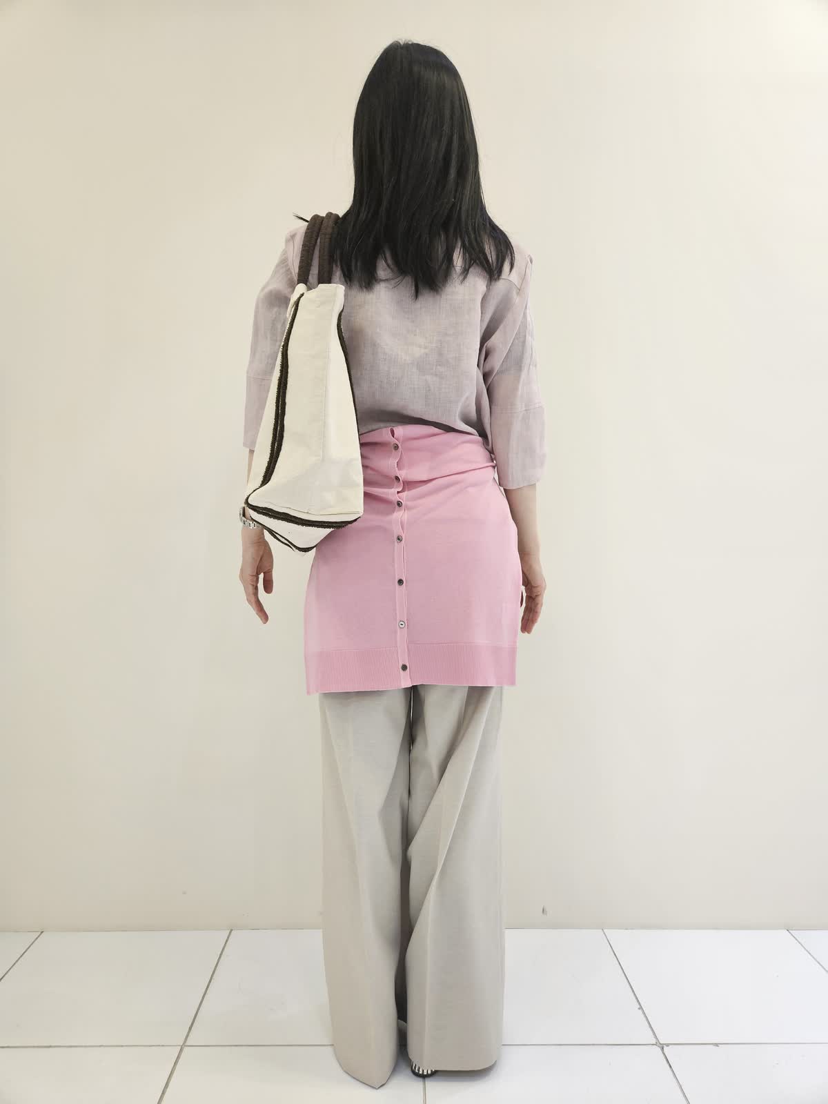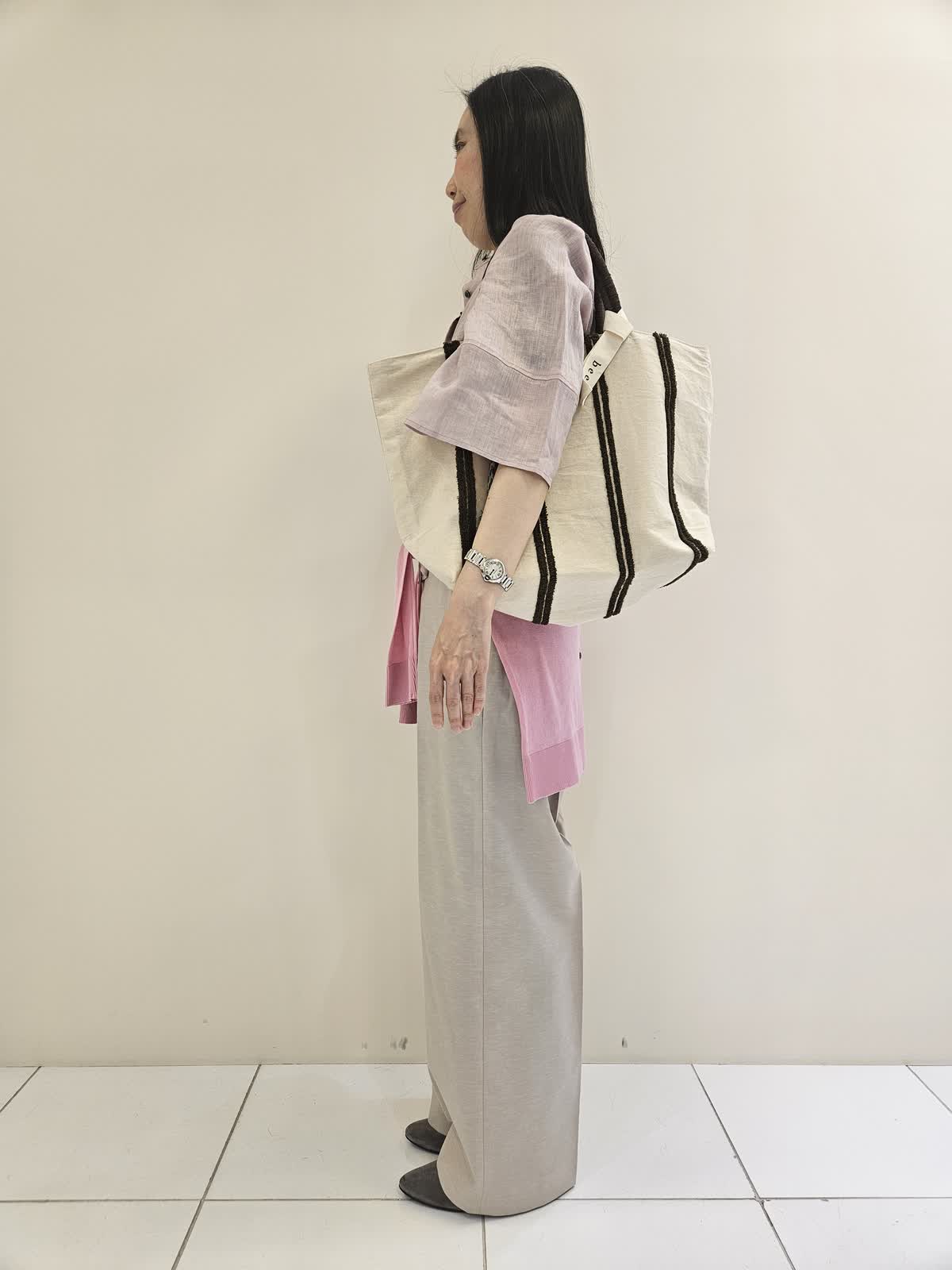 【着用サイズ・カラー】ブラウス:ピンク9号・カーディガン:ピンク9号 ・パンツ:ベージュ 7号・バッグ:オフホワイト フリー リネンシャツはさらっとしていて暑い時期に一枚で着る時に◎ カーディガンはピンク色がポイントで羽織りとしても肩かけや腰巻きのアクセントもお勧めです。パンツは動きやすく、お仕事にもお勧めできちんと感があります。バッグは沢山の量が入り母の日のプレゼントにもお勧めです。
