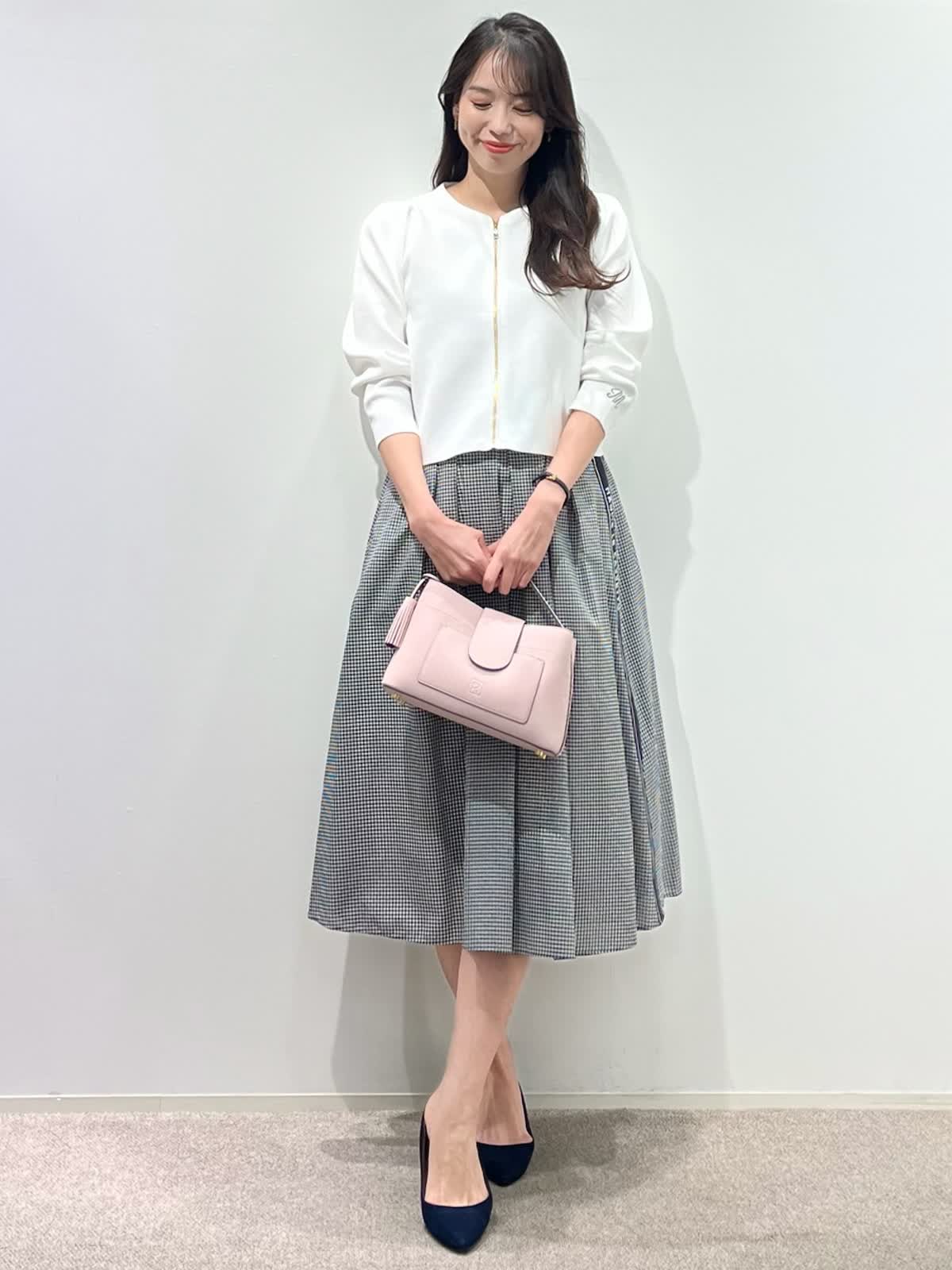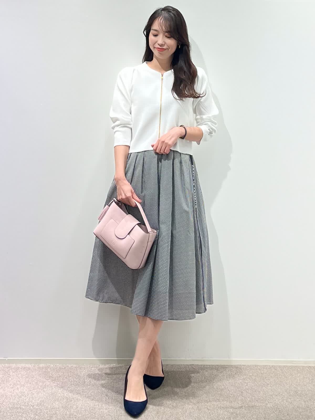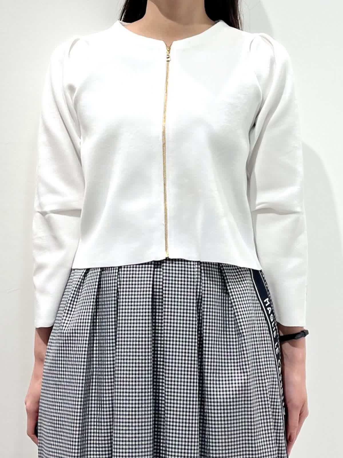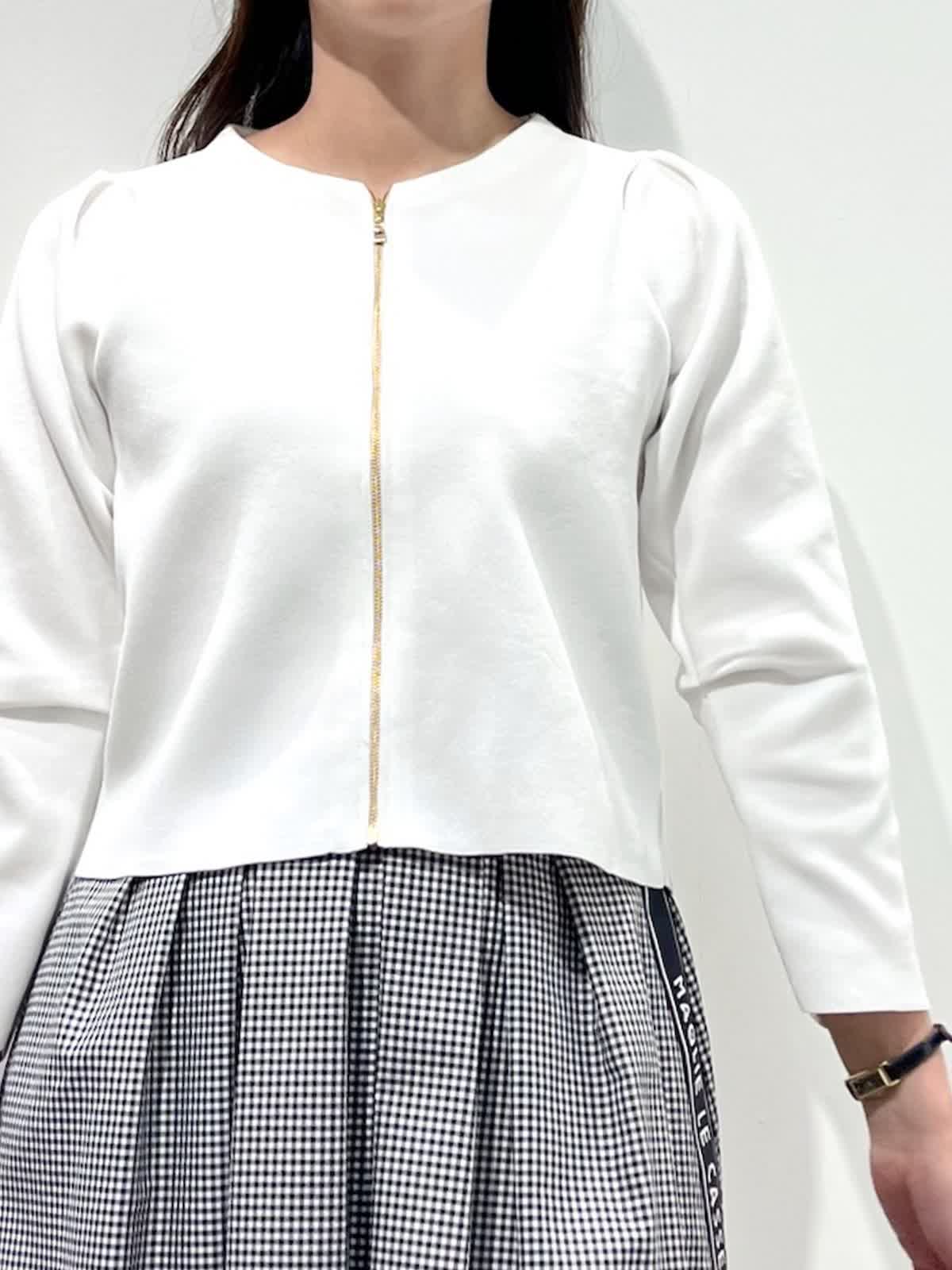 【着用サイズ】カーディガン:9号 スカート:9号 【着用カラー】カーディガン:オフホワイト スカート:格子 バッグ:ピンク 「お出かけフェミニンコーデ」 コンパクトなジップカーディガンは、ハリのある素材感できちんと感と着心地の良さの両立が叶うデザイン。袖口のロゴポイントや、肩回りのタックなど、ディテールが可愛く、1枚着としても万能で、羽織りアイテムとしても重宝します。ホワイトカラーにメタルファスナーのアクセント。タックスカートと合わせたフェミニンな装いに。気温差のある季節に活躍するおすすめカーディガンです。