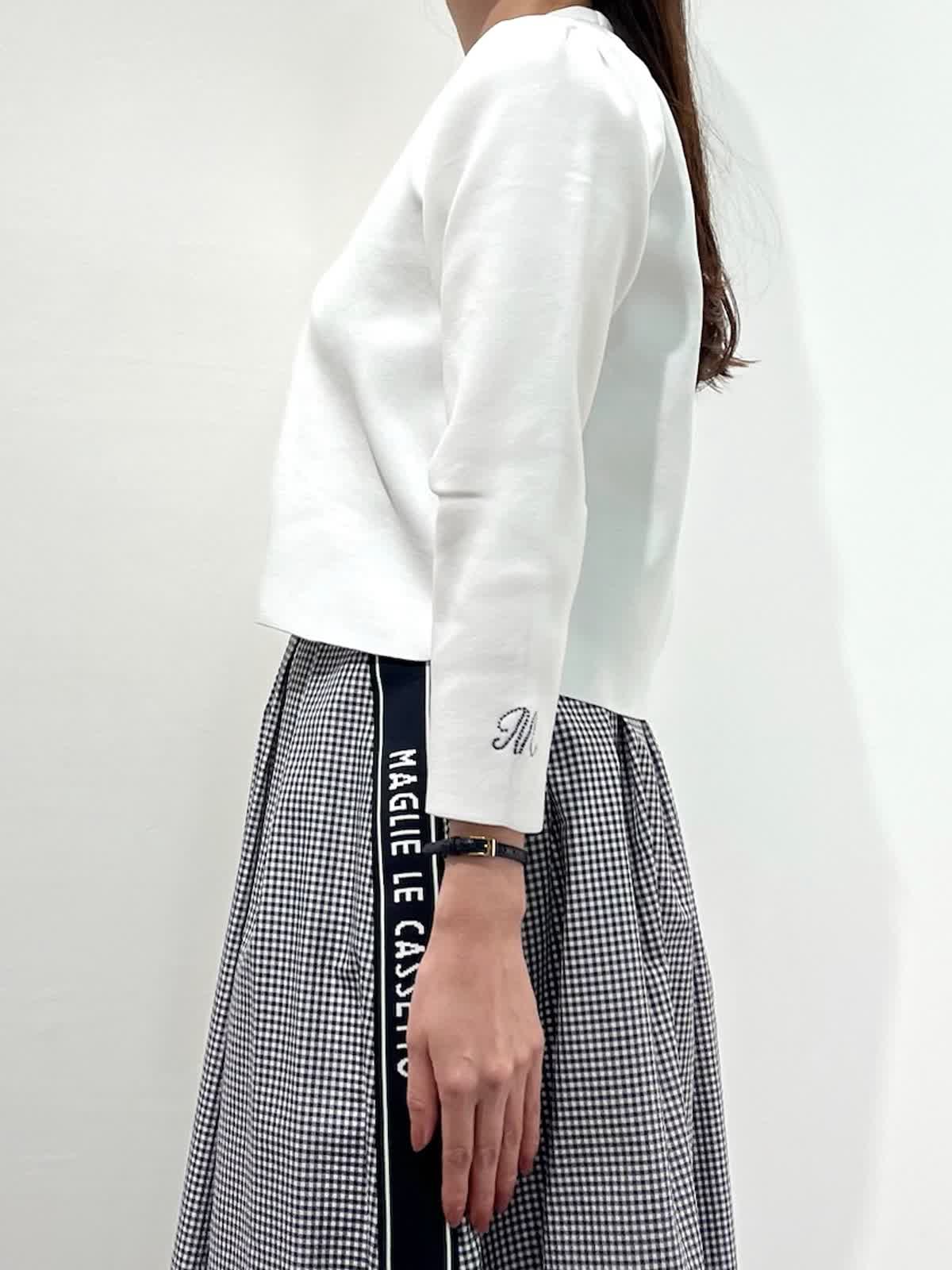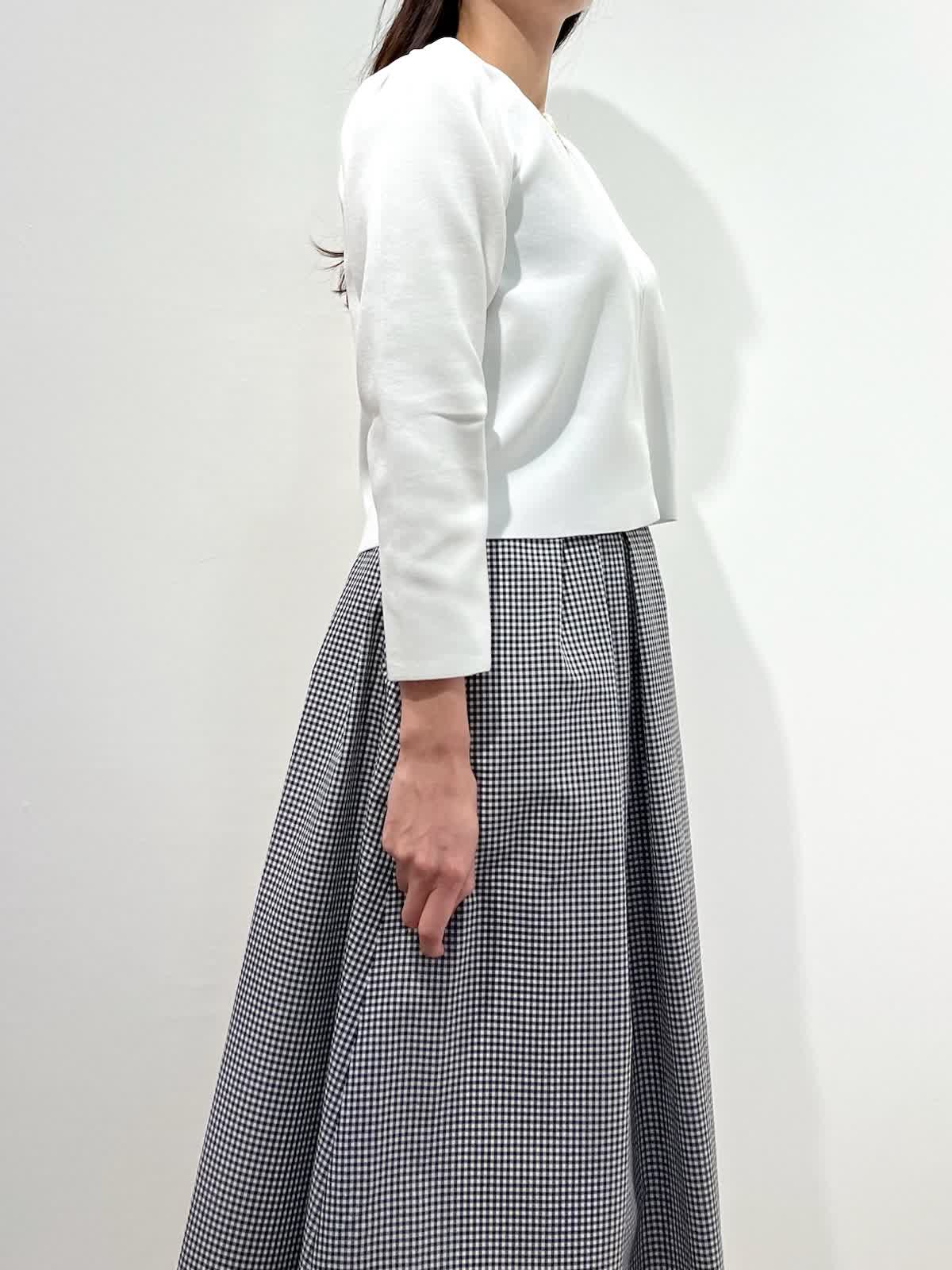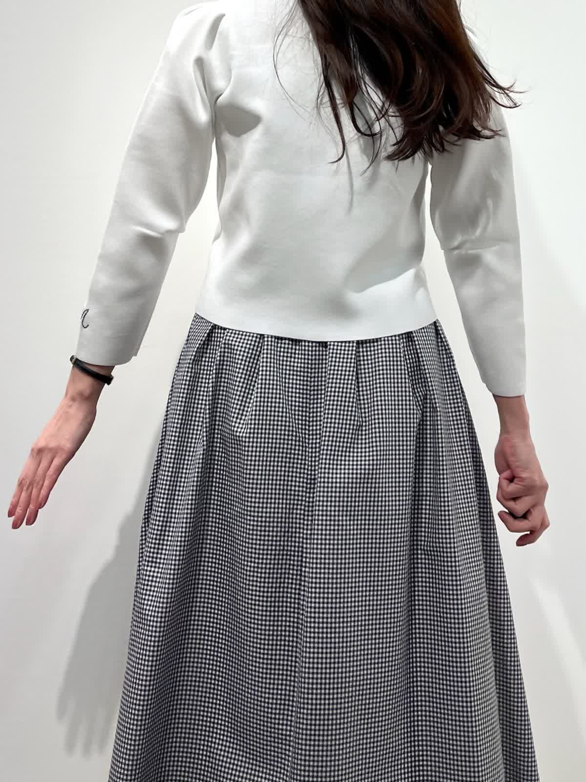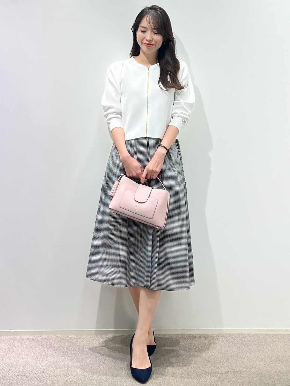 【着用サイズ】カーディガン:9号 スカート:9号 【着用カラー】カーディガン:オフホワイト スカート:格子 バッグ:ピンク 「お出かけフェミニンコーデ」 コンパクトなジップカーディガンは、ハリのある素材感できちんと感と着心地の良さの両立が叶うデザイン。袖口のロゴポイントや、肩回りのタックなど、ディテールが可愛く、1枚着としても万能で、羽織りアイテムとしても重宝します。ホワイトカラーにメタルファスナーのアクセント。タックスカートと合わせたフェミニンな装いに。気温差のある季節に活躍するおすすめカーディガンです。