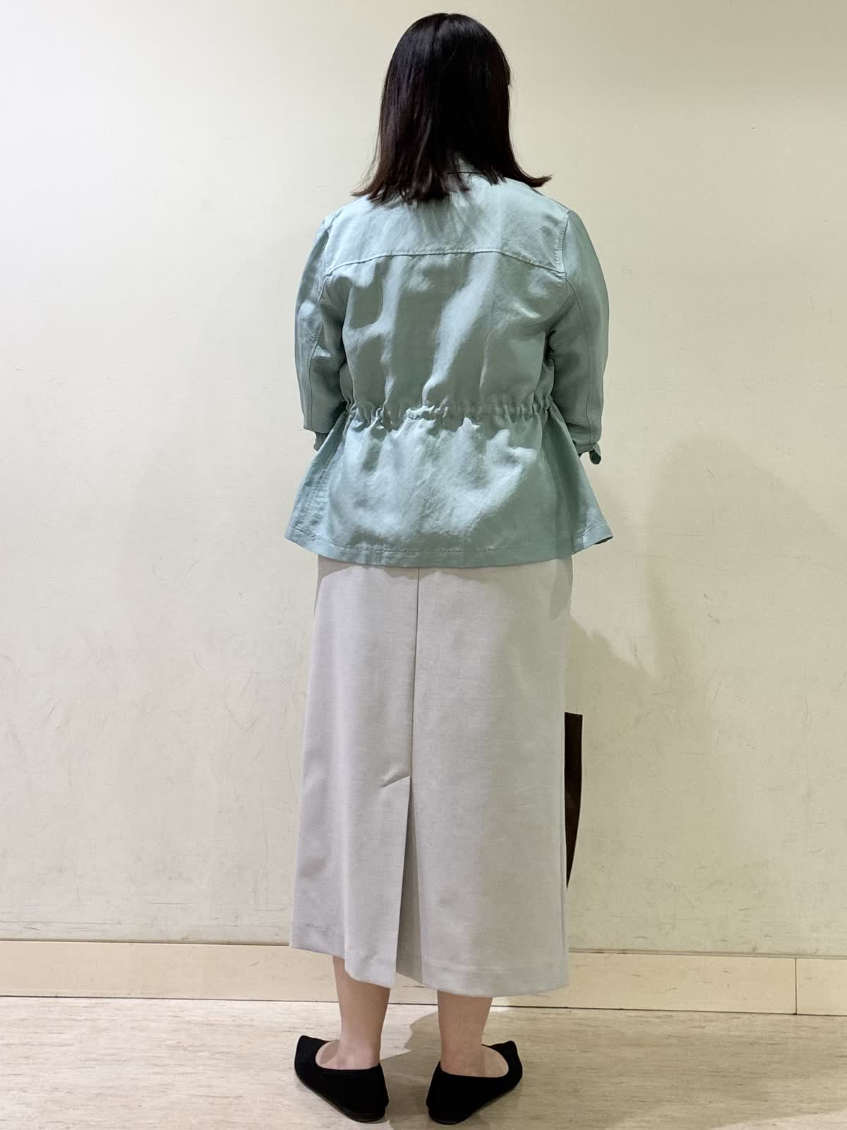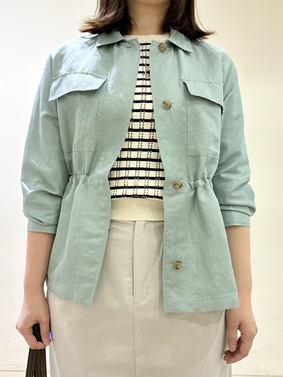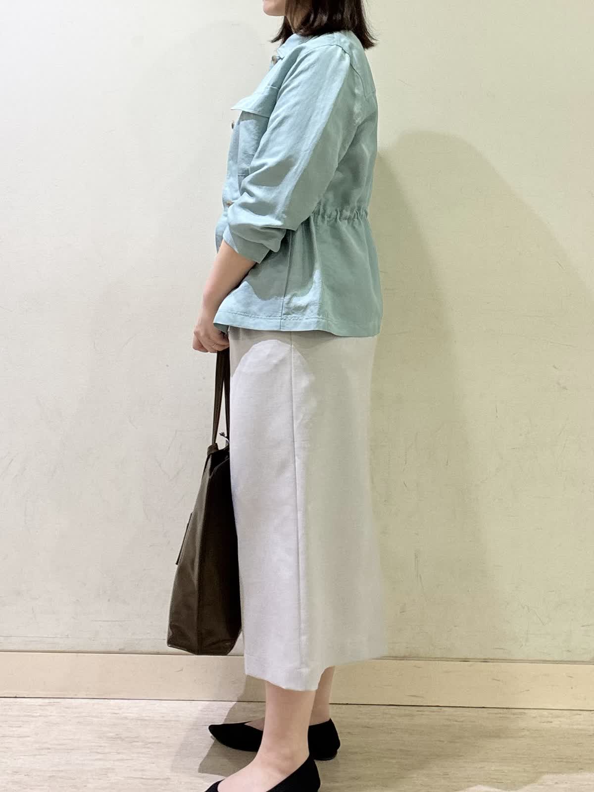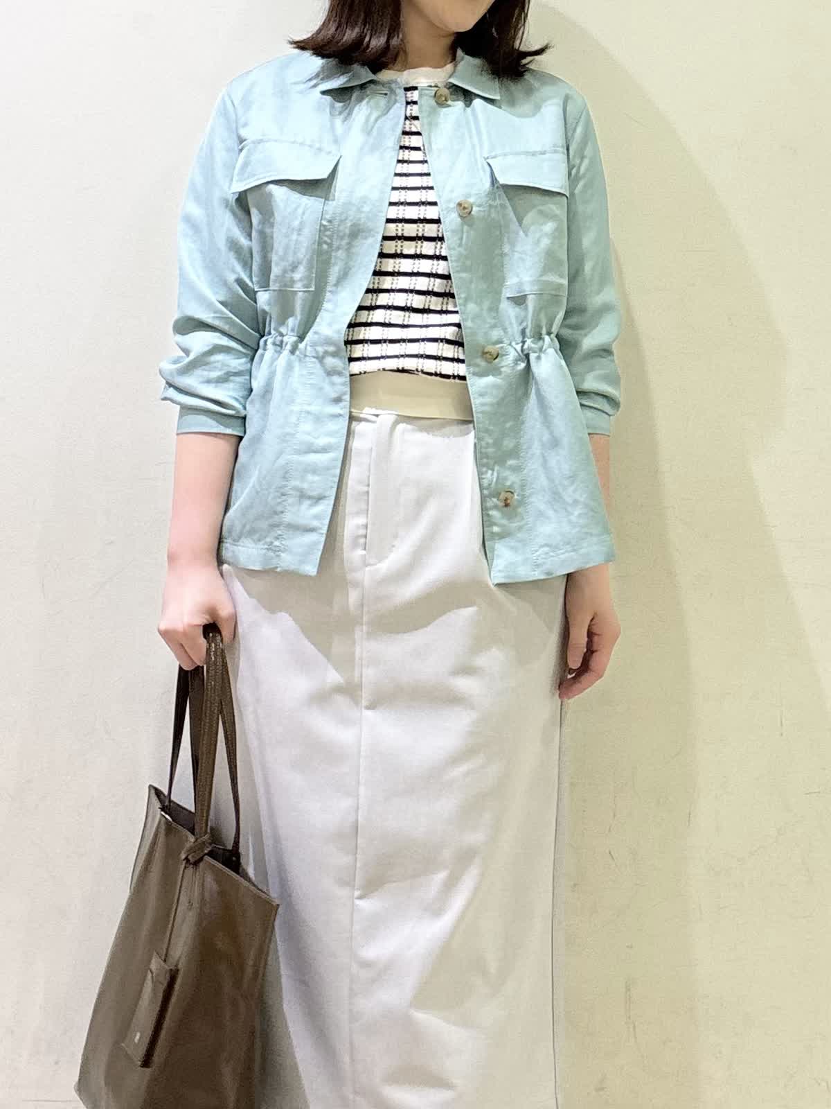 【着用カラー/サイズ】ジャケット:ペパーミント/9号 セーター:ボーダー/フリー スカート:グレー/11号 初夏の通勤コーデ。麻混ジャケットは、朝晩冷えるこの時期、サラッとした着用感で重宝します。カチッとしすぎないように透かし柄のボーダーをインナーに。