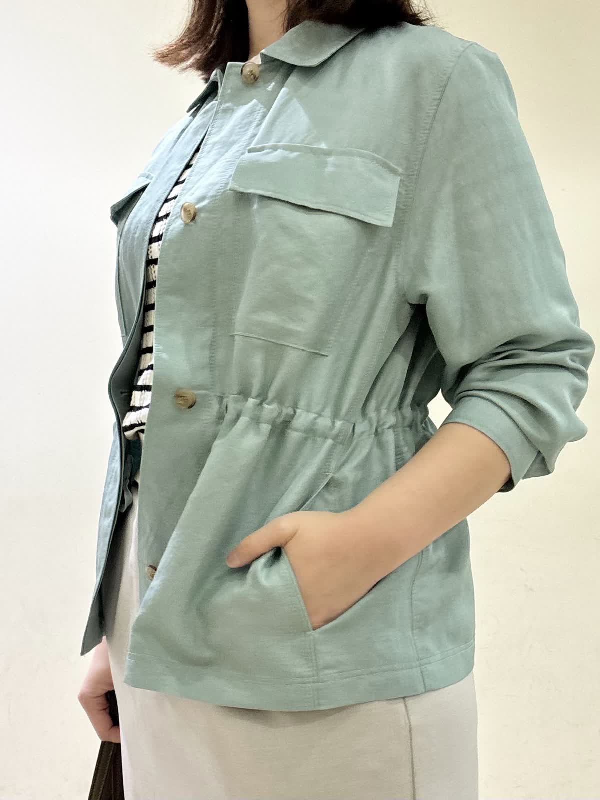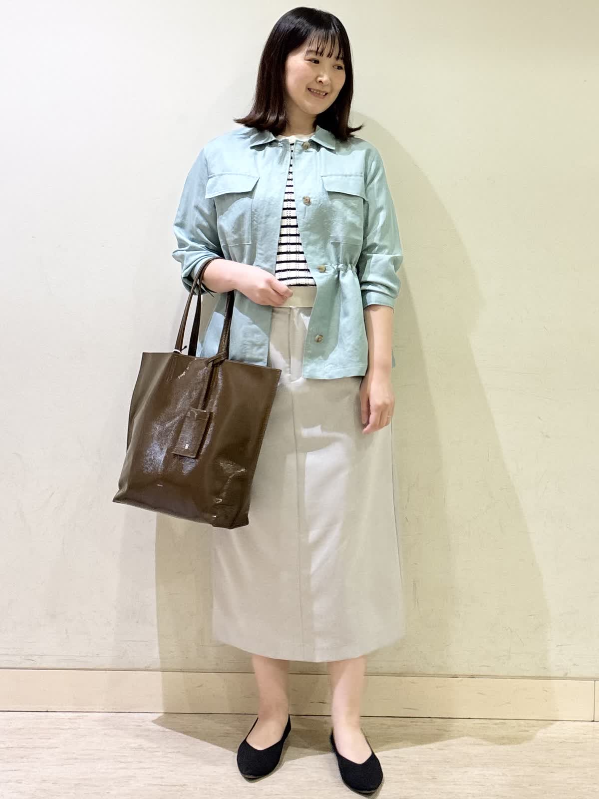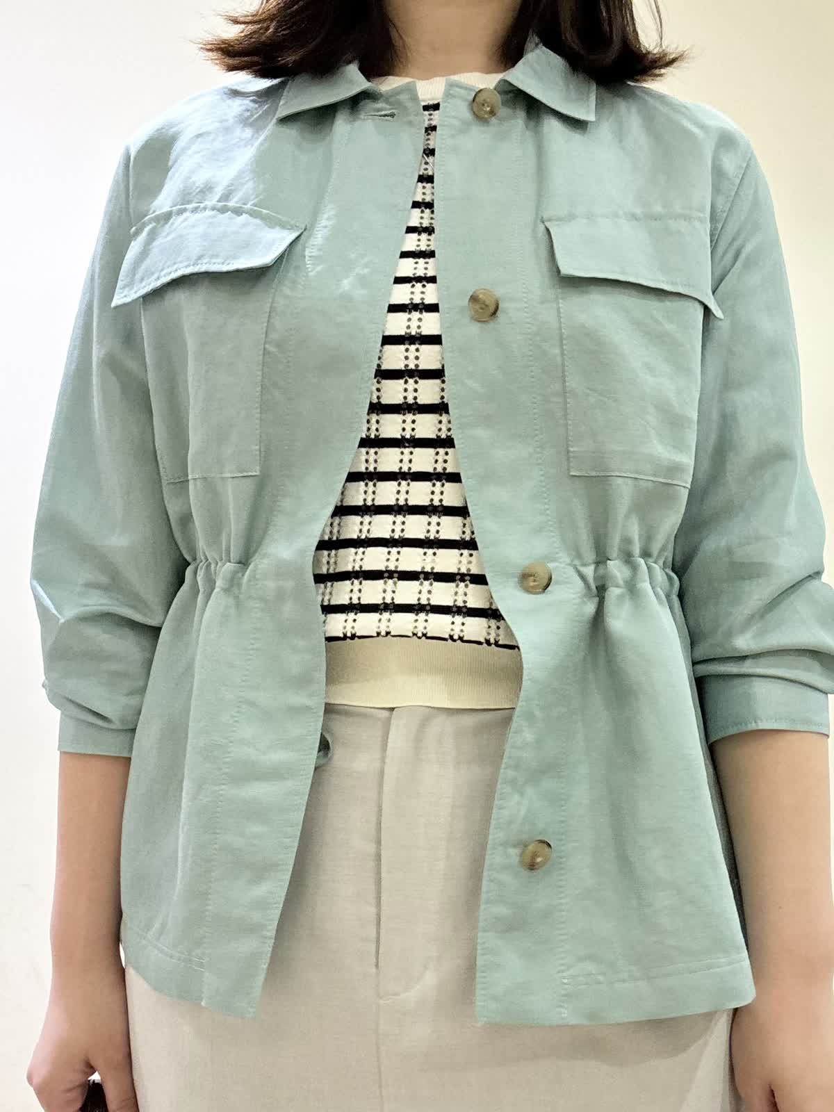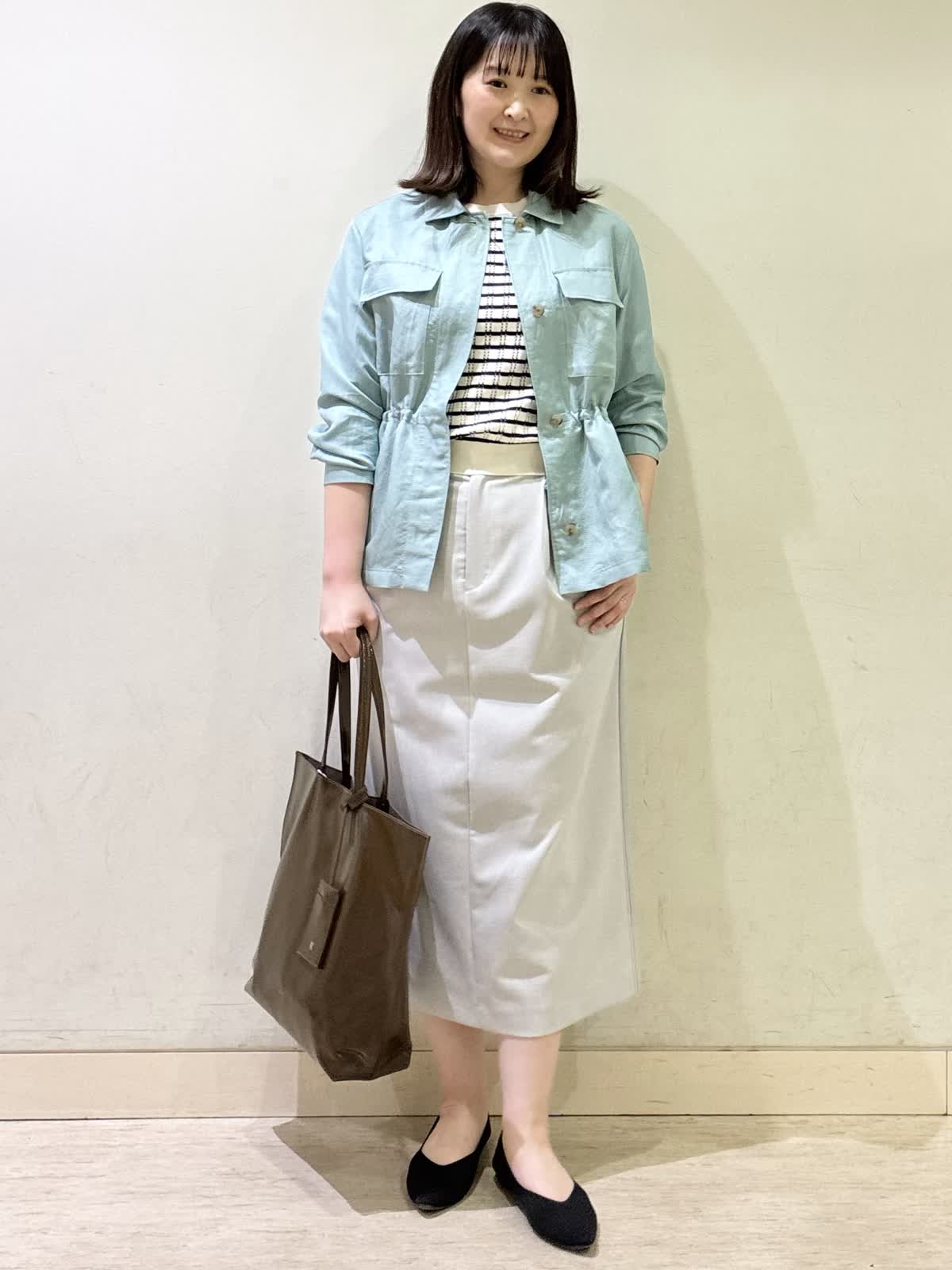 【着用カラー/サイズ】ジャケット:ペパーミント/9号 セーター:ボーダー/フリー スカート:グレー/11号 初夏の通勤コーデ。麻混ジャケットは、朝晩冷えるこの時期、サラッとした着用感で重宝します。カチッとしすぎないように透かし柄のボーダーをインナーに。