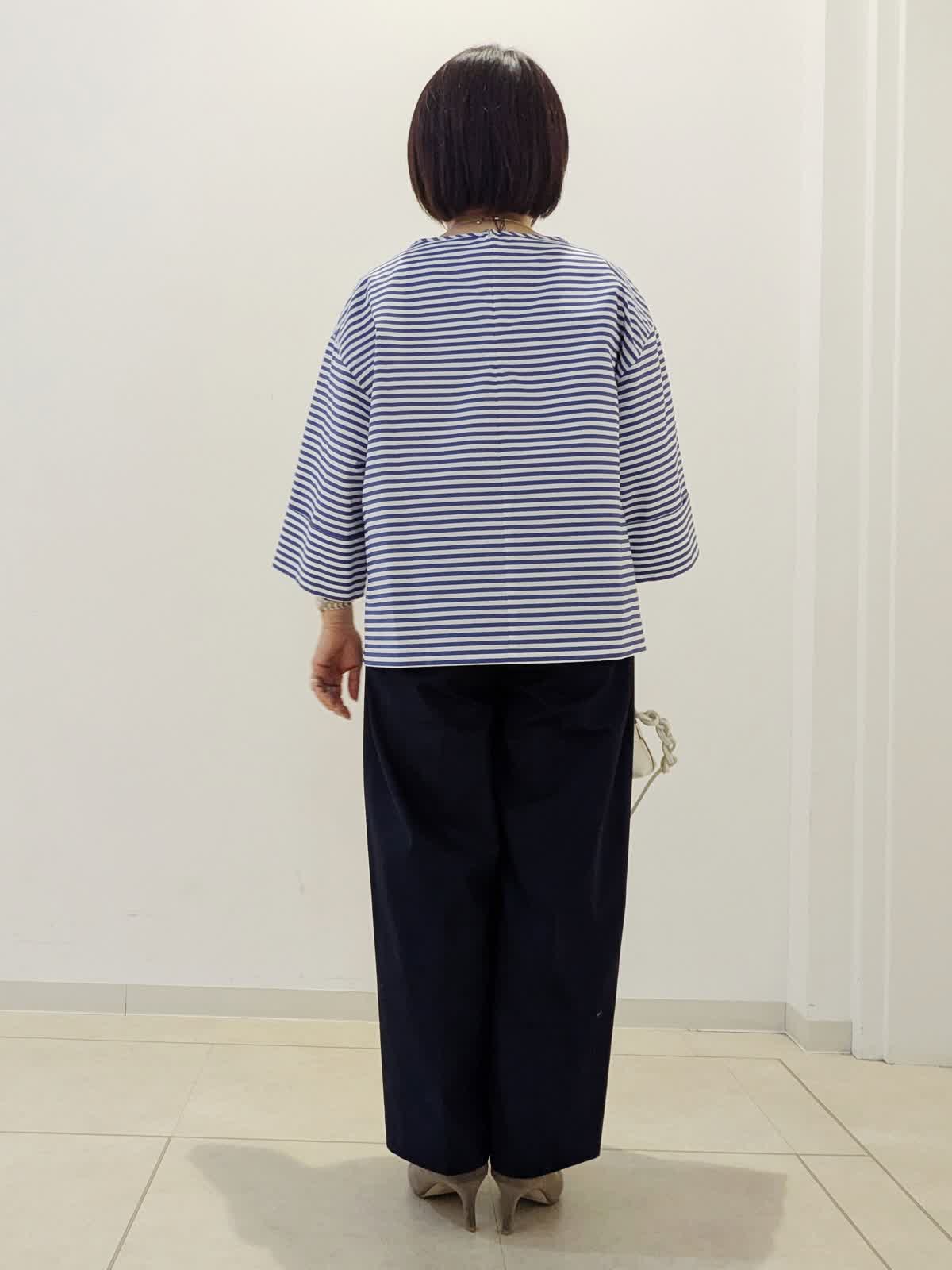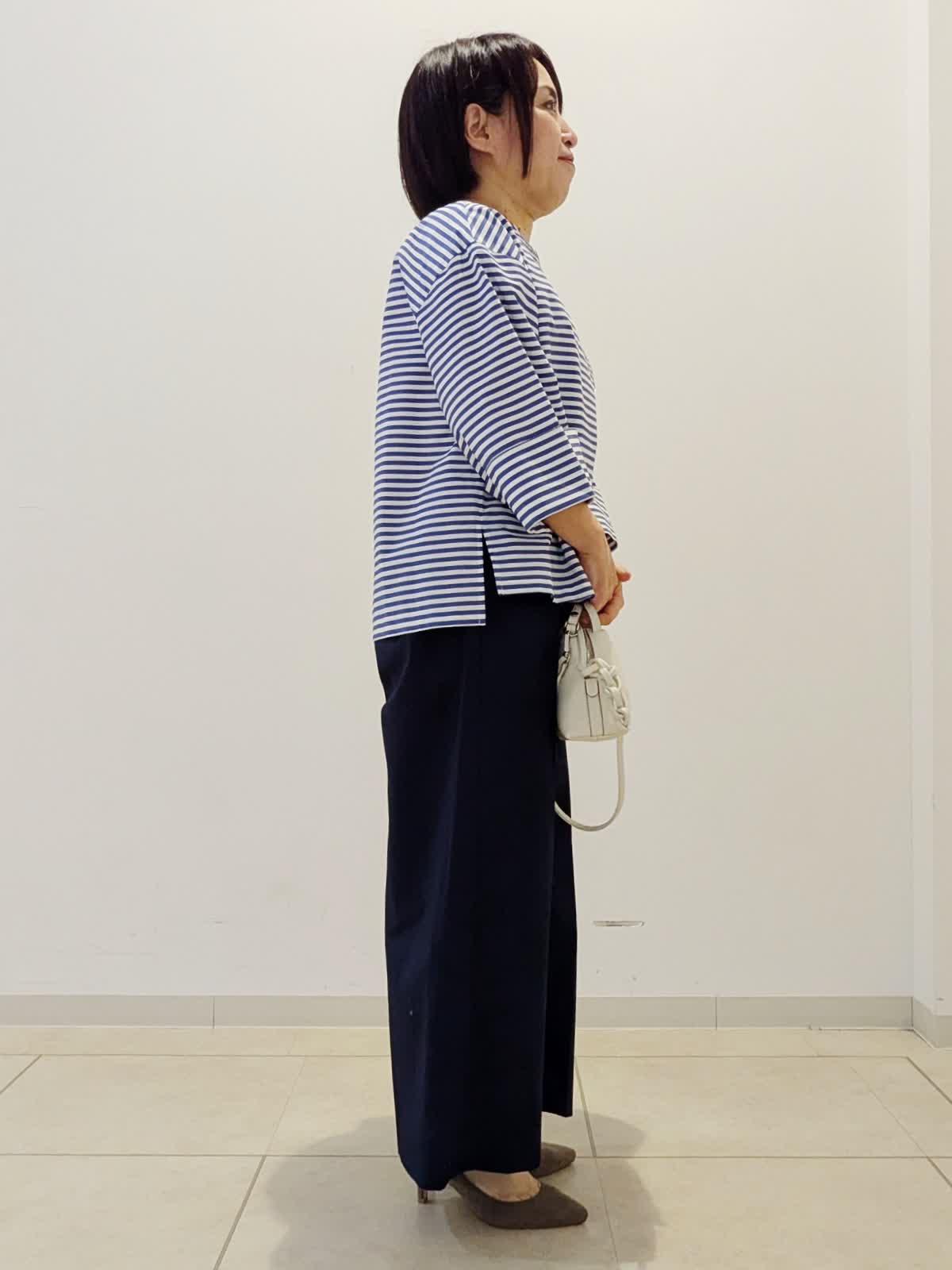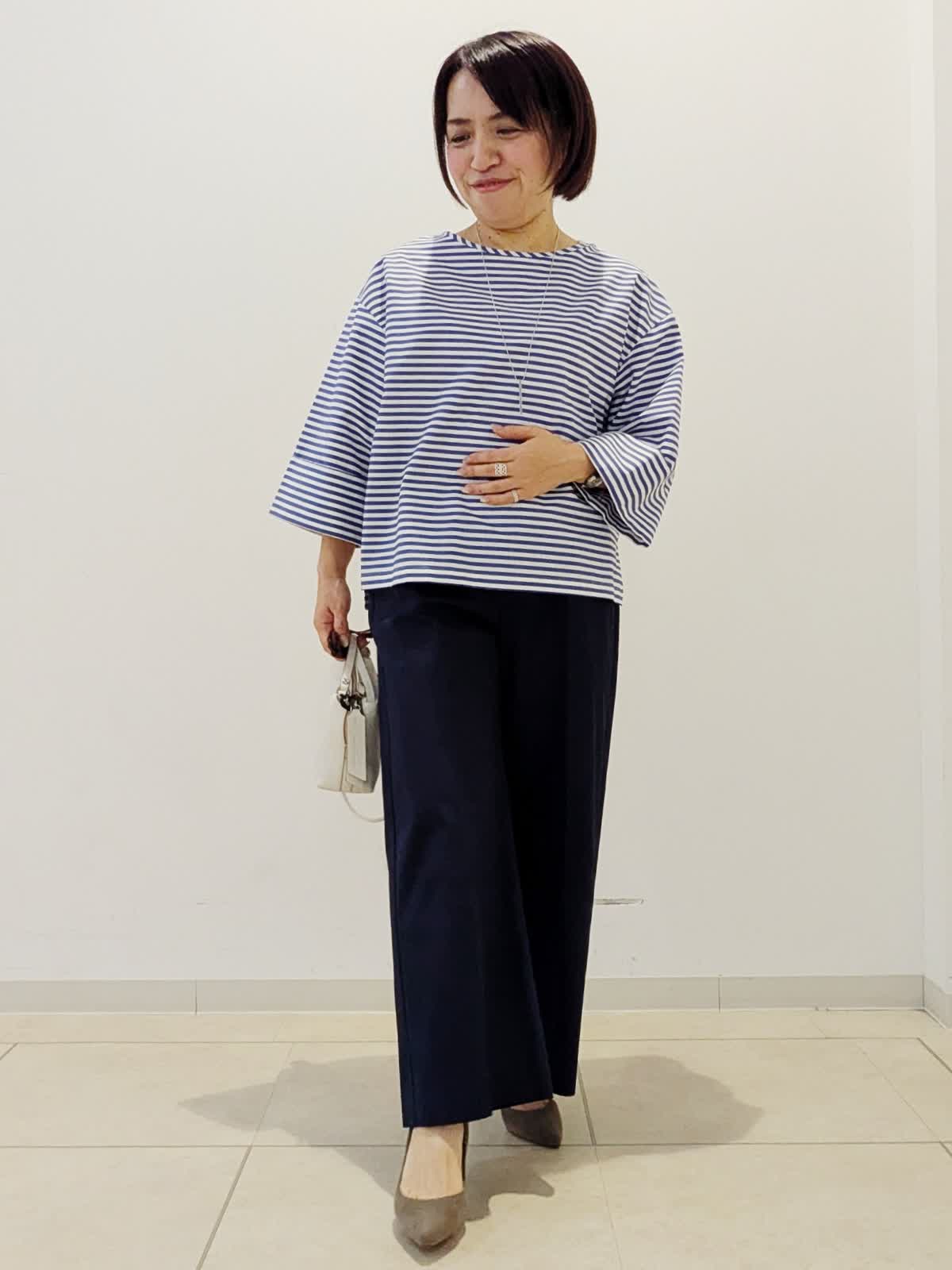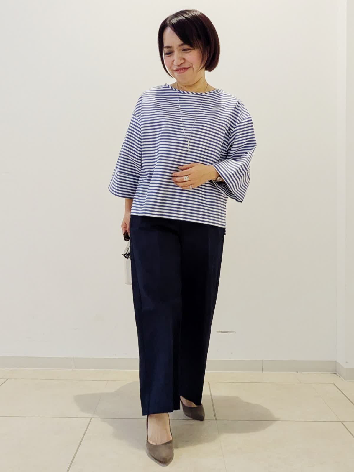 【着用サイズ】ブラウス:フリー パンツ:9号【着用カラー】ブラウス:ブルー パンツ:ネイビー GWお出かけコーデです。 トップスはボーダー柄が夏らしいTブラウス。綿素材なので通気性もよく、気温が上がっても快適にお使いいただけます。