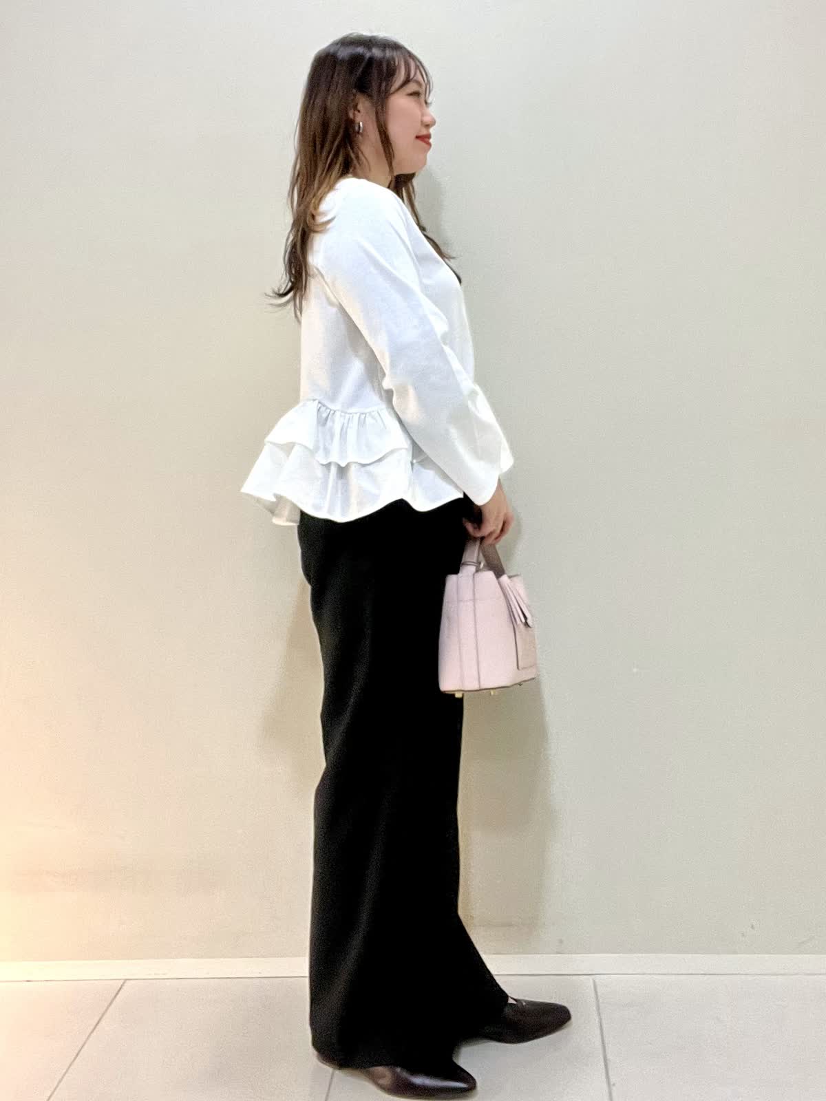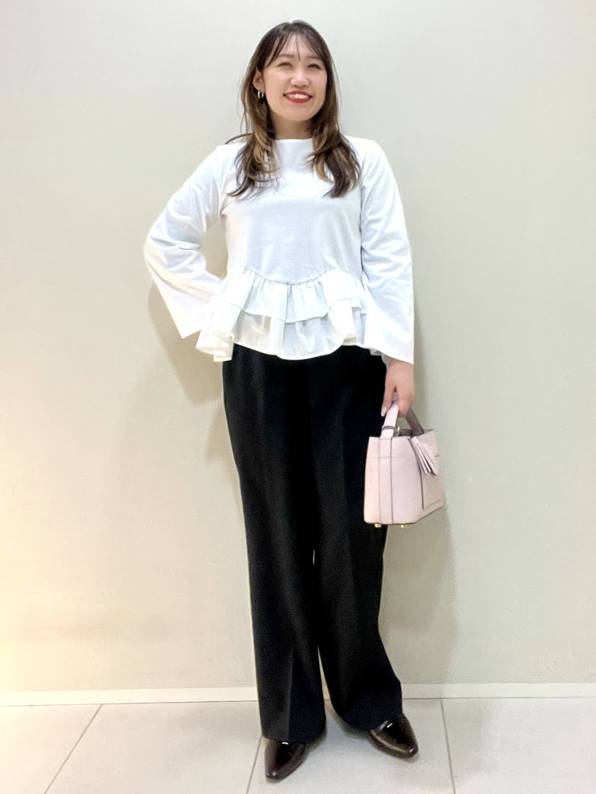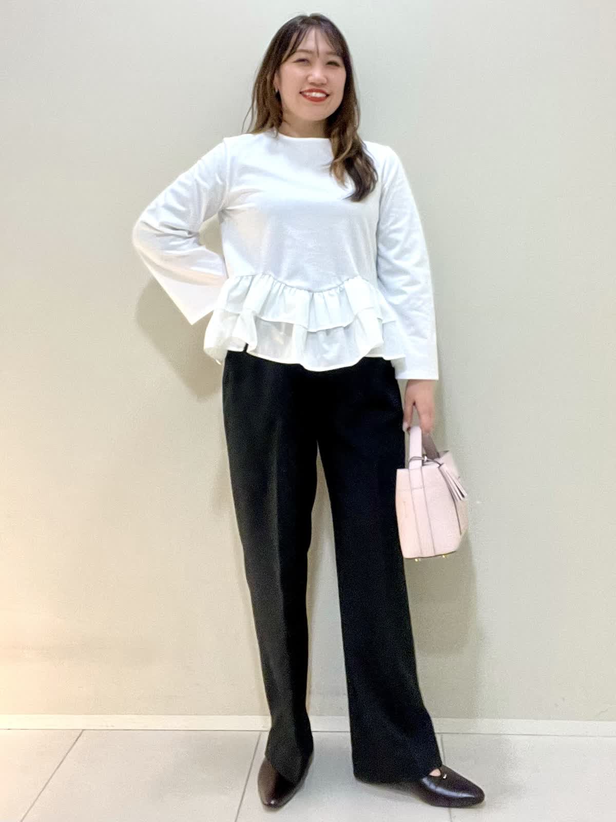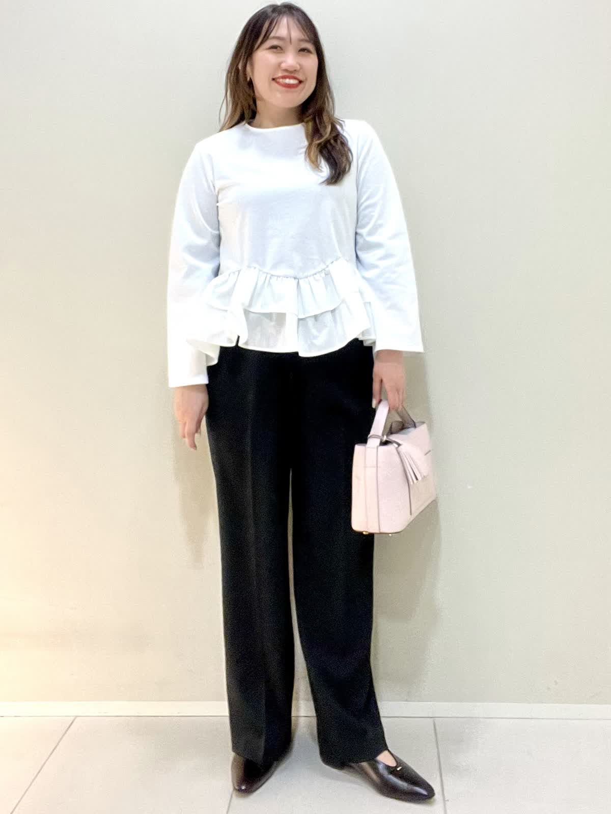 【着用サイズ】カットソー:フリー パンツ:M 【着用カラー】カットソー:オフホワイト パンツ:ブラック バッグ:ピンク お出かけコーデ。コラボSTORYのデザインカットソー。立体的な裾で着るだけで華やかです。ストレッチが効いていて着やすいです。パンツはウエスト総ゴムの綺麗めパンツ。丈が長めなので、ヒールの方が安心して履けそうです。(身長158cm/Mサイズ着用) カットソー×パンツでとてもシンプルですが、それぞれにデザインがあり着るだけでお洒落なアイテムです。