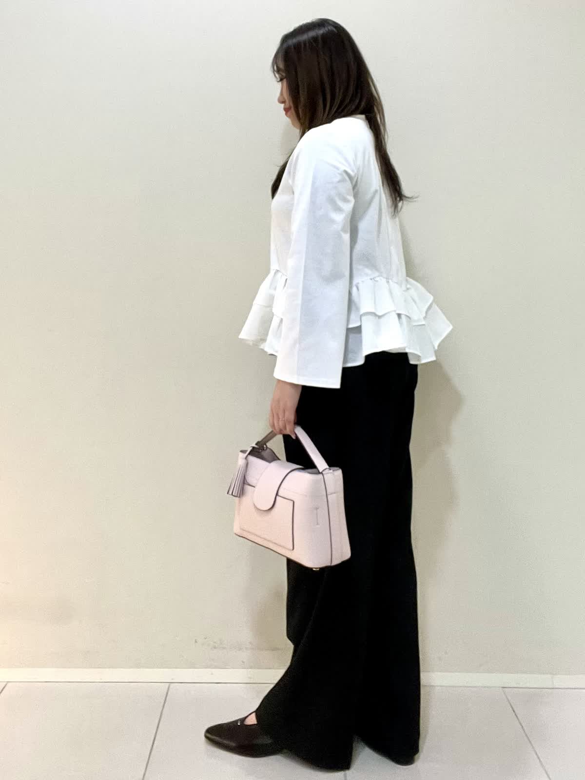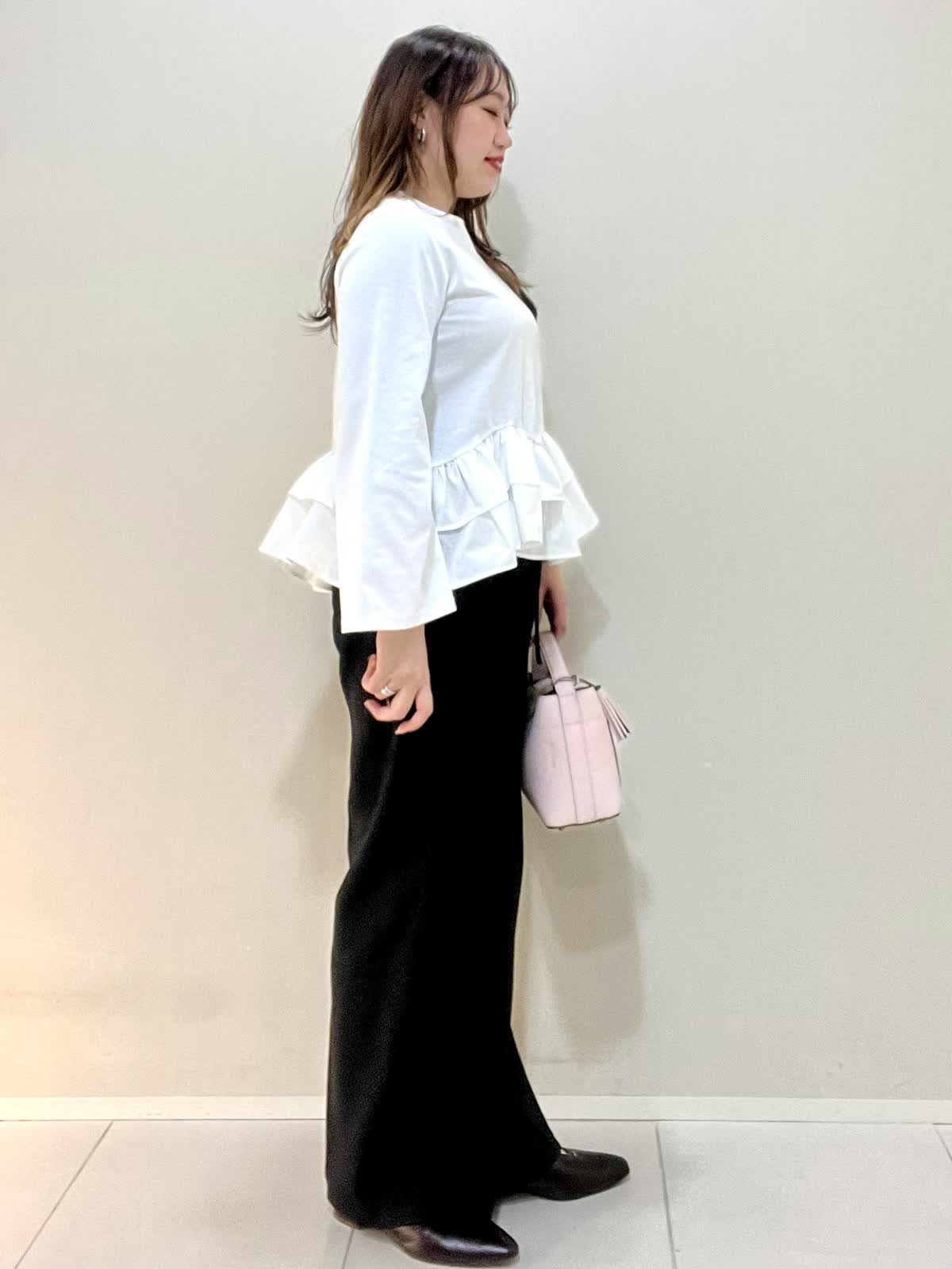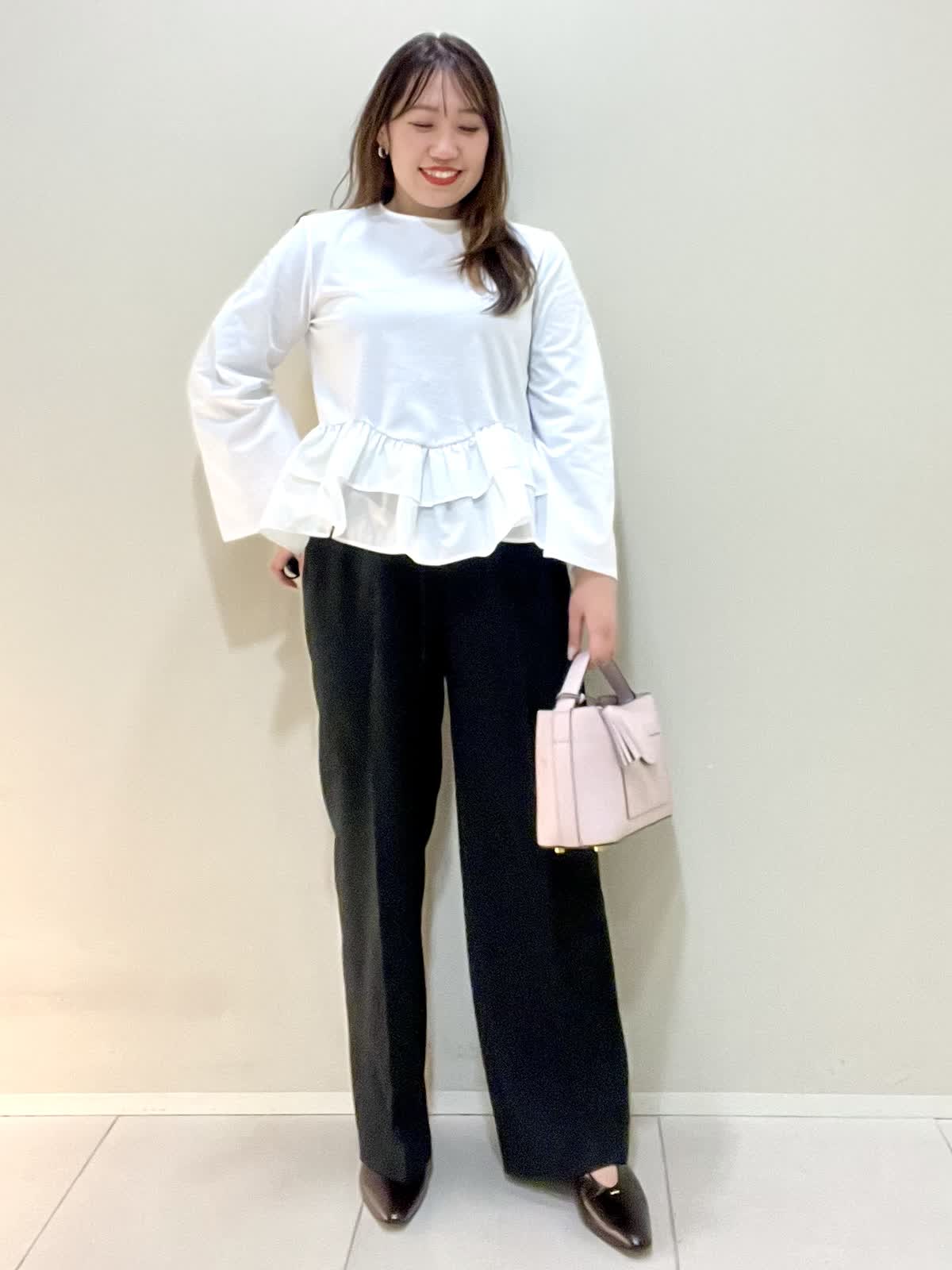 【着用サイズ】カットソー:フリー パンツ:M 【着用カラー】カットソー:オフホワイト パンツ:ブラック バッグ:ピンク お出かけコーデ。コラボSTORYのデザインカットソー。立体的な裾で着るだけで華やかです。ストレッチが効いていて着やすいです。パンツはウエスト総ゴムの綺麗めパンツ。丈が長めなので、ヒールの方が安心して履けそうです。(身長158cm/Mサイズ着用) カットソー×パンツでとてもシンプルですが、それぞれにデザインがあり着るだけでお洒落なアイテムです。