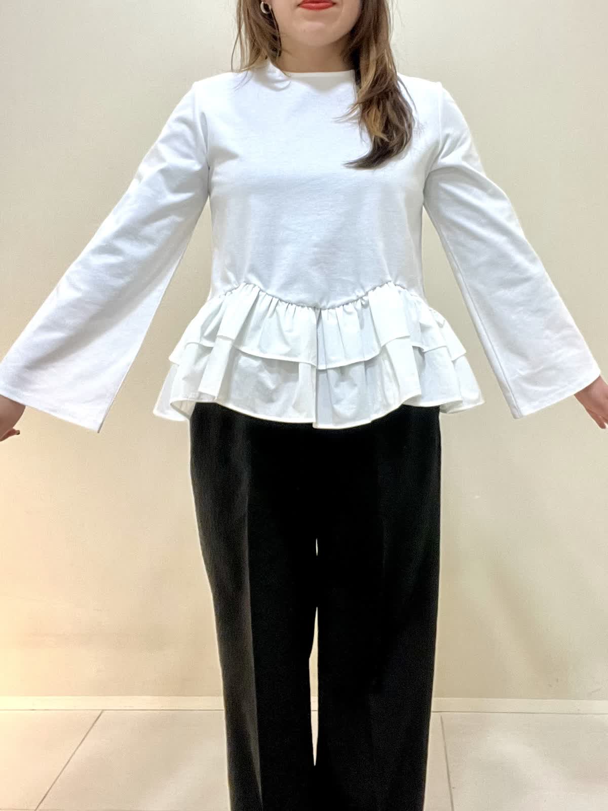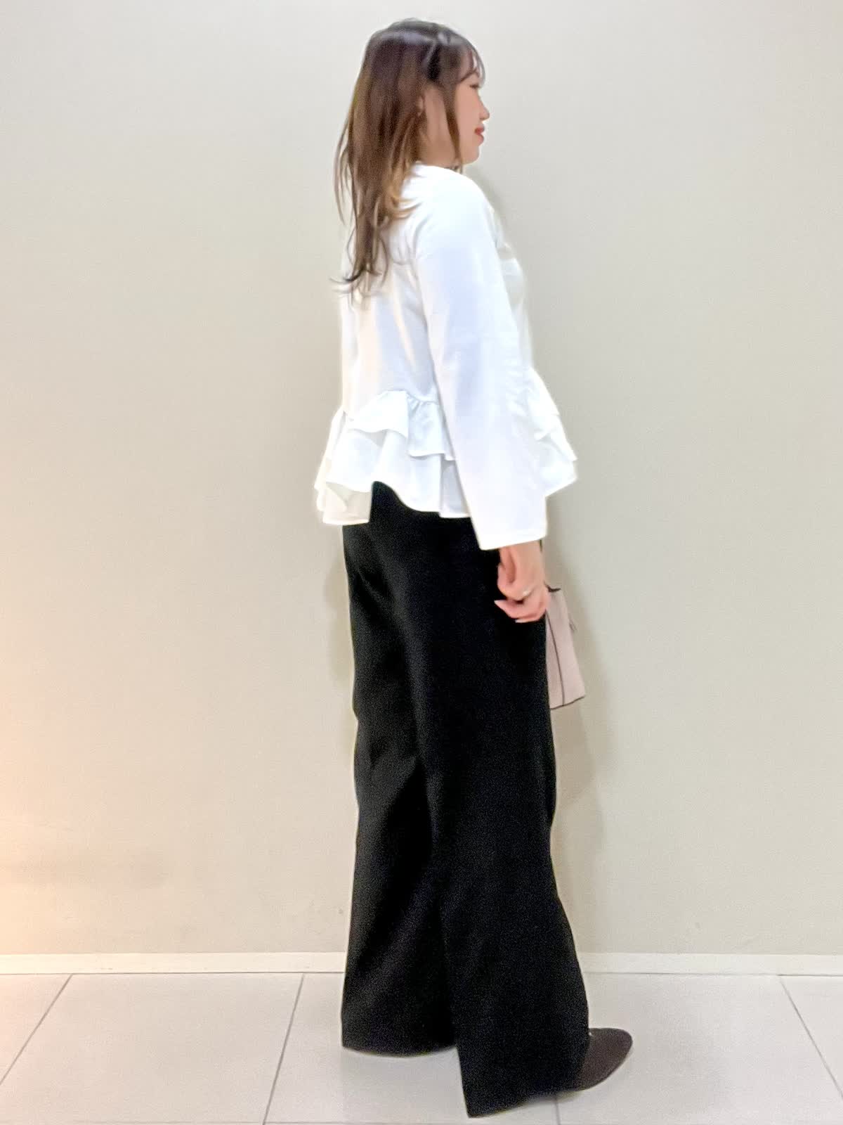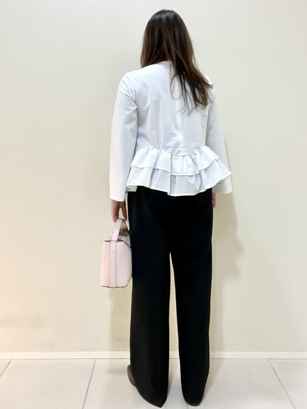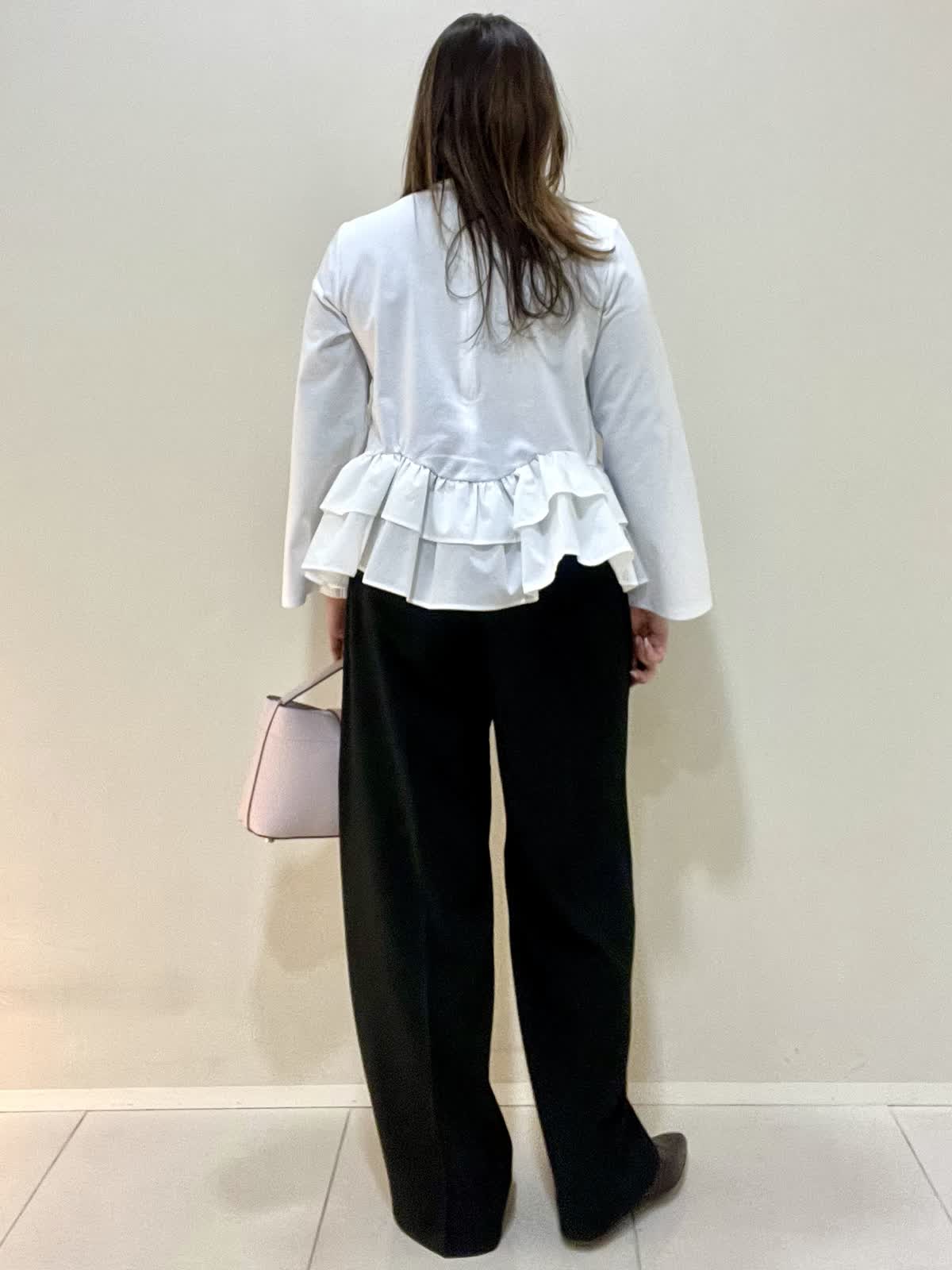 【着用サイズ】カットソー:フリー パンツ:M 【着用カラー】カットソー:オフホワイト パンツ:ブラック バッグ:ピンク お出かけコーデ。コラボSTORYのデザインカットソー。立体的な裾で着るだけで華やかです。ストレッチが効いていて着やすいです。パンツはウエスト総ゴムの綺麗めパンツ。丈が長めなので、ヒールの方が安心して履けそうです。(身長158cm/Mサイズ着用) カットソー×パンツでとてもシンプルですが、それぞれにデザインがあり着るだけでお洒落なアイテムです。