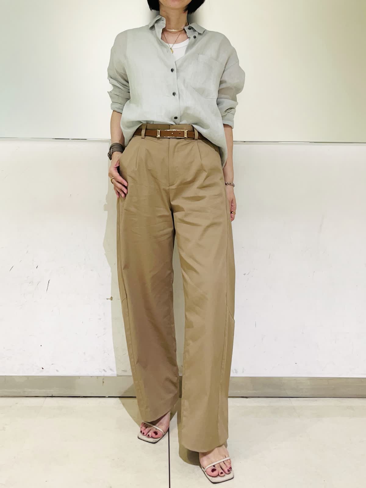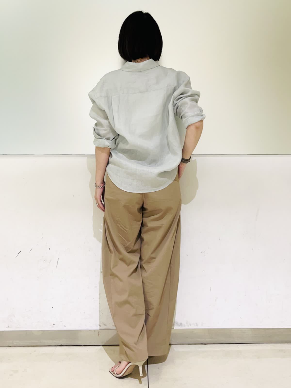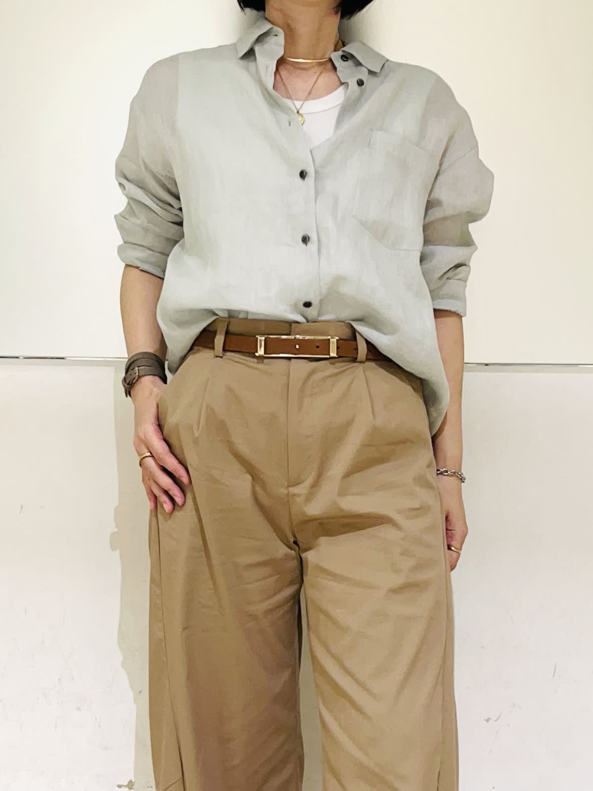 【着用アイテム】すべて9号 【着用カラー】シャツ:ペールグリーン カットソー:オフホワイト パンツ:キャメル 毎年新色が楽しみなリネンシャツ。淡く柔らかいグリーンが爽やかで大人っぽいカラー。光沢があるのでリネンでもカジュアルになり過ぎないところも嬉しいポイント。インナーに白をチラ見せすることで初夏にぴったりな清涼感のあるスタイリングになります。