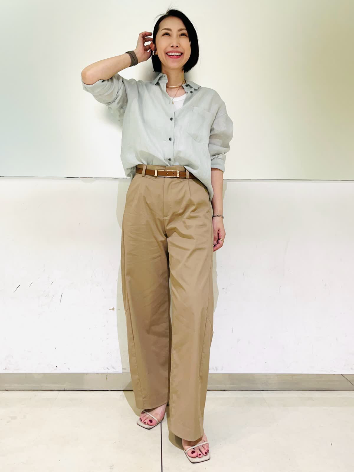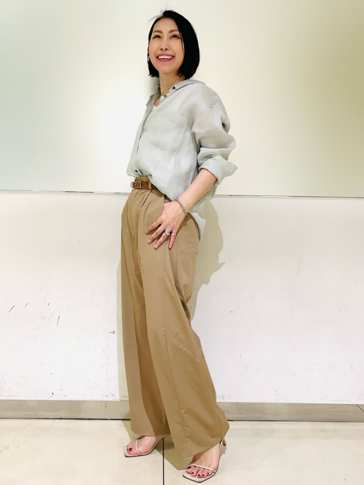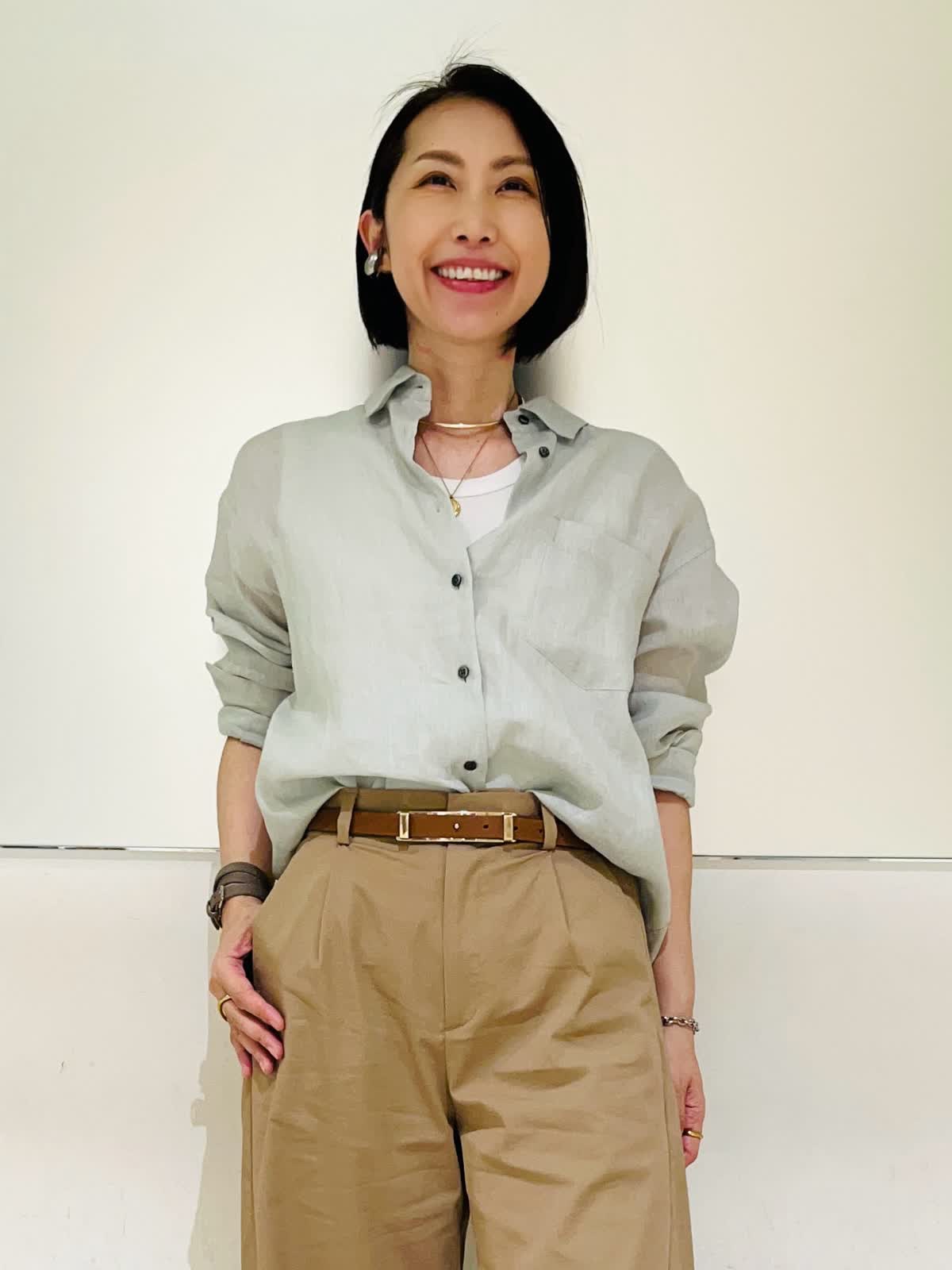 【着用アイテム】すべて9号 【着用カラー】シャツ:ペールグリーン カットソー:オフホワイト パンツ:キャメル 毎年新色が楽しみなリネンシャツ。淡く柔らかいグリーンが爽やかで大人っぽいカラー。光沢があるのでリネンでもカジュアルになり過ぎないところも嬉しいポイント。インナーに白をチラ見せすることで初夏にぴったりな清涼感のあるスタイリングになります。