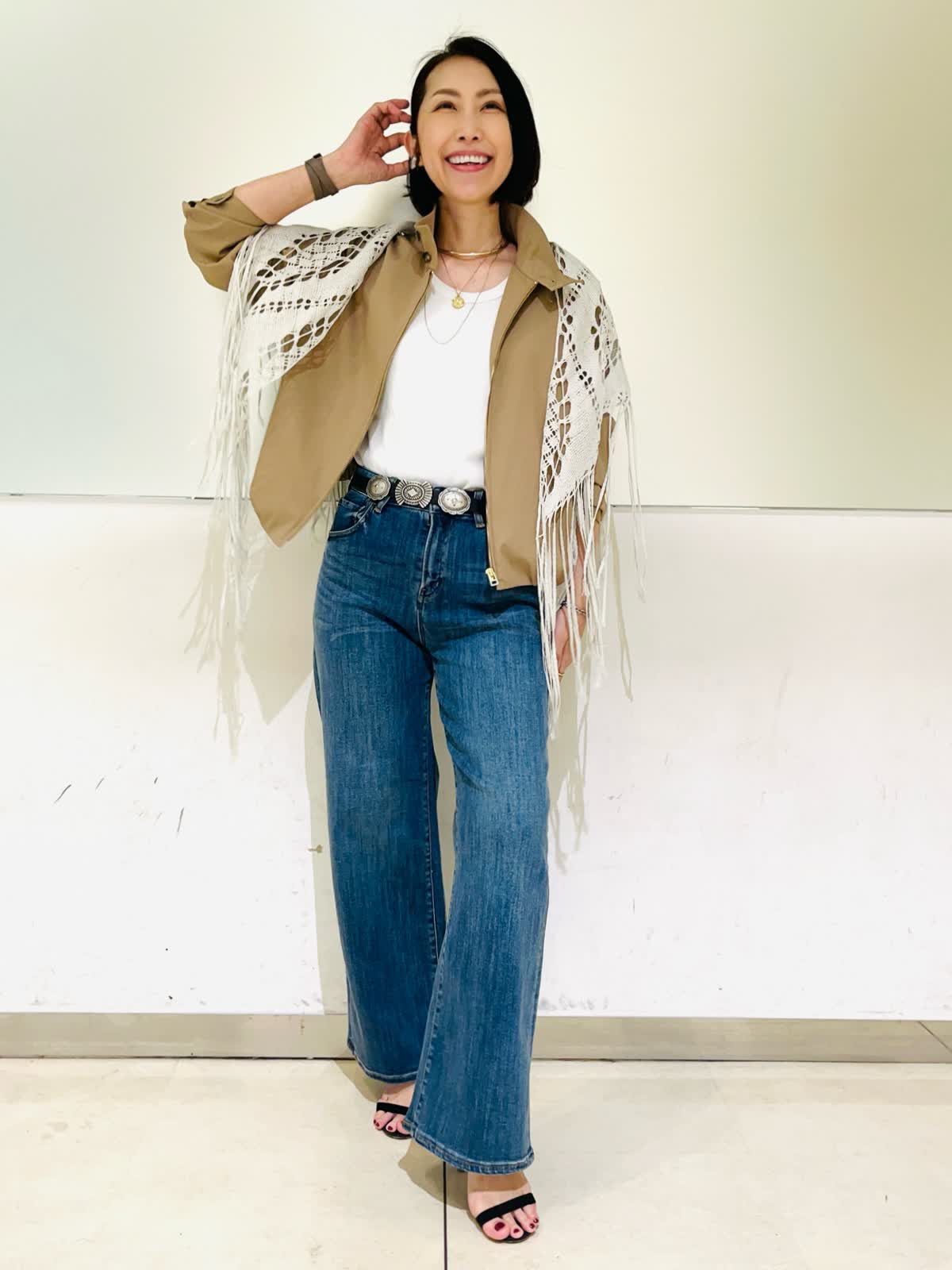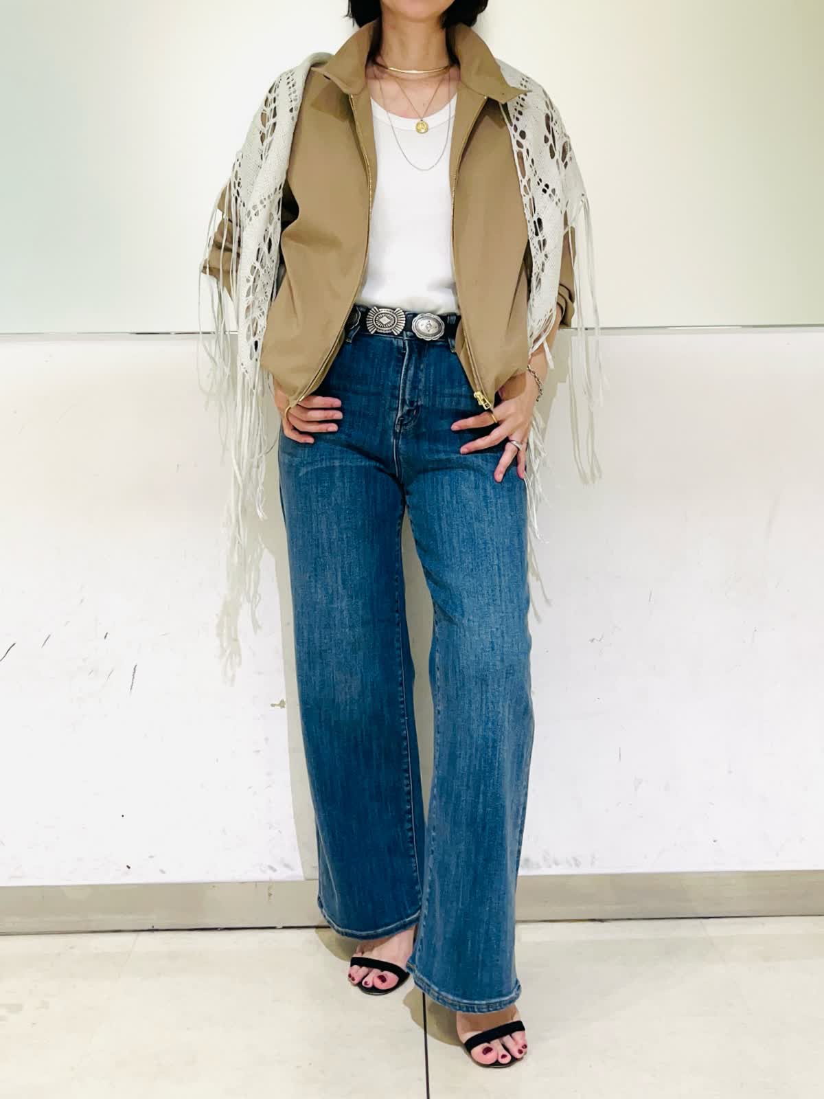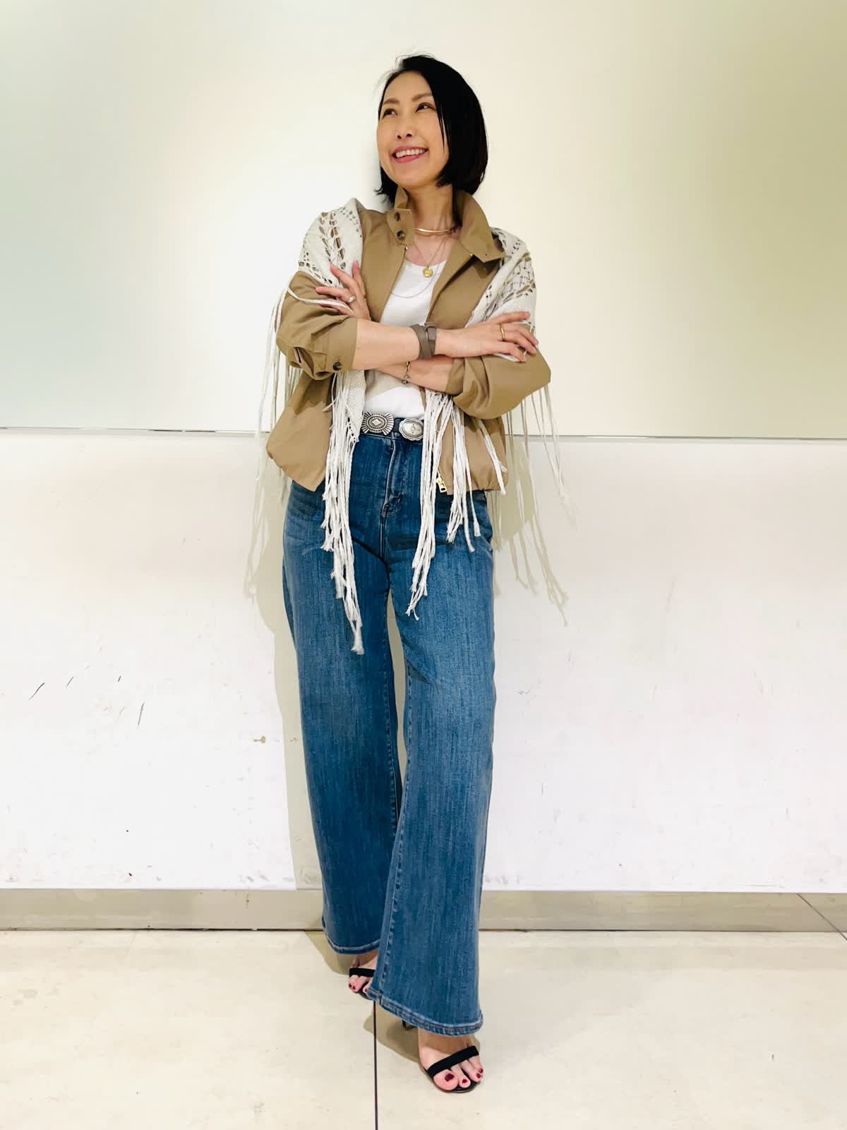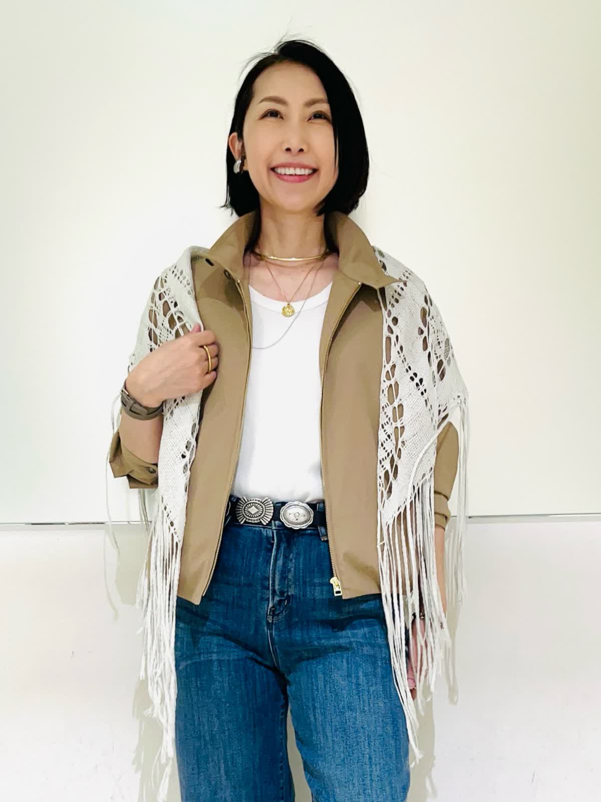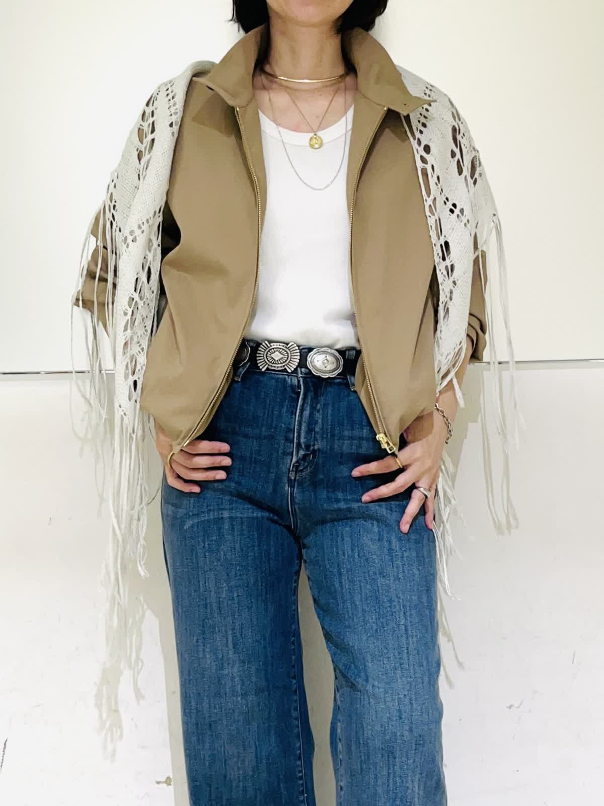 【着用アイテム】すべて9号 【着用カラー】ブルゾン:キャメル カットソー:オフホワイト パンツ:インディゴ カジュアルお出かけコーディネート。スポーティなスタンドカラーのブルゾンにデニムを合わせたカジュアルなコーデです。レースストールで女性らしさをプラス。大人カジュアルはカジュアルアイテムだけでスタイリングせず、きれい目小物を取り入れるのがポイントです。