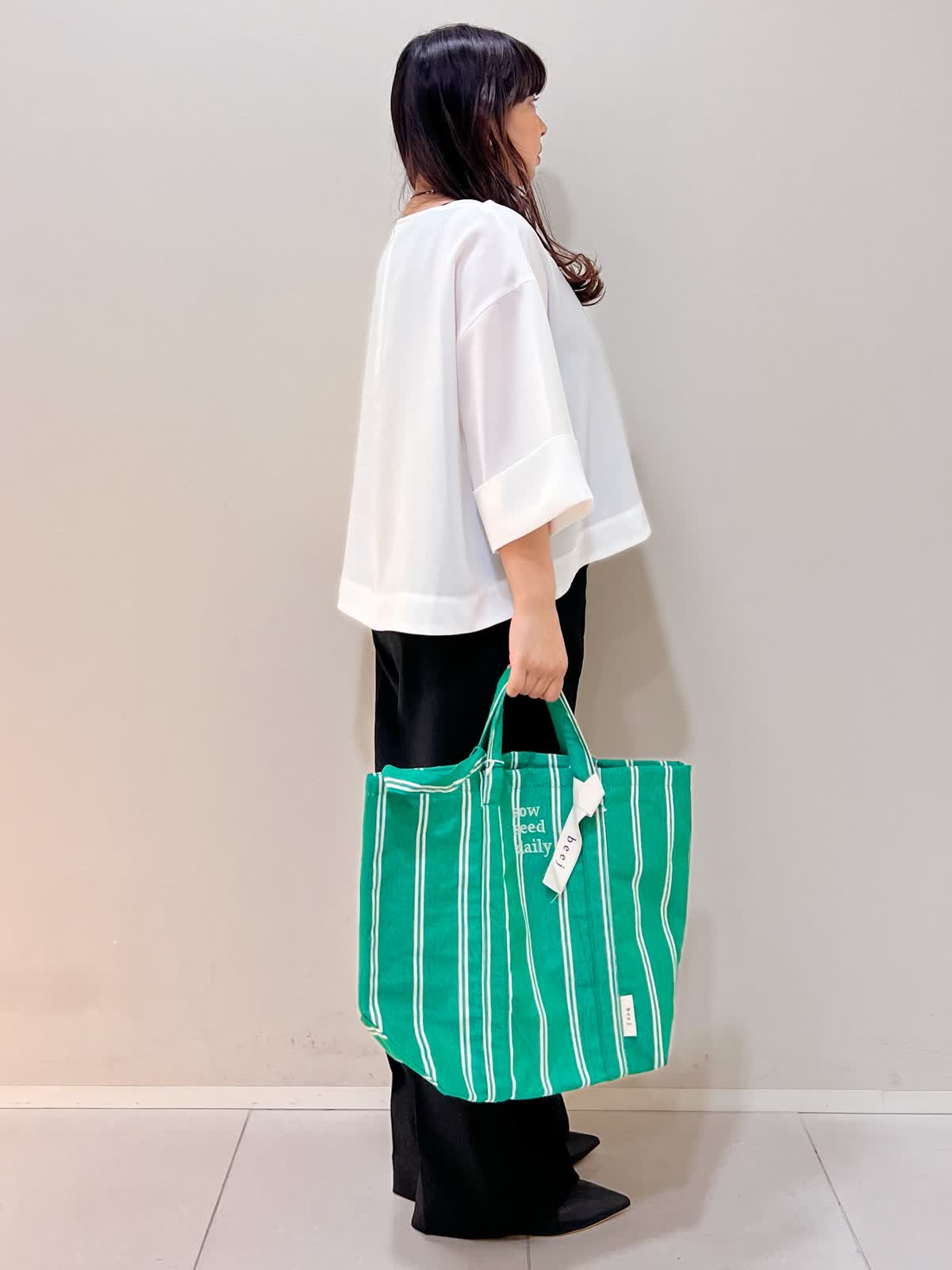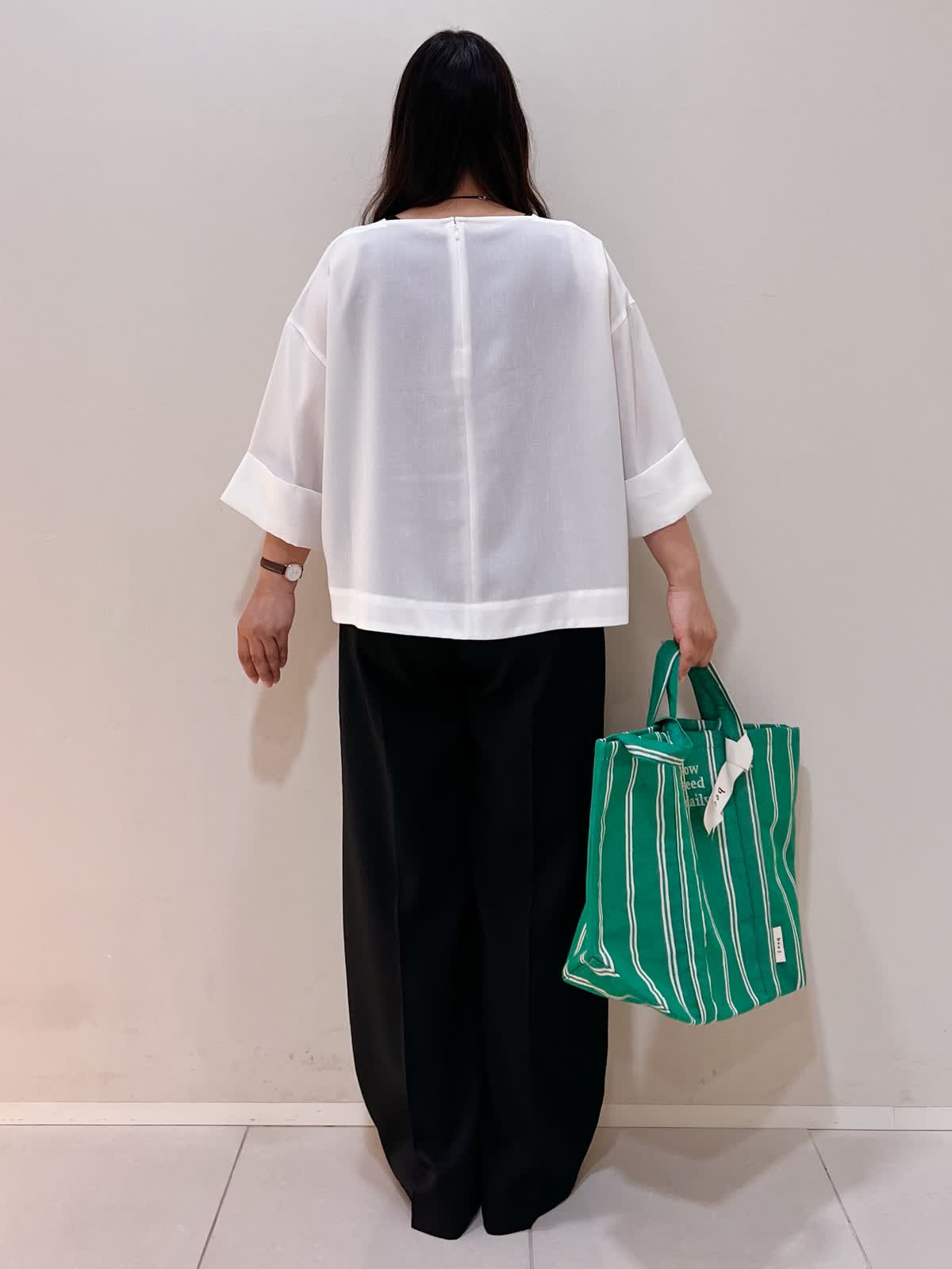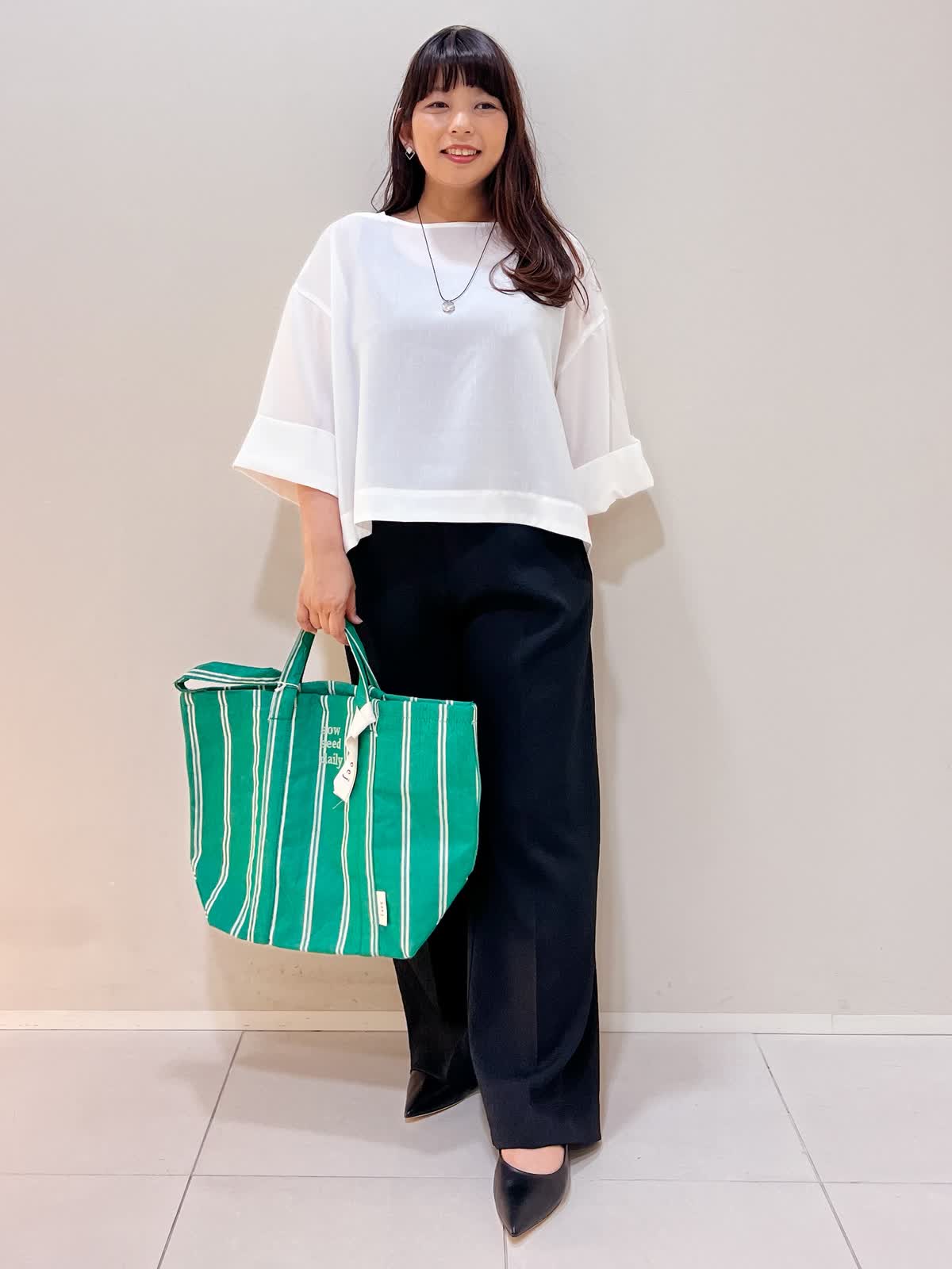 【着用サイズ】ブラウス:フリー パンツ:9号 【着用カラー】ブラウス:オフホワイト パンツ:ブラック バッグ:キミドリ ネックレス:シルバー お出掛けスタイル。 さらっとした着心地のプルオーバーブラウス。ボートネックはマチ付きで開きすぎないデザインがポイント。7分袖でゆったりとしたサイズ感なので、涼しく着用できます。 薄手のフクレジャガード素材で軽く、ウエスト総ゴムでストレス無く着やすいストレートパンツ。すっきりとした落ち感で、トップスを選ばずコーディネート可能です。 カラーの映えるバッグと、シンプルながらポイントになるネックレスと合わせて、GWのお出掛けにお勧めのスタイリングです。
