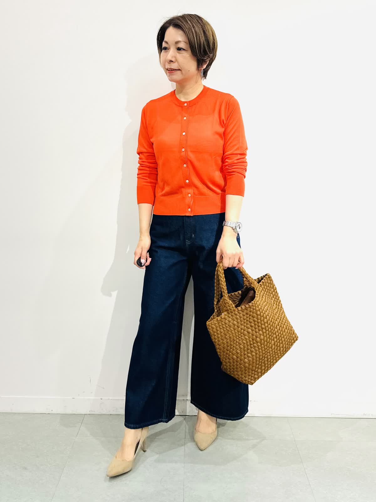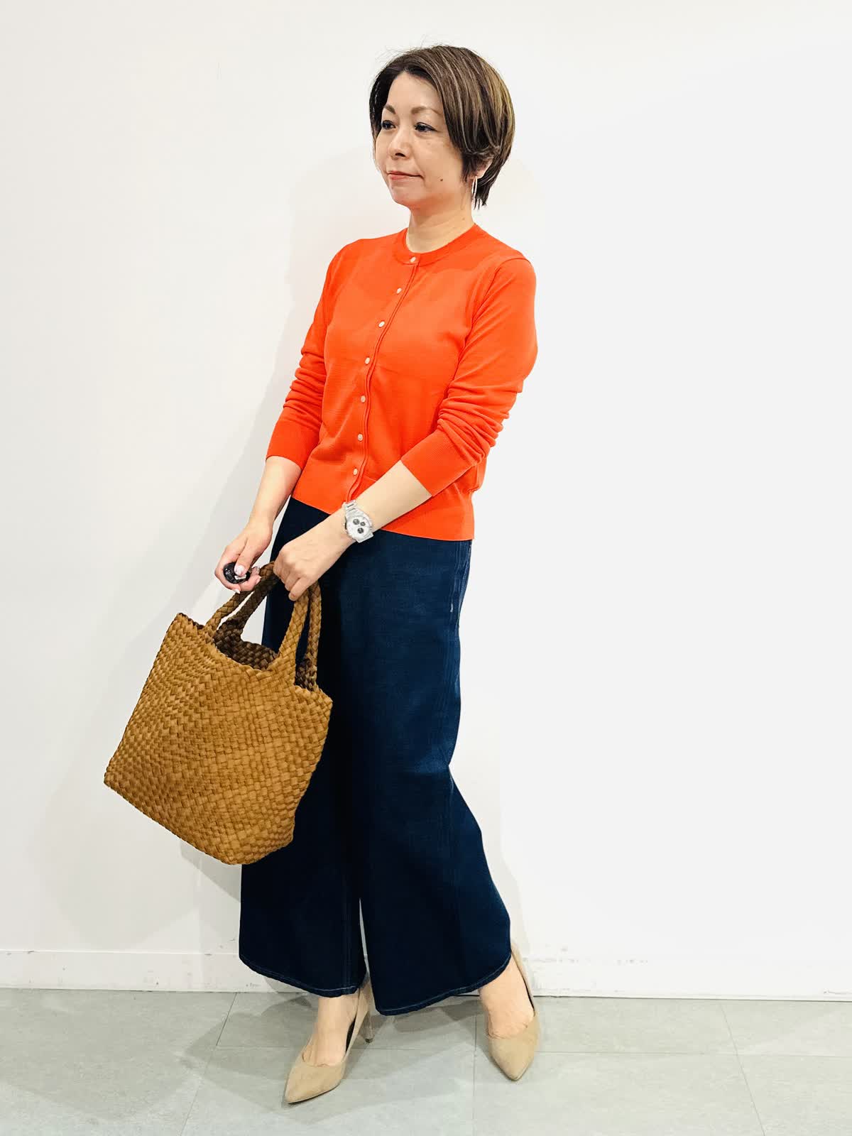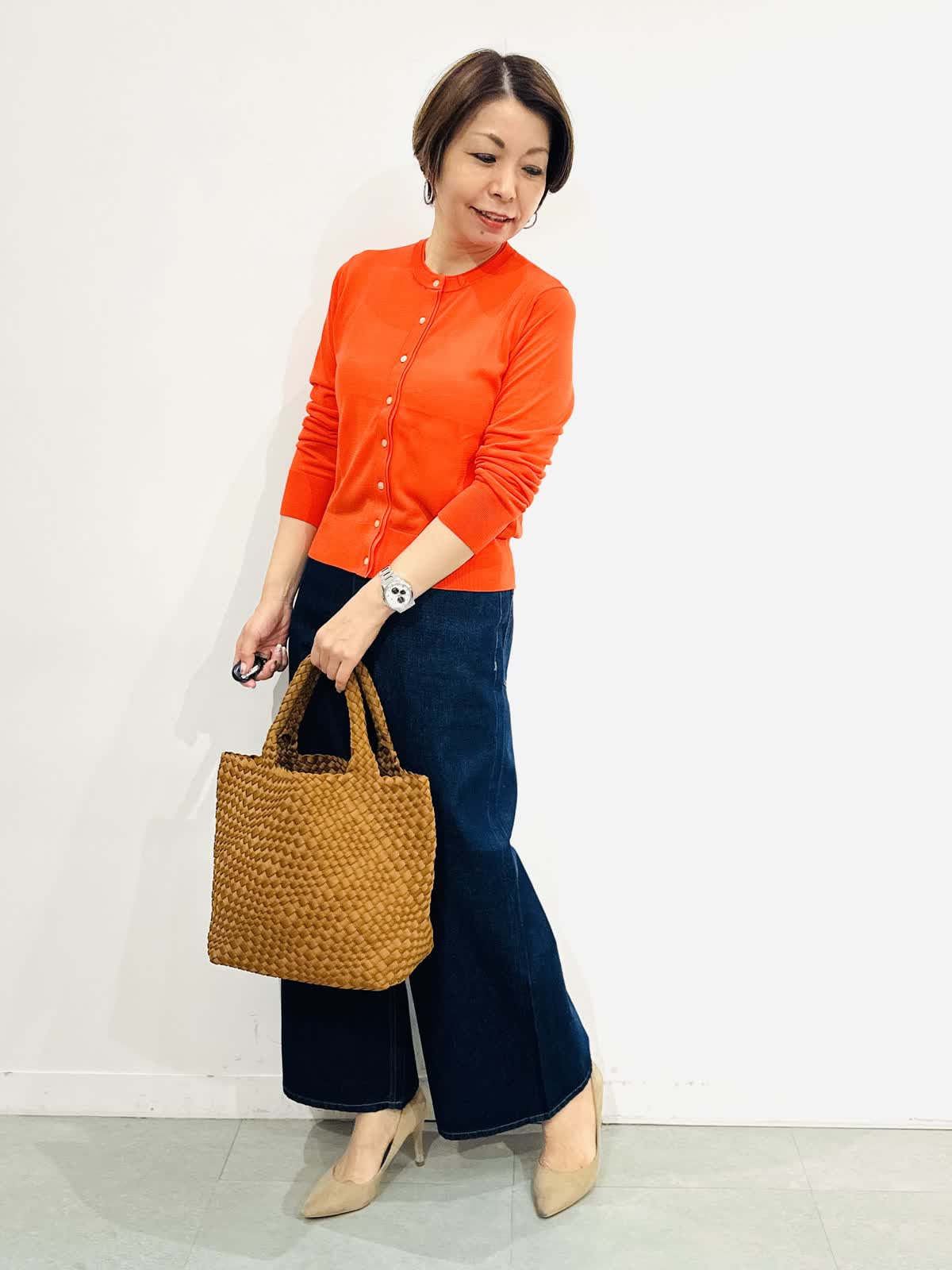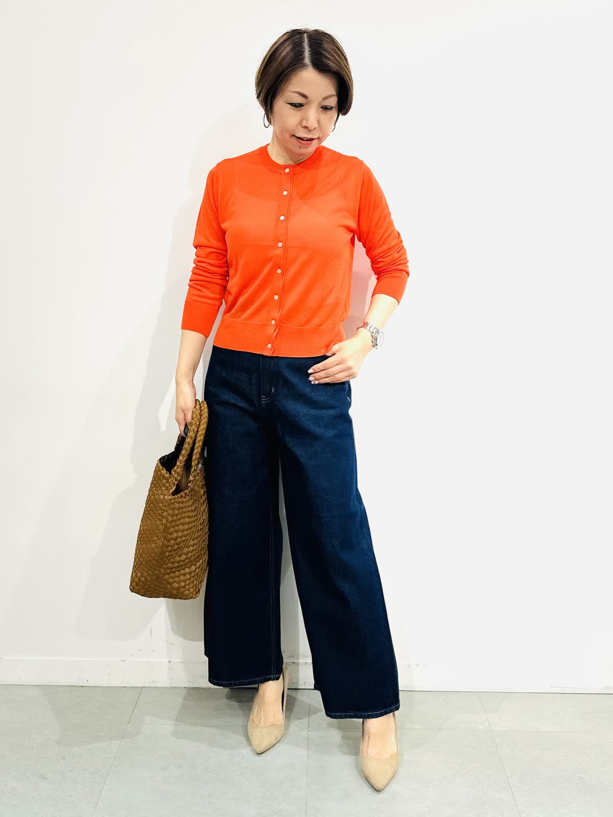 【着用カラー】カーディガン:オレンジ パンツ:インディゴ コート:グレーベージュ 春カラーカーディガンで休日お出かけ 柔らかく肌触りが良いシルク混カーディガンです。