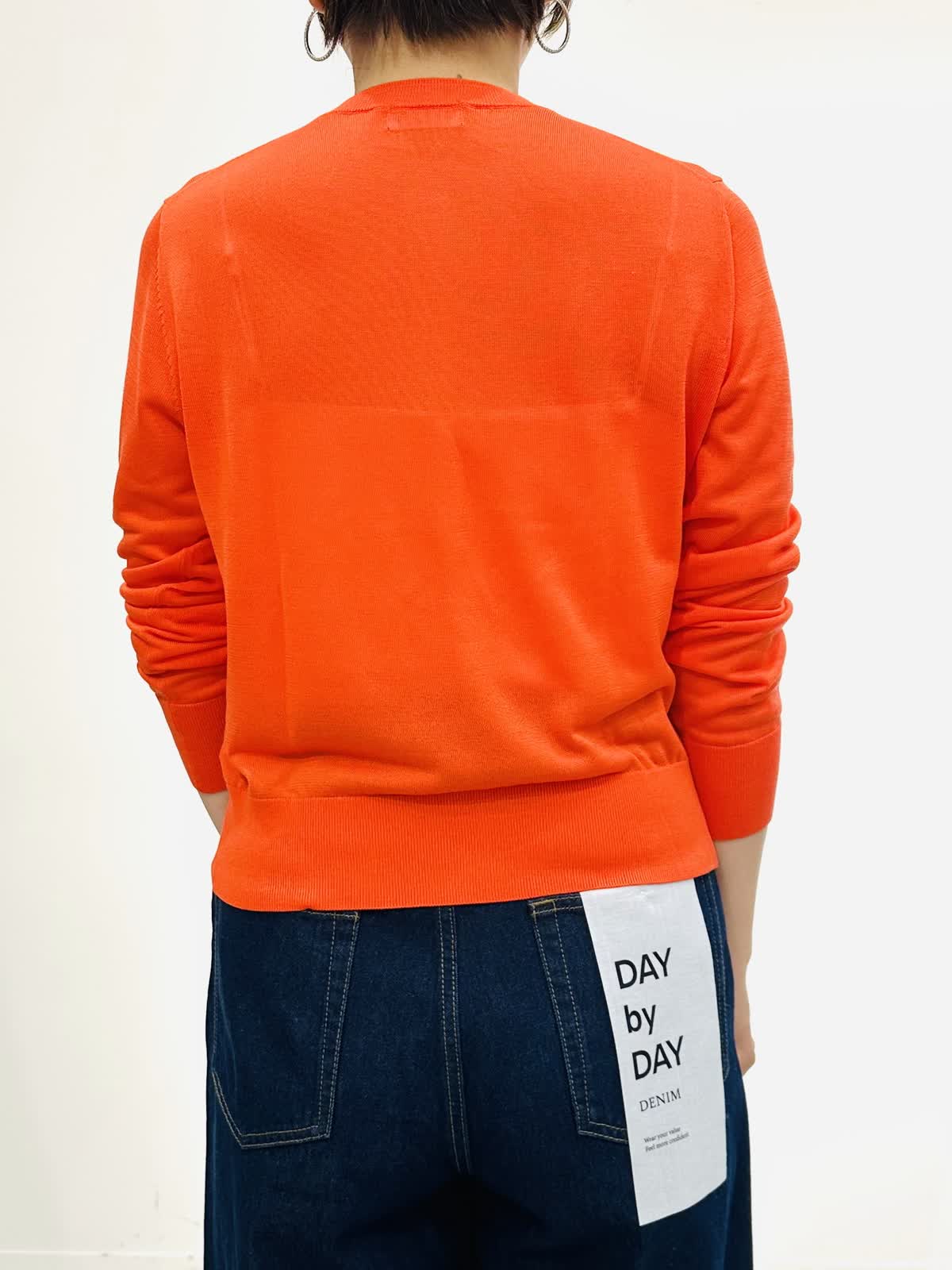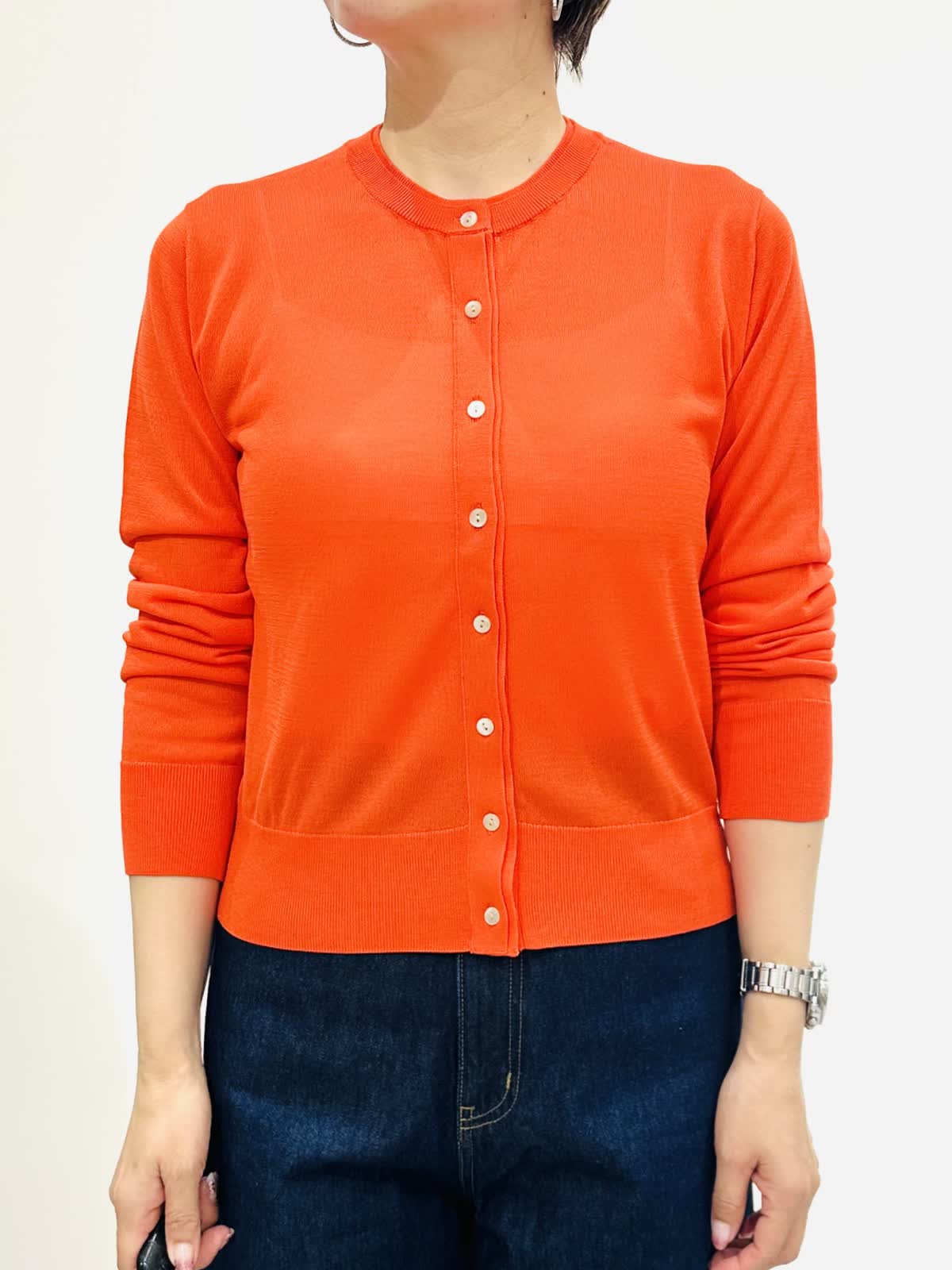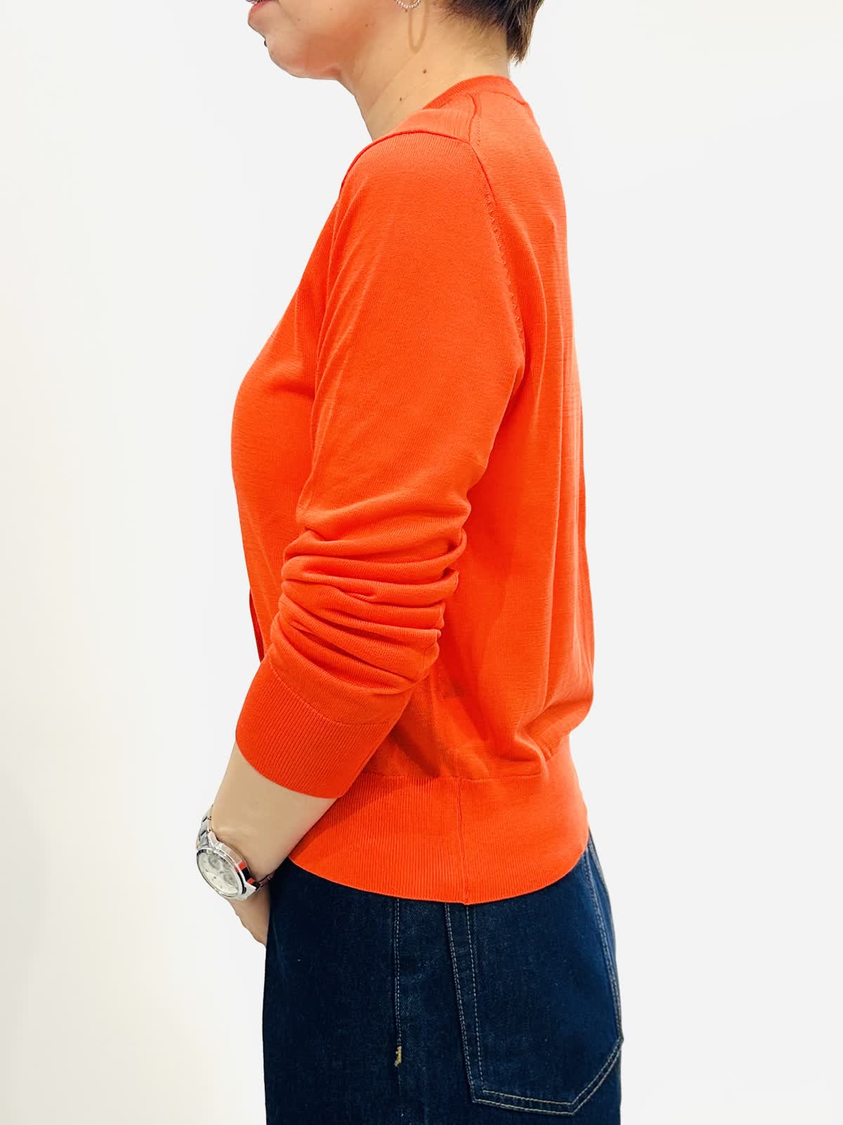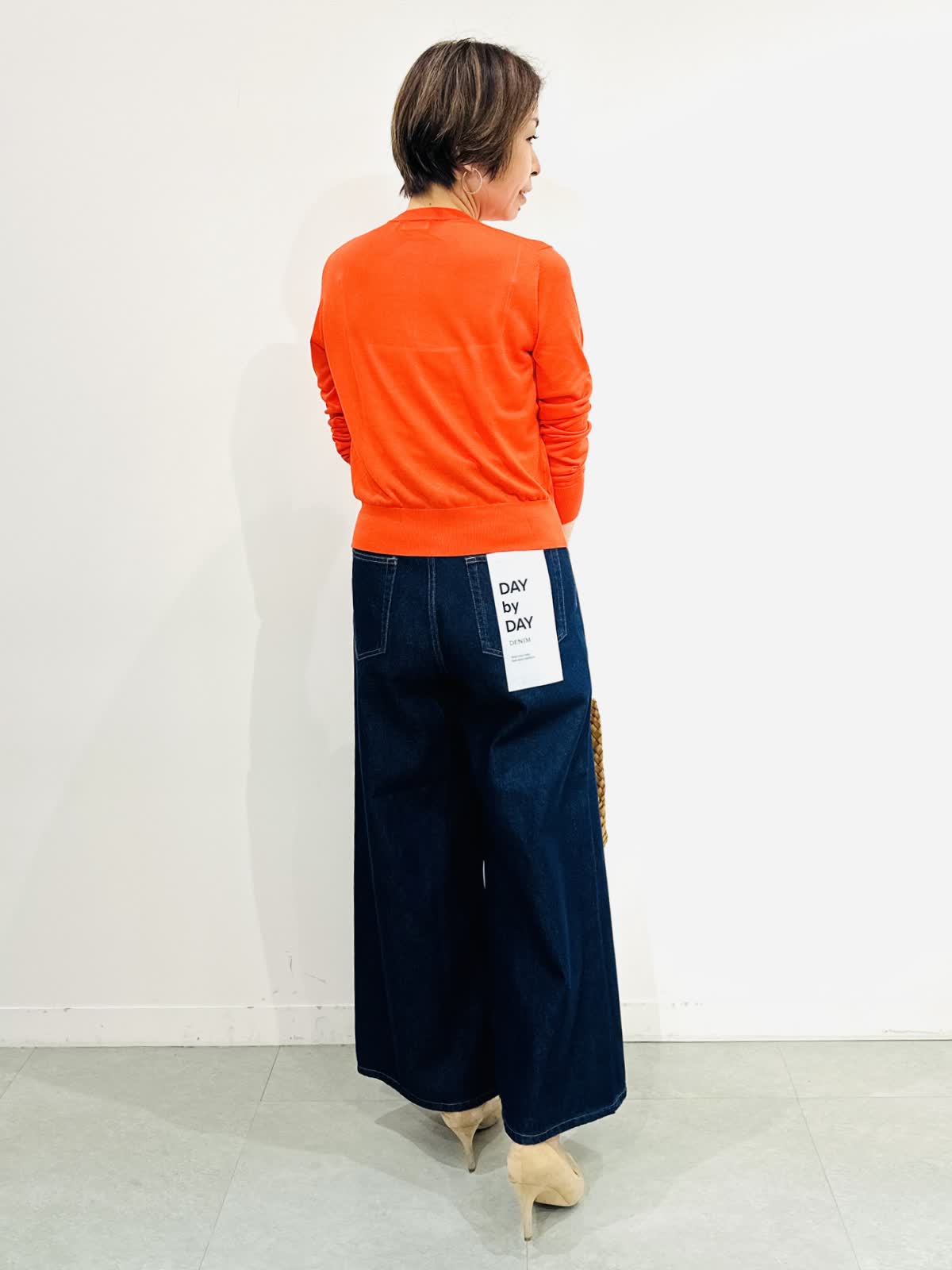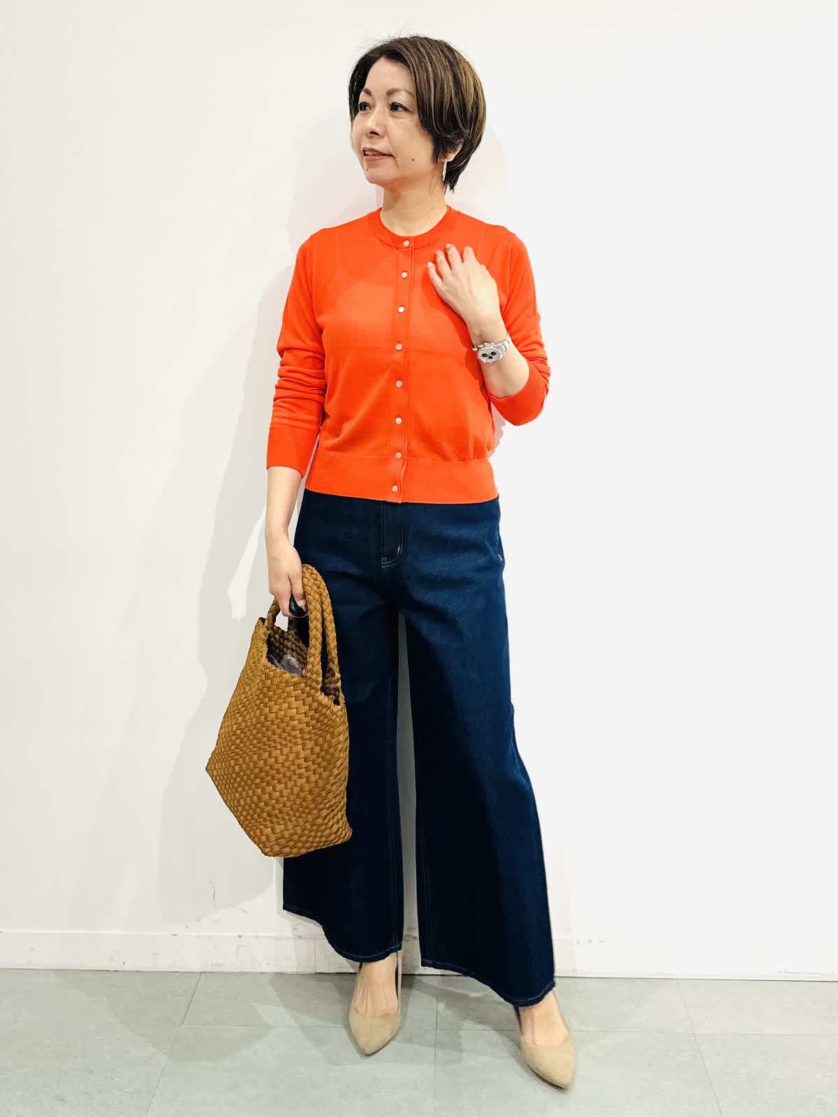 【着用カラー】カーディガン:オレンジ パンツ:インディゴ コート:グレーベージュ 春カラーカーディガンで休日お出かけ 柔らかく肌触りが良いシルク混カーディガンです。