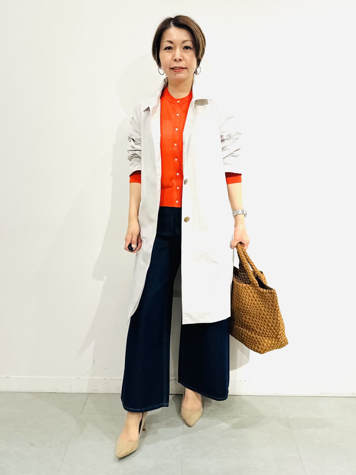 ほんのり透け感があり、春夏羽織れて重宝します。明るめカラーが目を引きます!合わせたのが、カジュアルさとエレガントさを兼ね備えたワイドデニムパンツです。ウエスト周りがスッキリしますので、足長効果◎定番のステンカラーコートを羽織れば今の時期の休日お出かけコーデになりますよ。
