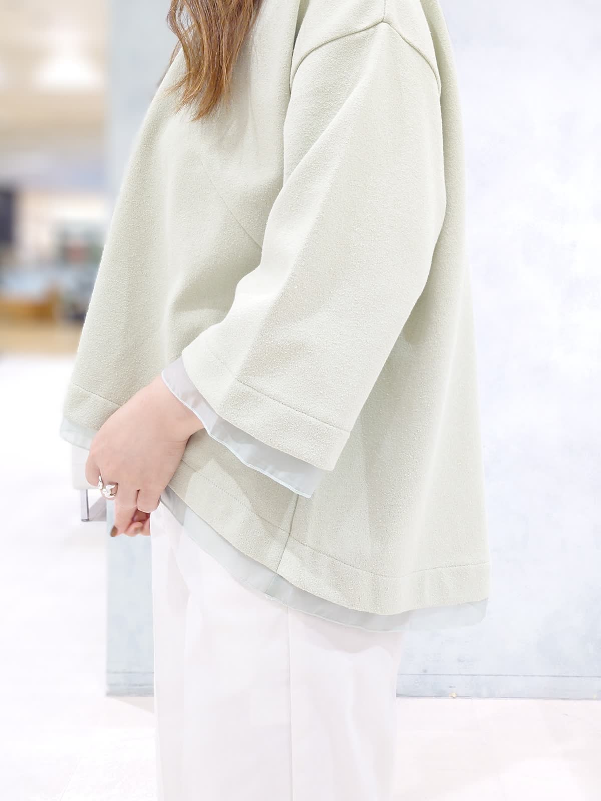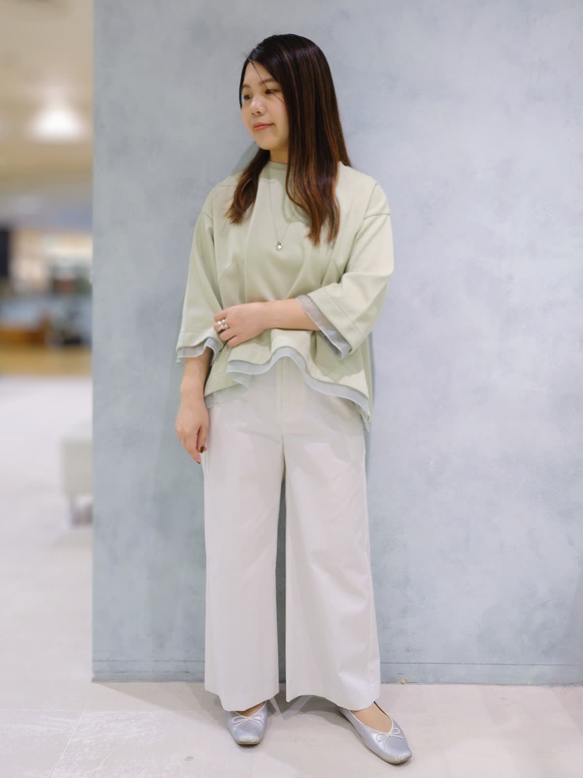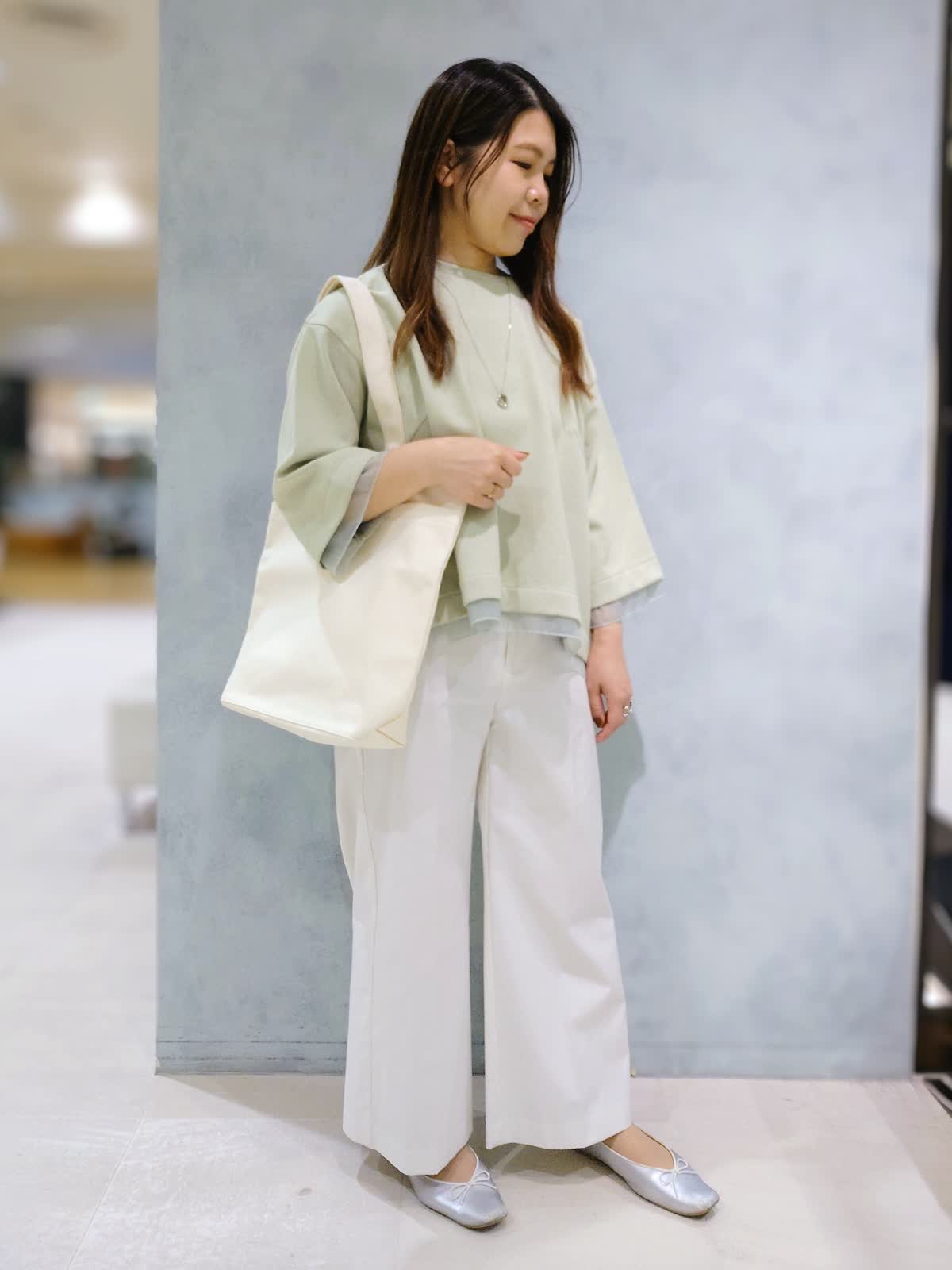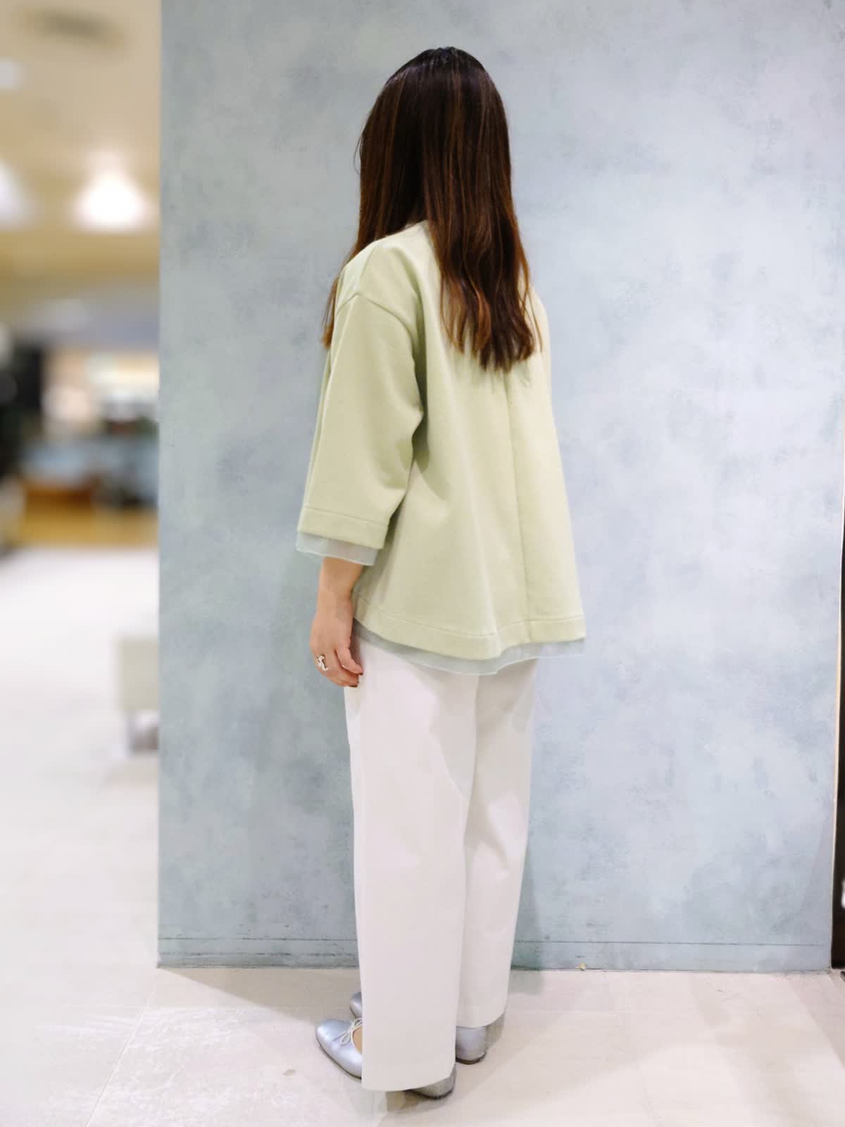 【着用サイズ】プルオーバー:フリー パンツ:7号 【着用カラー】プルオーバー:キミドリ パンツ:オフホワイト 袖口と裾のシアー素材がワンポイントのトップスは程よいゆるっと感で着心地も良いです。ボトムはお直し要らずで履けるので小柄さんにおすすめ!