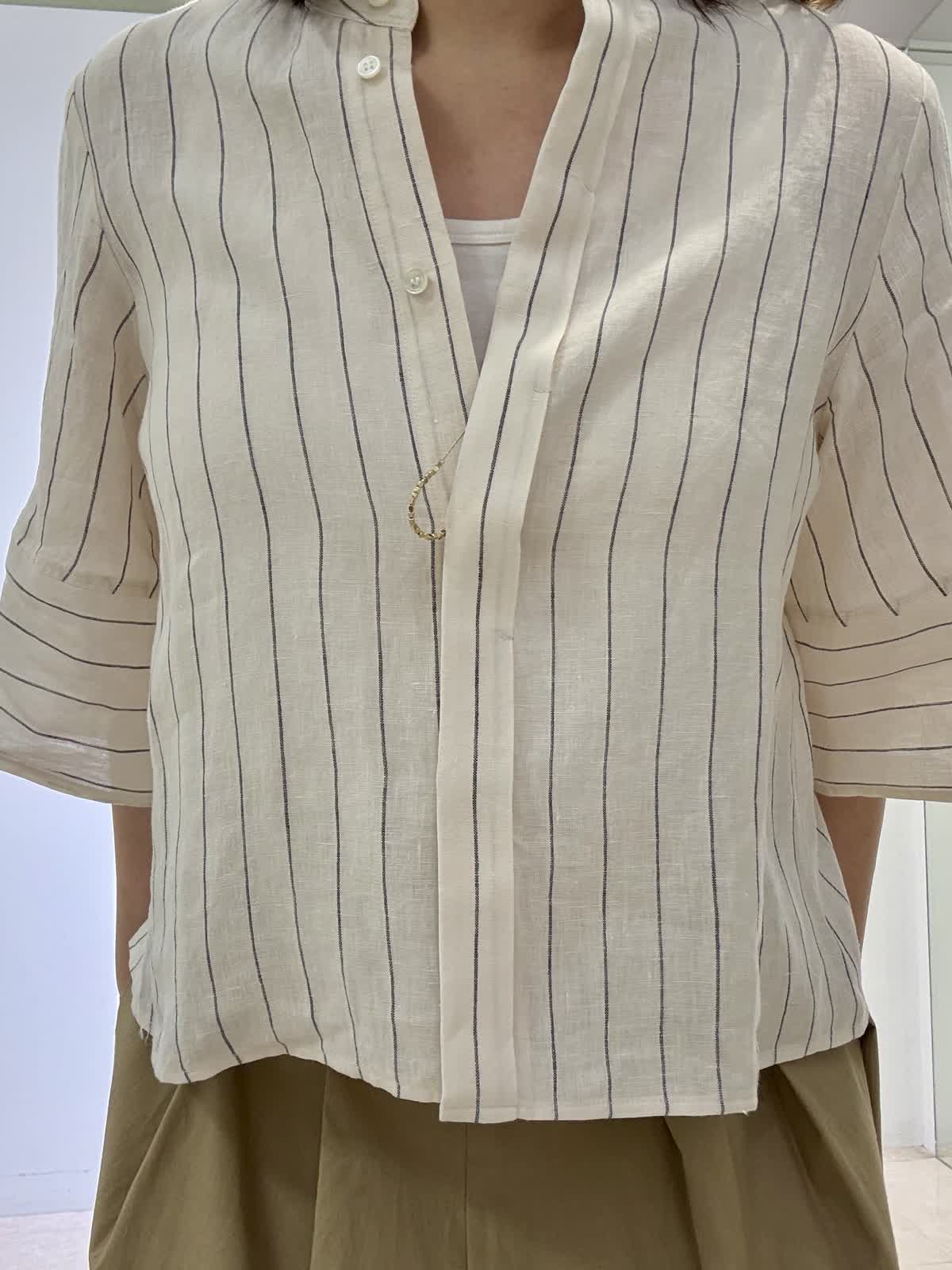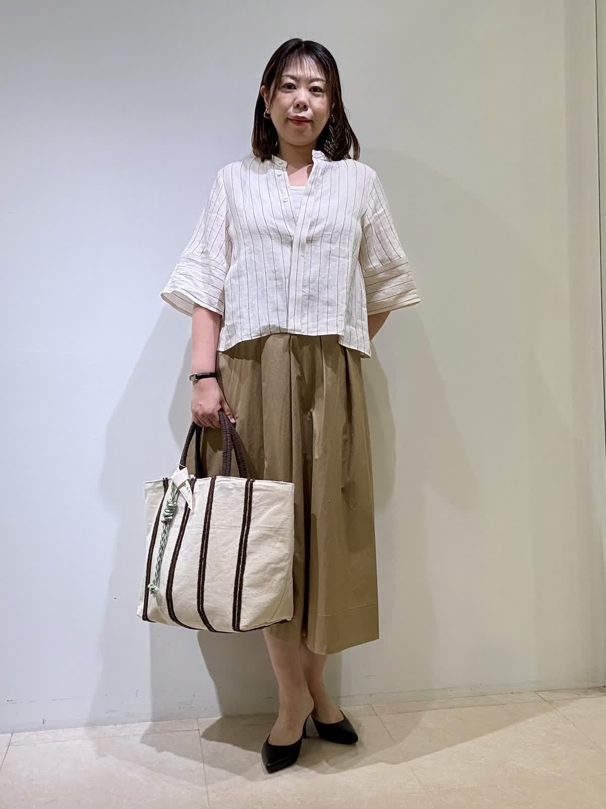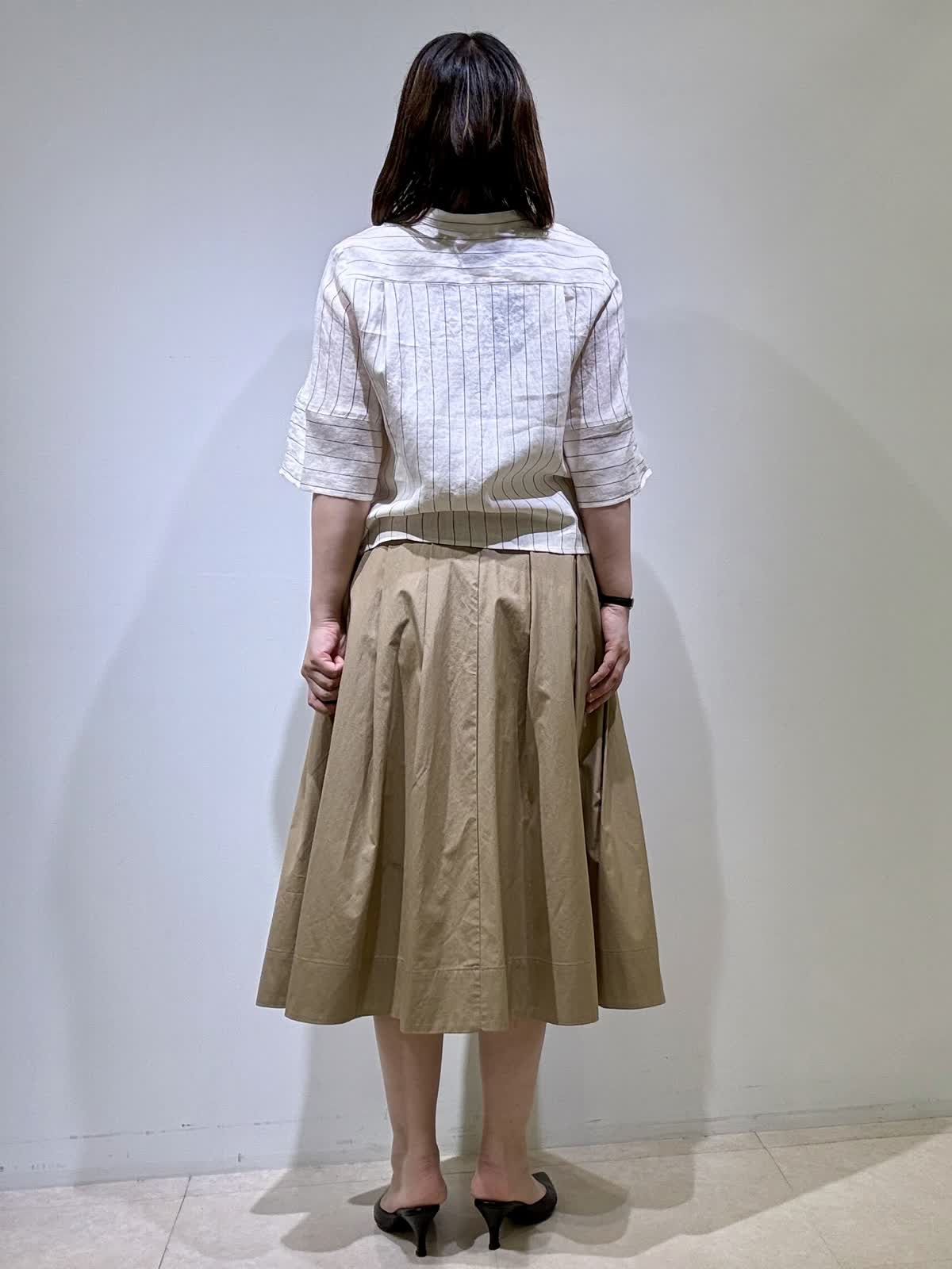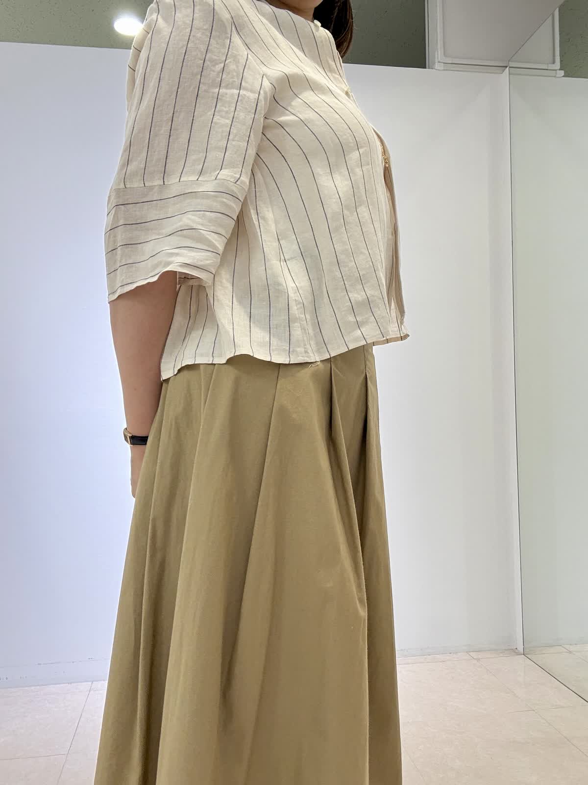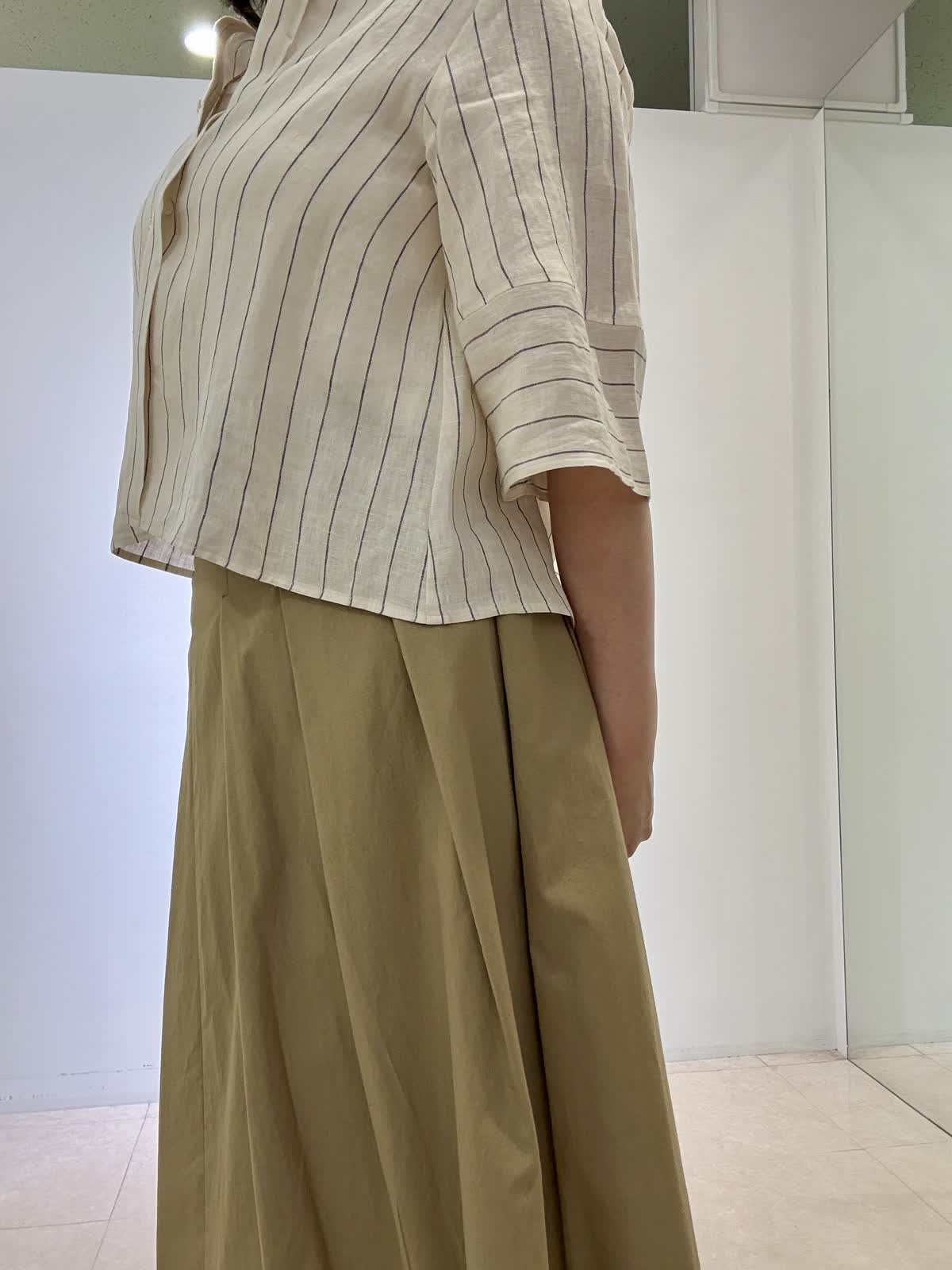 ブラウス着用サイズ 9号 リネンのノーカラーブラウスです。一枚で着ても、前を開けて羽織りとしても使えます。ちょうど良い丈感でワンピースや長め丈のボトムスと相性ピッタリです。 スカート着用サイズ9号 ストーリーコラボのスカートです!ボリュームがヒップからなのでウエスト周りがスッキリ見えます。スニーカーで合わせても可愛いです!いつもは11号ですがどちらも9号サイズで大丈夫でした。