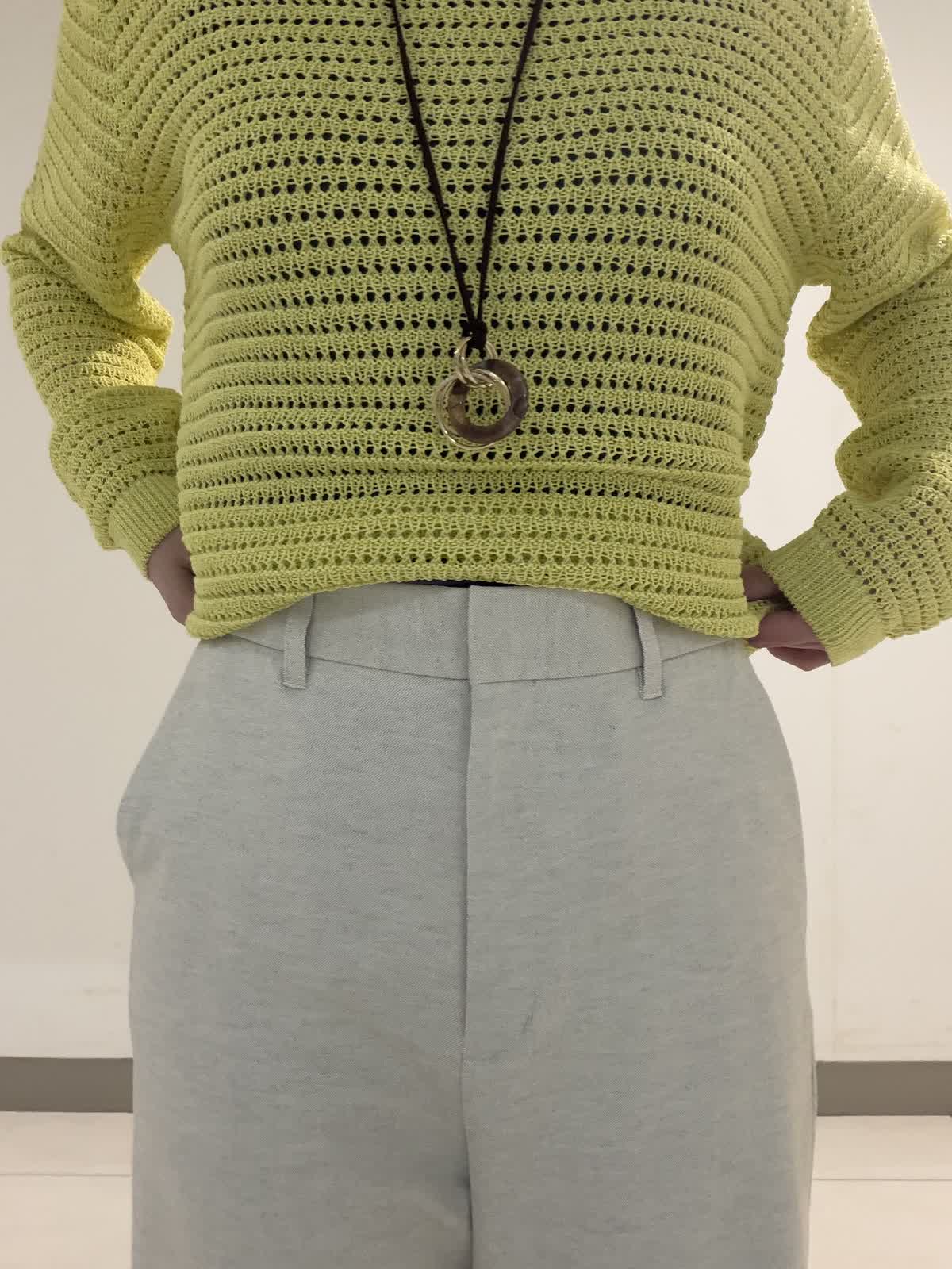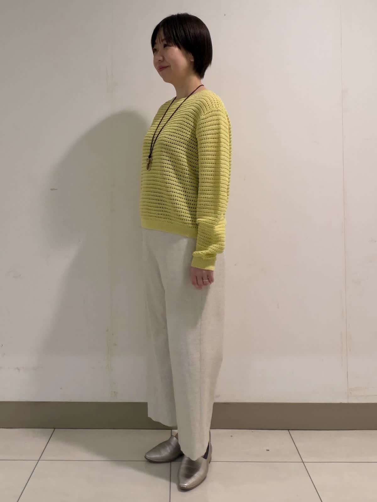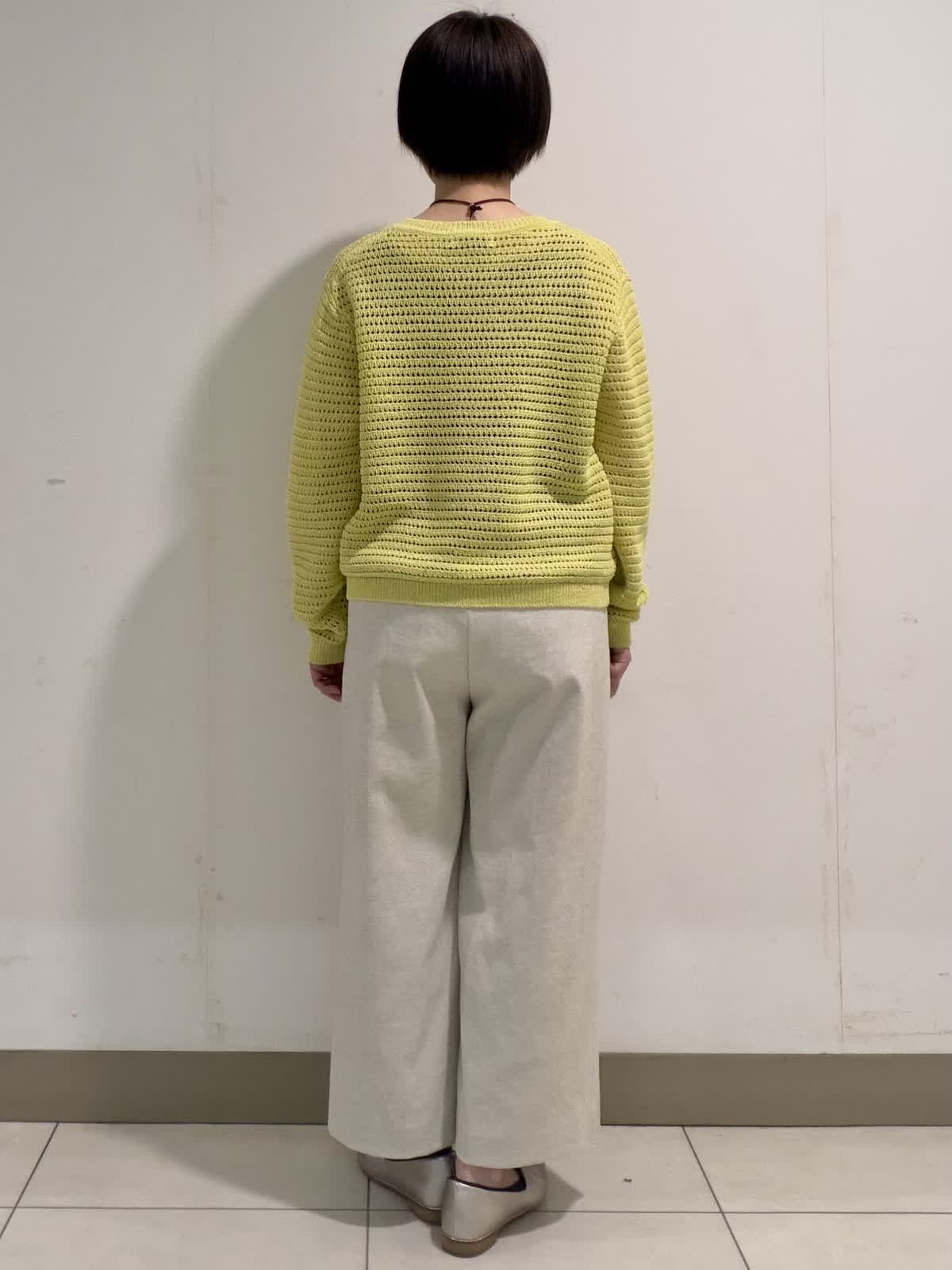 【着用サイズ】ニット:フリー パンツ:9号 透かし柄のプルオーバーニットは身体のラインを拾いにくい程良いサイズ感が◎。ボトムを選ばず着回しやすい丈感も嬉しいポイントです。パンツは綿麻混のポリエステル素材を使用した大人気のクロップトパンツ。スッキリとしながらも程良くワイド感もありバランスが取りやすいです◎。シワにもなりにくいので春のご旅行にも最適です。