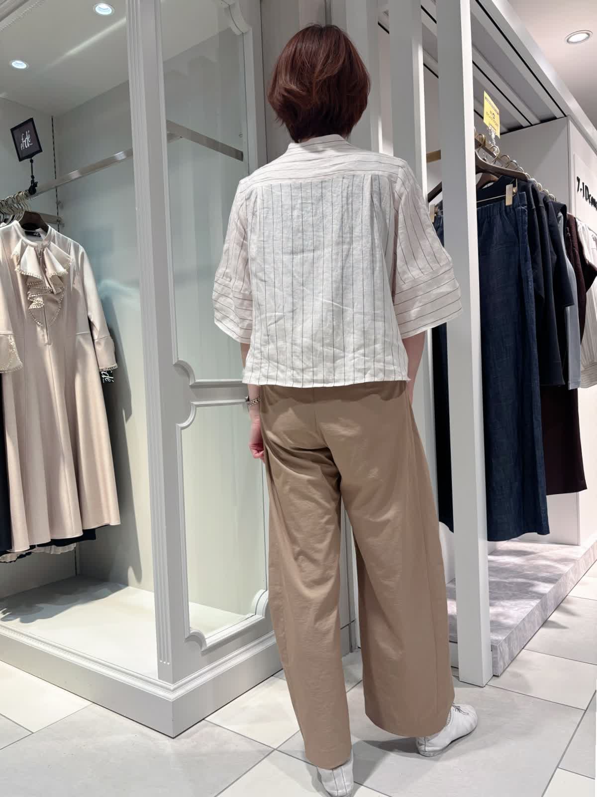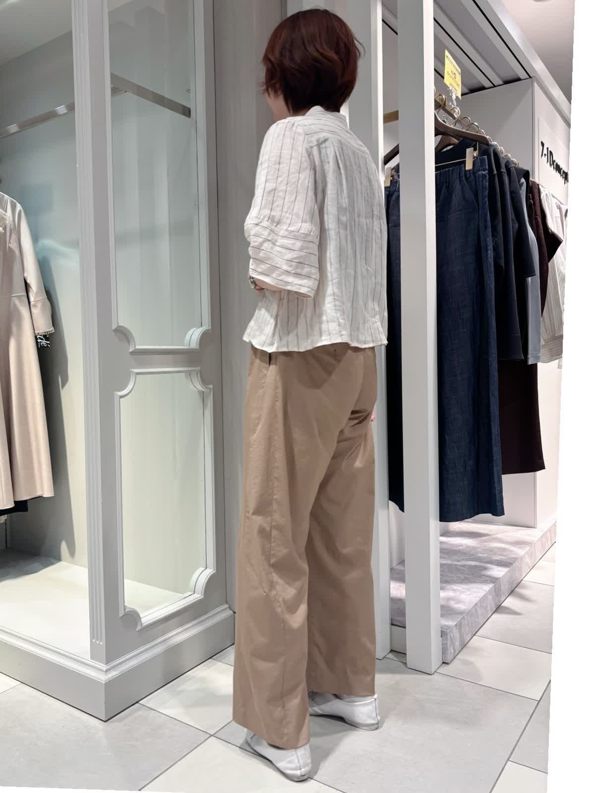 【着用サイズ/カラー】ブラウス:9号/ストライプ パンツ:9号/キャメルリネン素材のブラウスで、軽やかさと涼しげな雰囲気を出しています。 ベージュのワイドパンツを合わせることで、やわらかくナチュラルな印象に。 全体を淡いカラーでまとめた、抜け感のあるリラックススタイルです。
