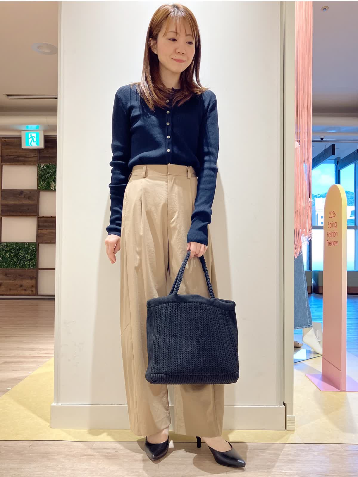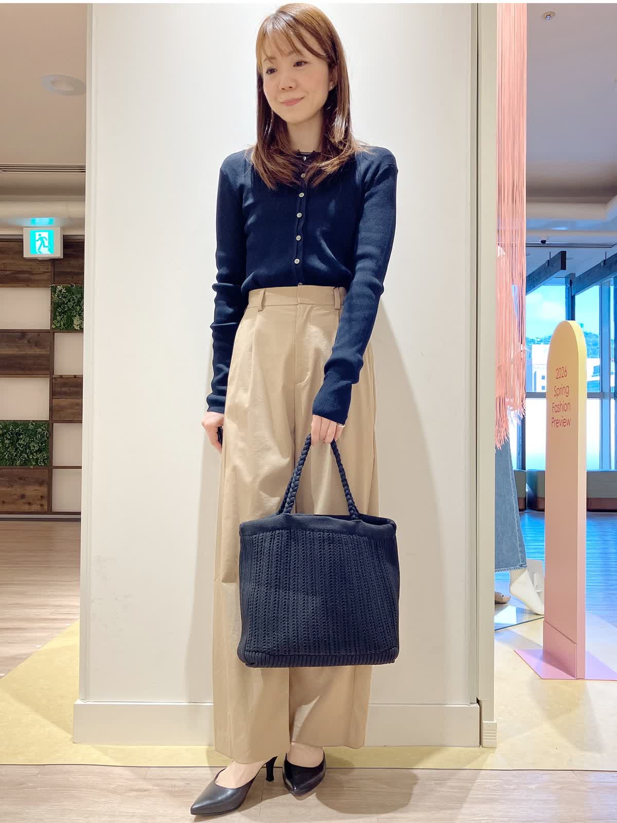 【着用サイズ】カーディガン:9号 パンツ:7号 【着用カラー】カーディガン:ダークネイビー パンツ:キャメル コーディネートのテーマは春の通勤スタイリングです。 ボタンがおしゃれなカーディガンは、一枚着のプルオーバー風に。 今年トレンドのバレルパンツも、カーディガンをインして綺麗めカジュアルに着こなせます。通勤やちょっとしたお出かけにおすすめのコーディネートです。