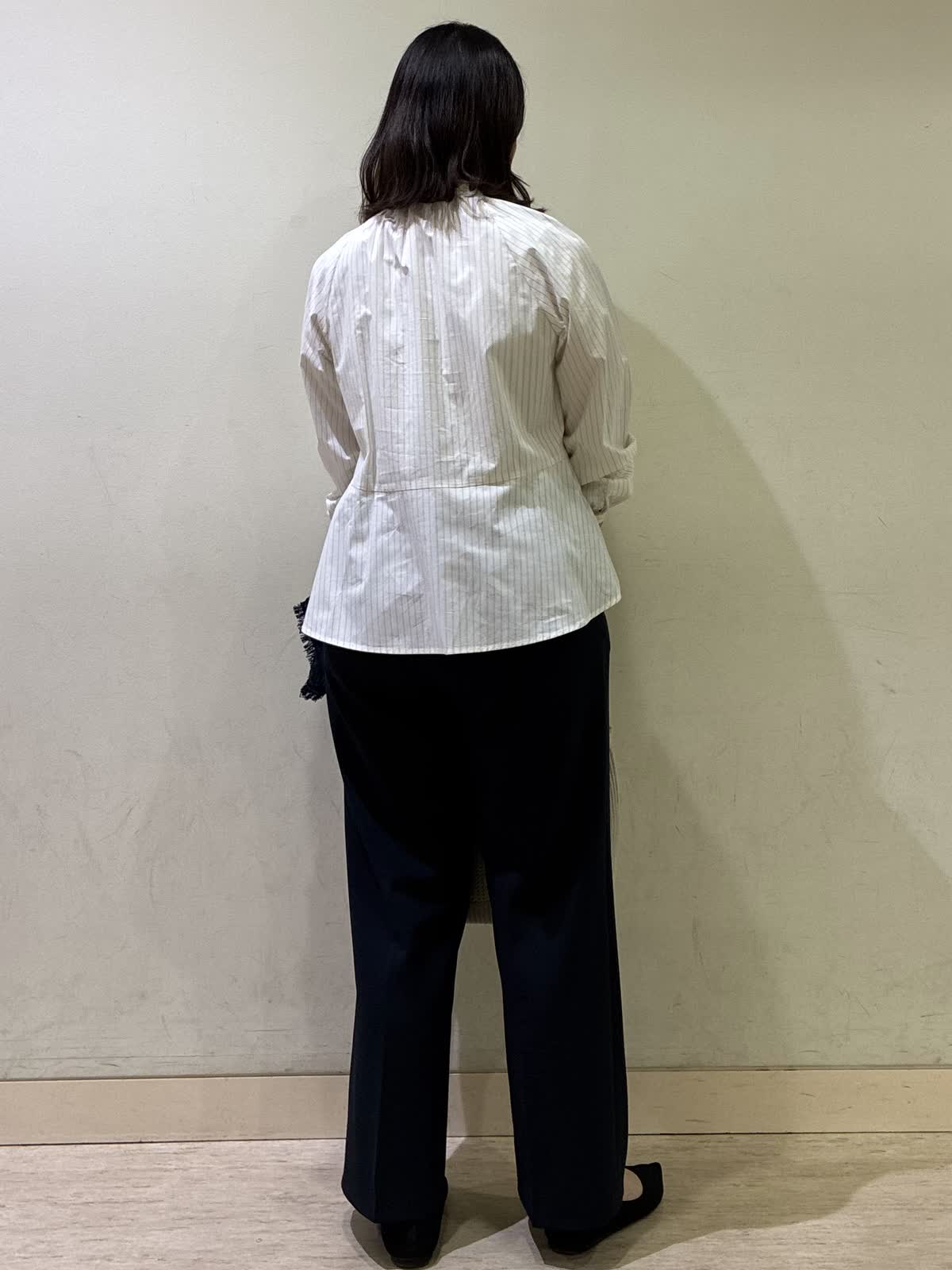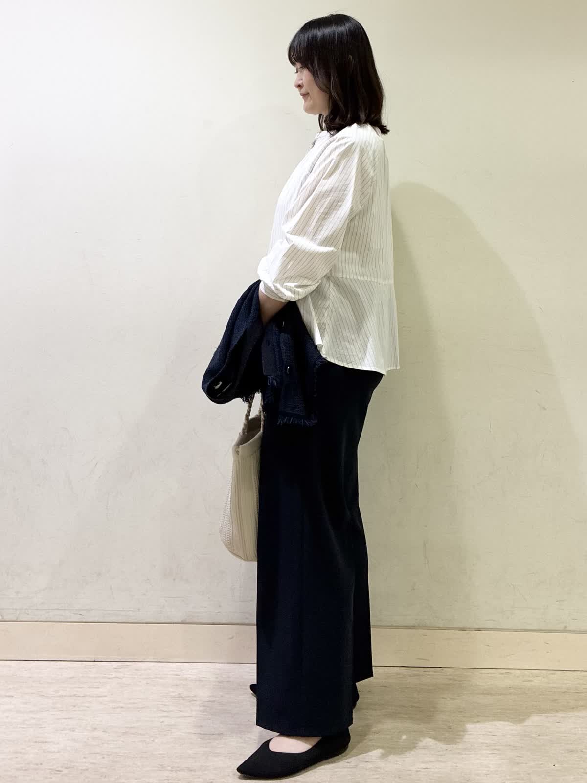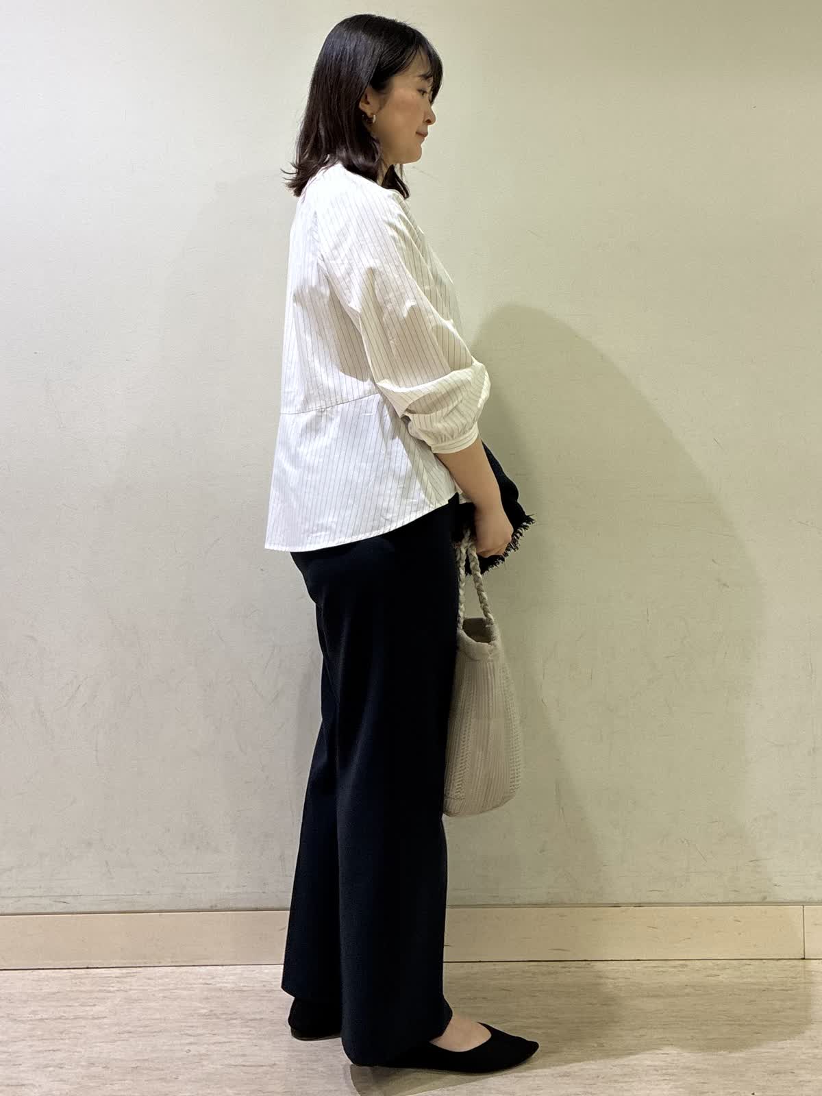 【着用カラー/サイズ】ブラウス:オフホワイト/フリー パンツ :ネイビー/11号 お仕事コーデ。ペプラムシャツは一枚で華やかになりシンプルなパンツと合わせて簡単にコーデがまとまりやすいです。細いストライプがさりげないアクセントに。