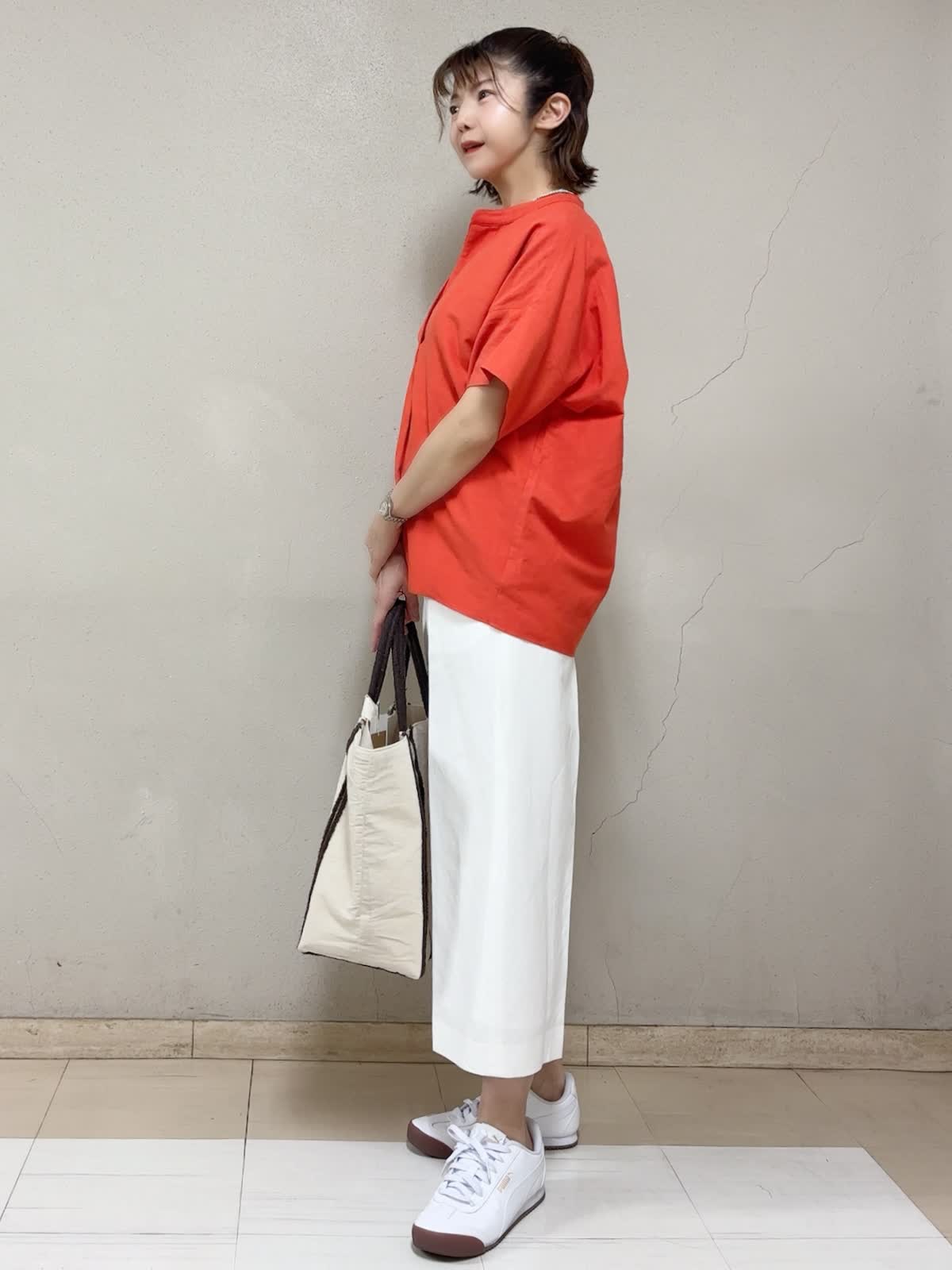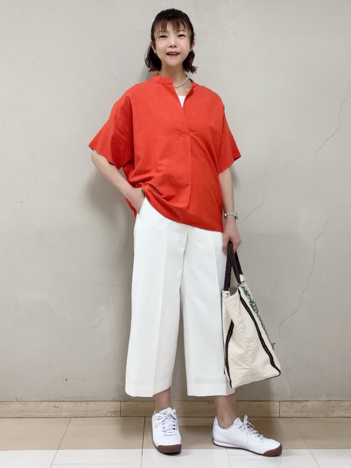 【着用サイズ】ブラウス:フリー タンクトップ:9号 パンツ:11号 【着用カラー】ブラウス:シュイロ タンクトップ:ホワイト パンツ:オフホワイト お出掛けスタイル 麻の抜け感のあるブラウスは、ゆったりして着丈も良いです。セットアップで揃えても素敵ですが、普段はあえてセットにせず。着回し抜群です。