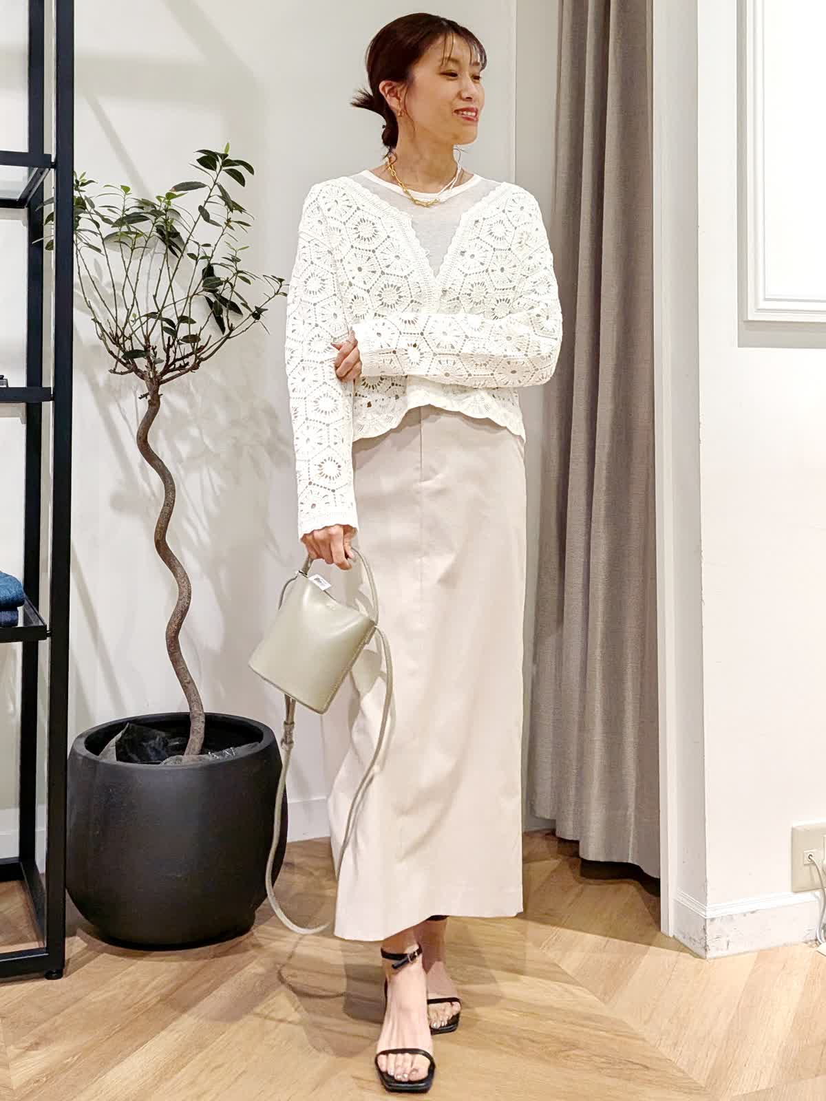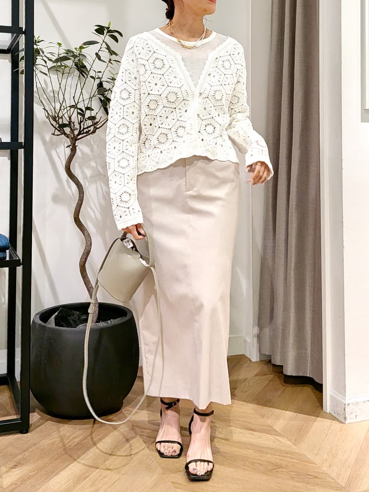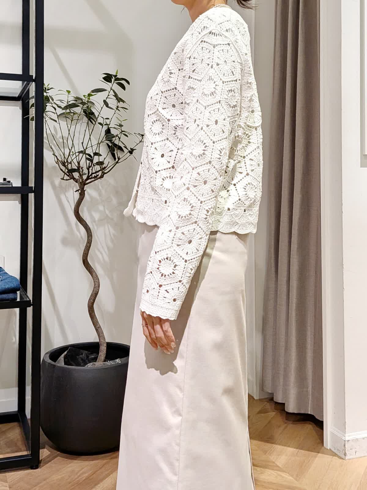 【着用サイズ】カーディガン?オフホワイト?9号 カットソー?オフホワイト?9号スカート?ベージュ?11号 柔らかな印象になるクロシェ編みがポイントのカーディガン。シルバーのコンパクトなボタンが可愛い。インナー次第で長い期間お使い頂けて夏もタンクトップに羽織るだけで二の腕も気にならずお洒落に着ていただけます。今回合わせたのはシアーのカットソー。袖を少し長めにだしてレイヤードスタイルに。スカートはスッキリ細見えが叶うスカート。個人的に腰張りさんなのでいつもよりサイズアップしてます。