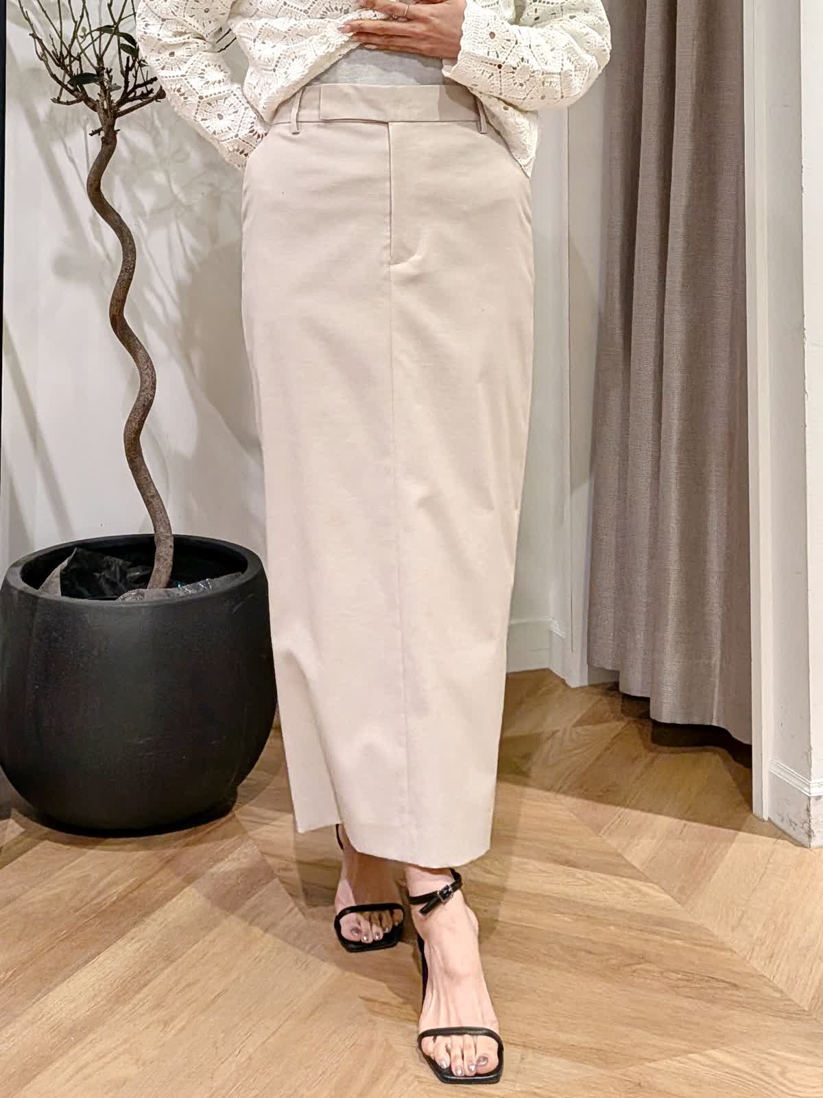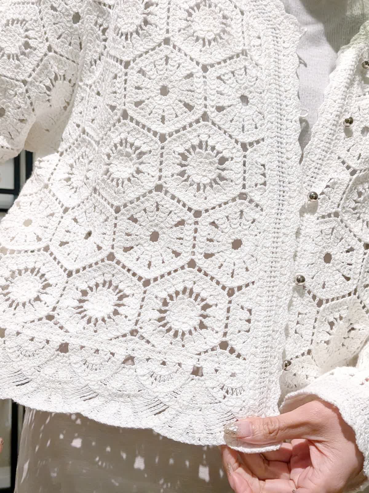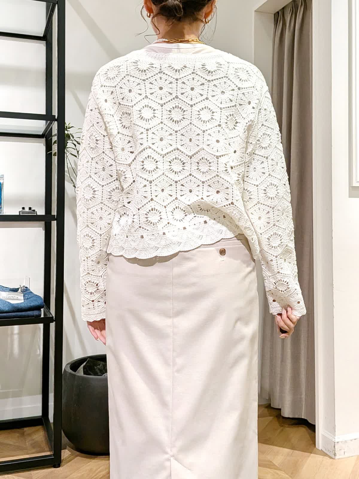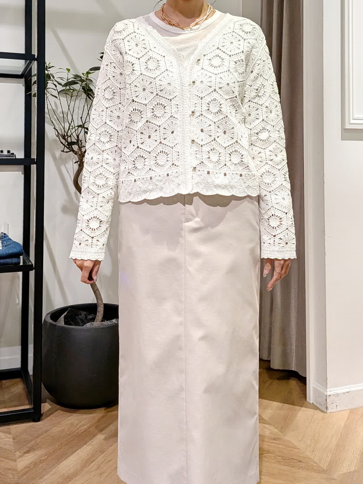 【着用サイズ】カーディガン?オフホワイト?9号 カットソー?オフホワイト?9号スカート?ベージュ?11号 柔らかな印象になるクロシェ編みがポイントのカーディガン。シルバーのコンパクトなボタンが可愛い。インナー次第で長い期間お使い頂けて夏もタンクトップに羽織るだけで二の腕も気にならずお洒落に着ていただけます。今回合わせたのはシアーのカットソー。袖を少し長めにだしてレイヤードスタイルに。スカートはスッキリ細見えが叶うスカート。個人的に腰張りさんなのでいつもよりサイズアップしてます。