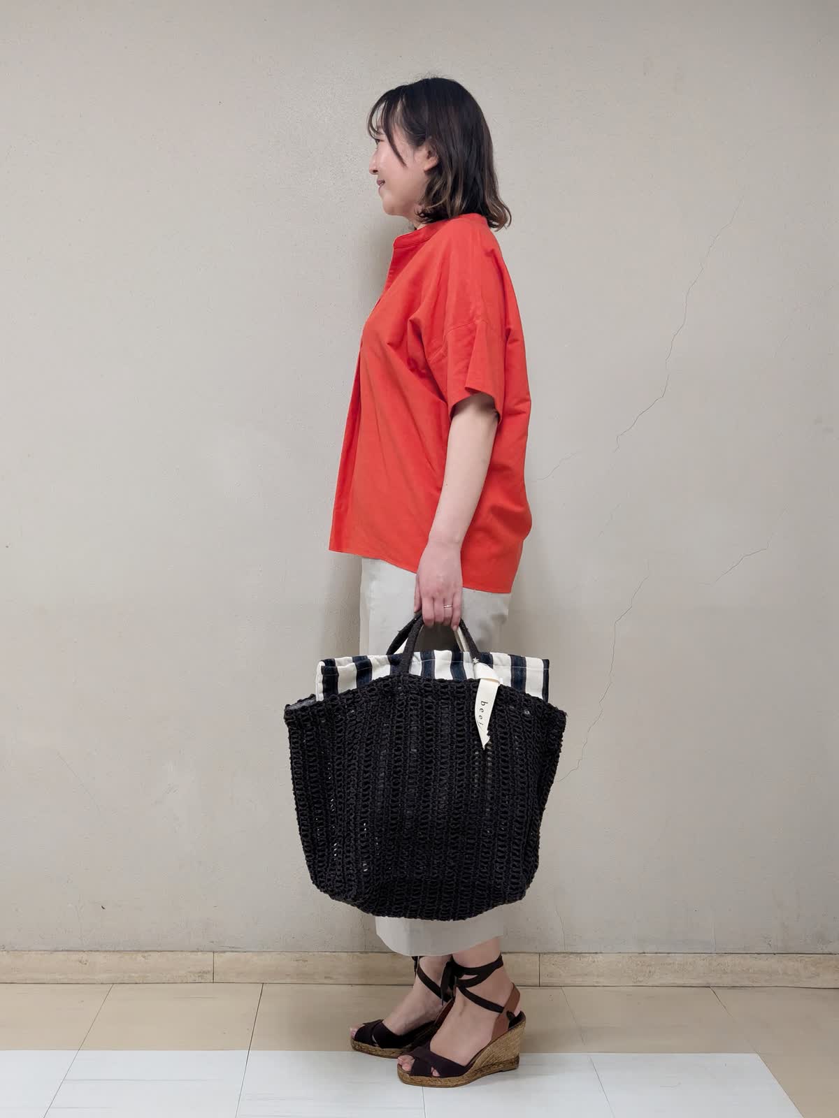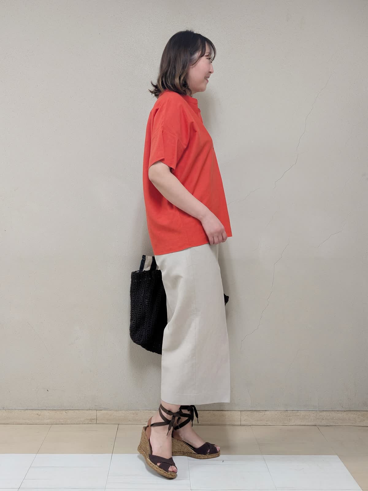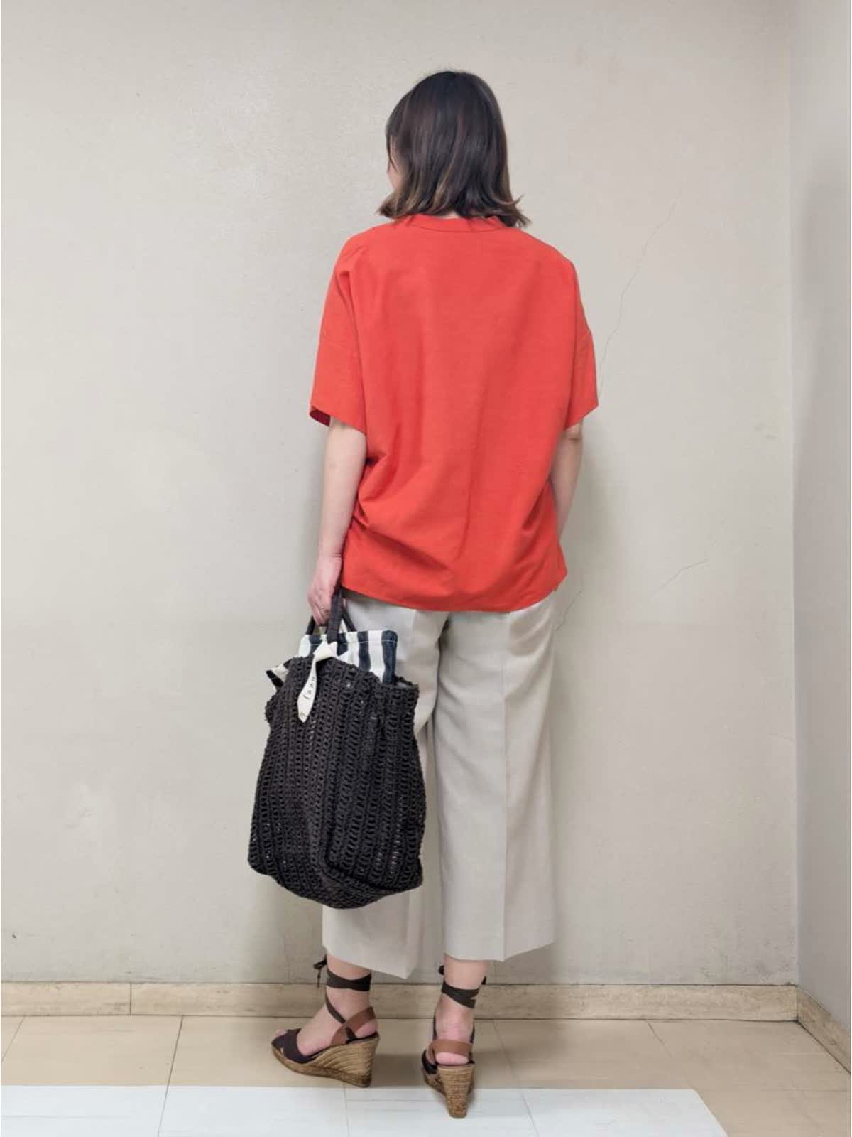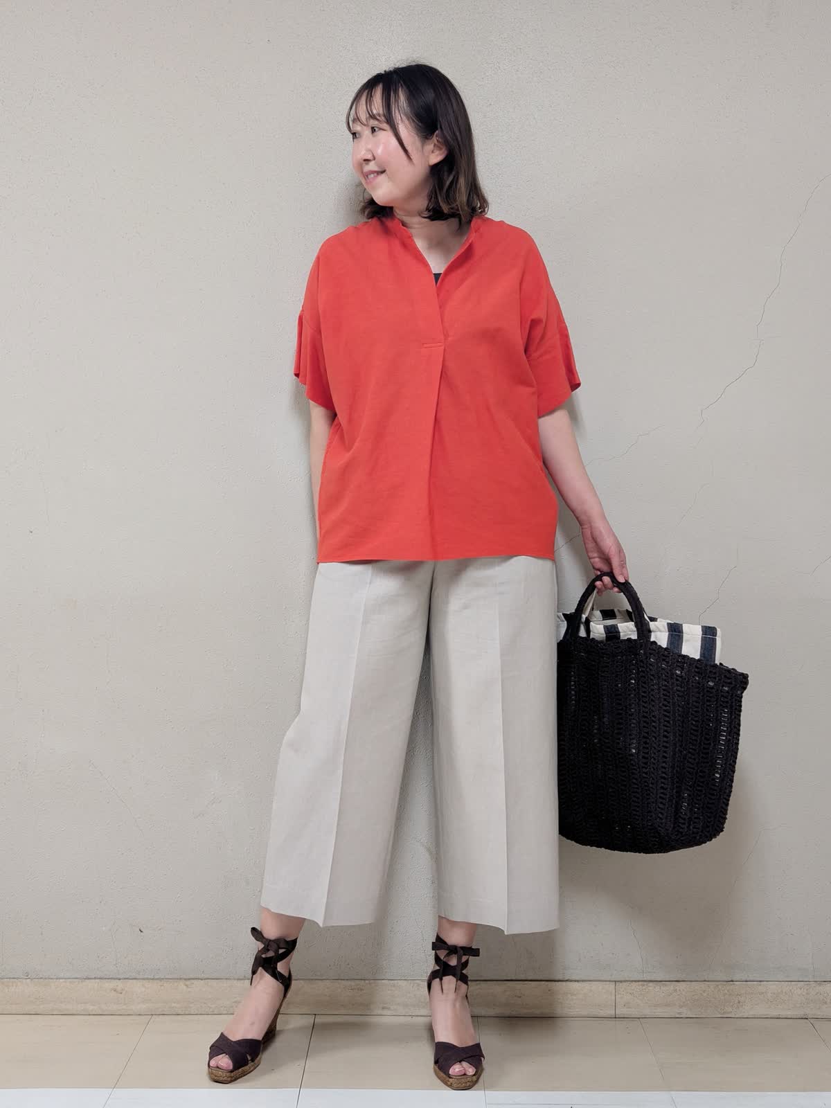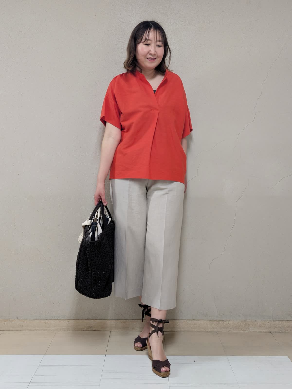 【着用サイズ】ブラウス:フリー キャミソール:11号 パンツ:13号【着用カラー】ブラウス:シュイロ パンツ:ベージュ キャミソール、バッグ:チャコールグレー 初夏のお出かけコーディネートです。パッと着映えする鮮やかなシュイロのブラウス。リネン混でナチュラルな風合いが、季節感もあり素敵です。インナーにサテン切替のキャミソールをちら見せしてアクセントにしました。上下でセットアップになりますが、パンツはベージュを合わせて柔らかい雰囲気に。GWの旅行にもオススメです。