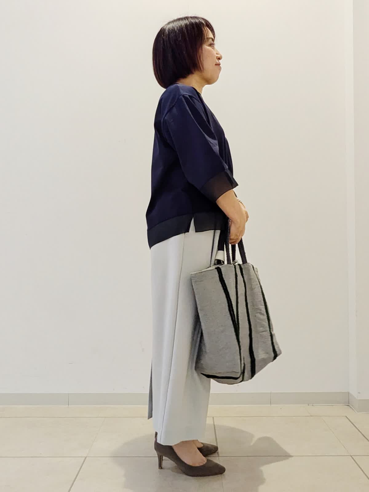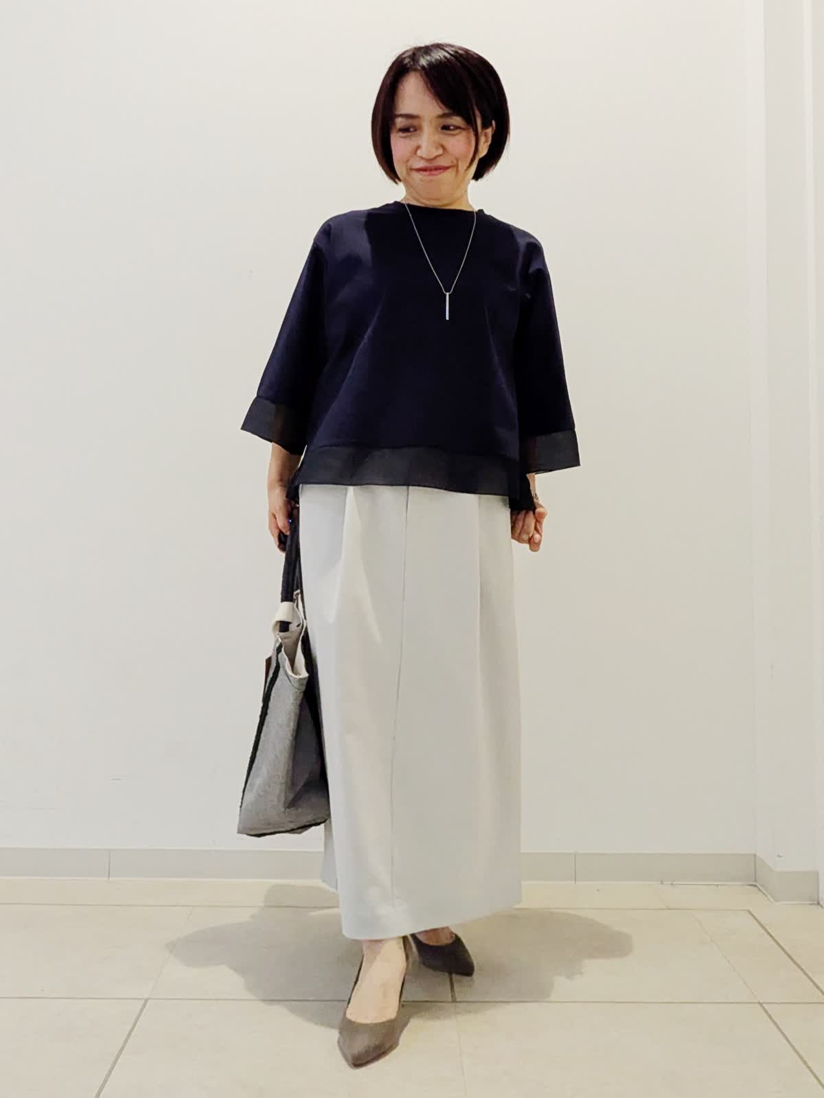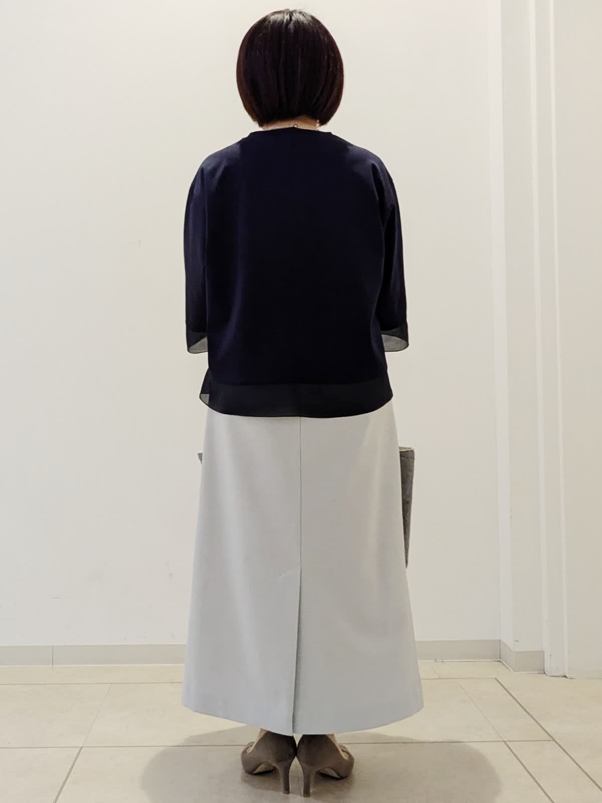 【着用サイズ】カットソー:フリー スカート:9号【着用カラー】カットソー:ネイビー スカート:グレー GWのお出かけコーデです。 カットソーは綿素材でひじが隠れる袖丈。袖口と裾がシアーになっているのがポイントです。着丈が短めなので、小柄な方でもバランスよく着ていただけます。スカートはストレッチ素材。ストレートラインで合わせやすいです。