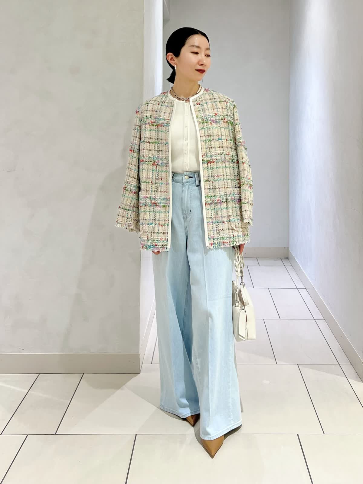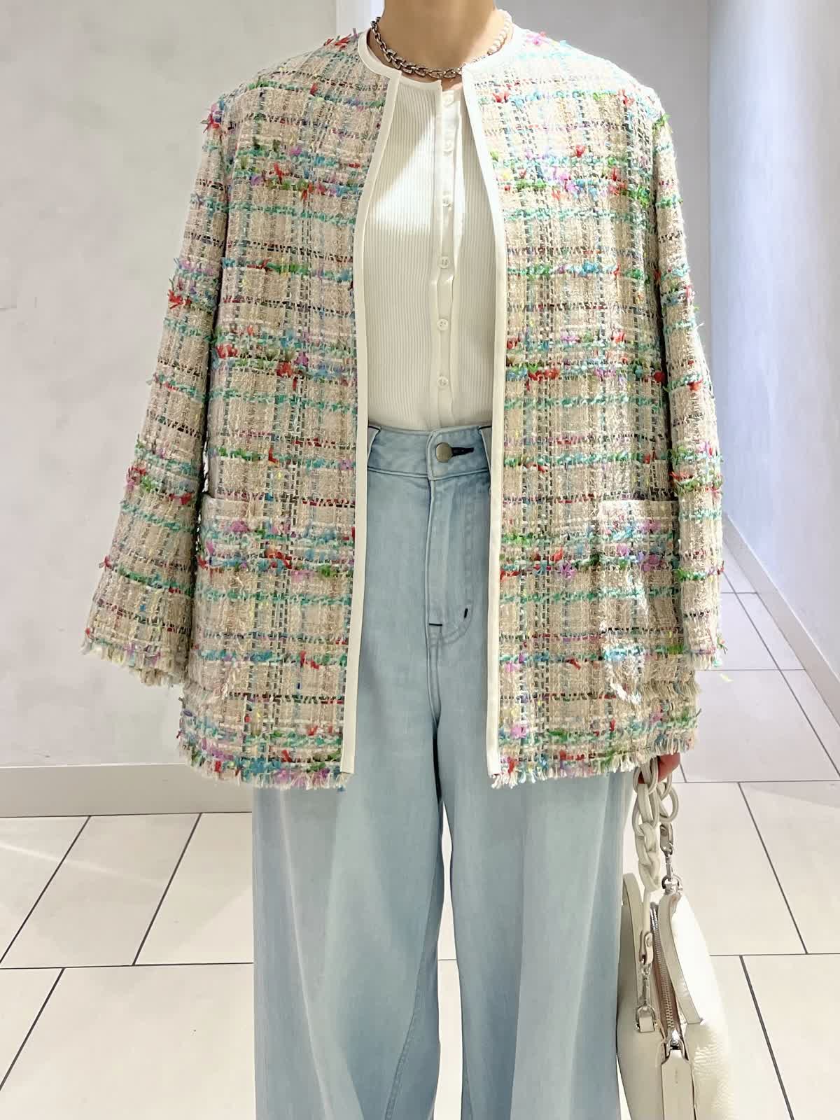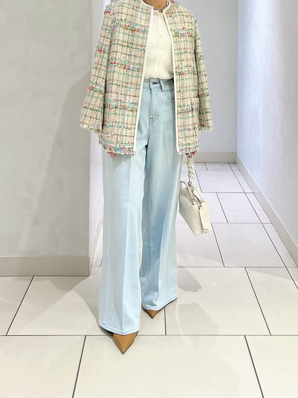 【カラー・サイズ】ジャケット:ベージュ・7号 ニット:オフホワイト・9号 パンツ:サックス・5号 華やかなツイードジャケットを主役にした、春らしいきれいめコーディネート。シンプルなブラウスと淡いサックスブルーのワイドデニムを合わせ、軽やかで上品な印象に仕上げました。