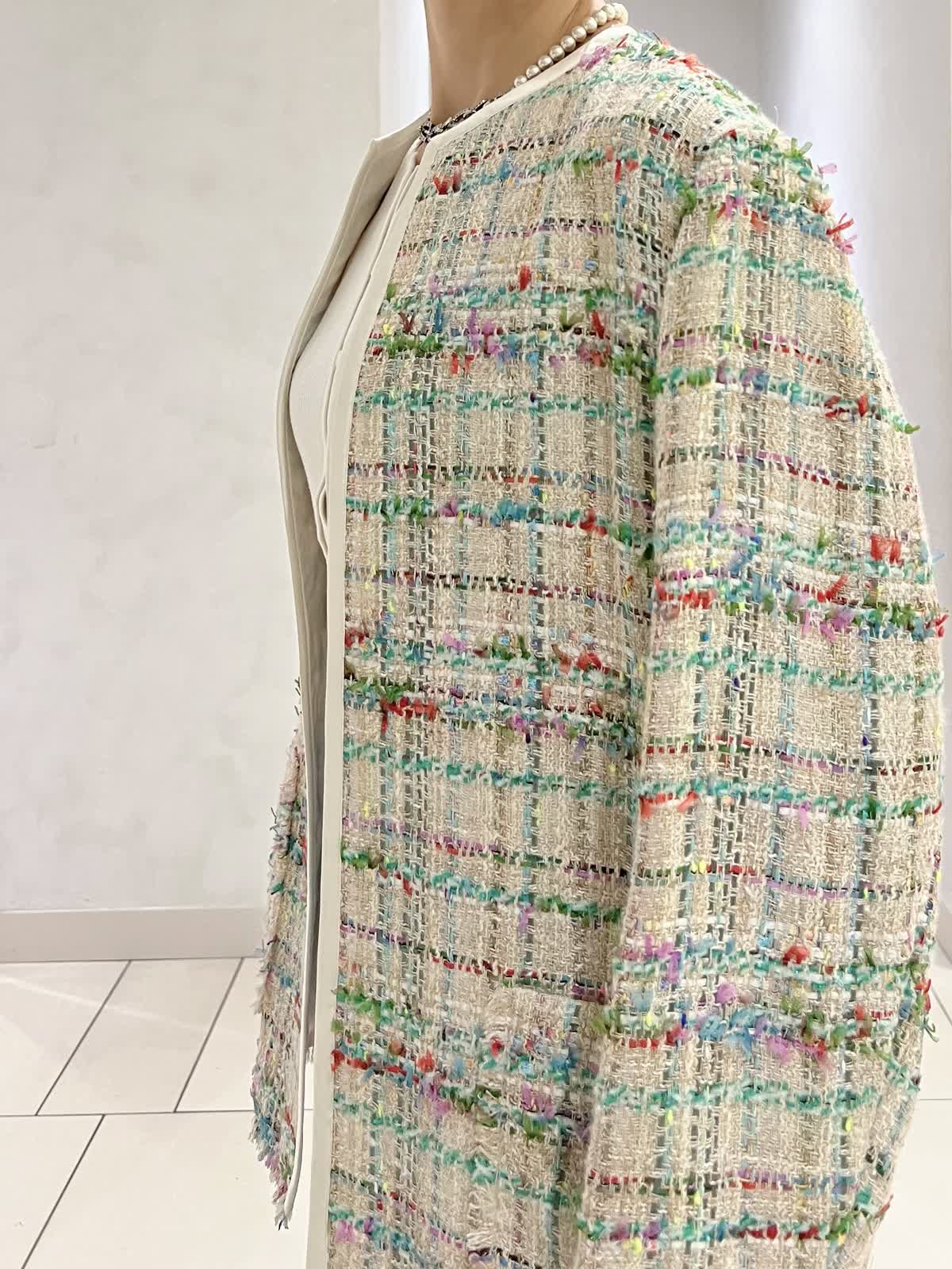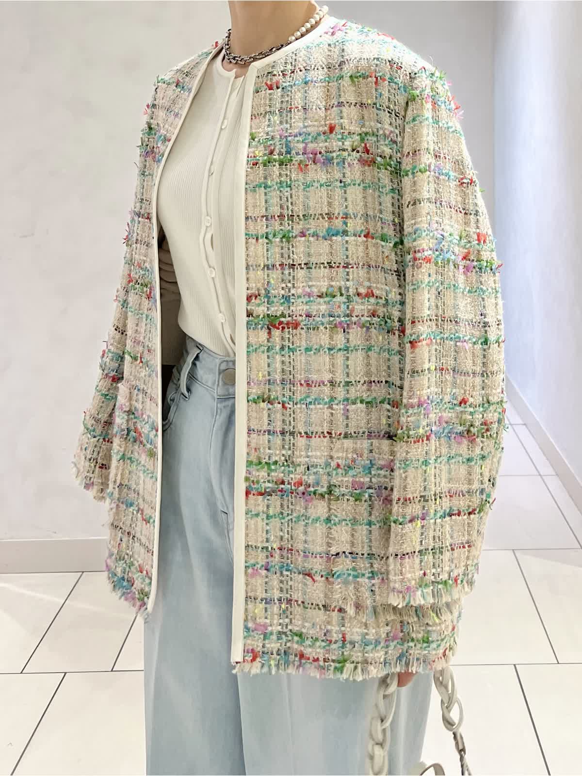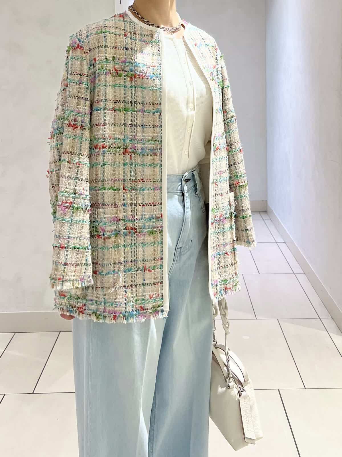 【カラー・サイズ】ジャケット:ベージュ・7号 ニット:オフホワイト・9号 パンツ:サックス・5号 華やかなツイードジャケットを主役にした、春らしいきれいめコーディネート。シンプルなブラウスと淡いサックスブルーのワイドデニムを合わせ、軽やかで上品な印象に仕上げました。