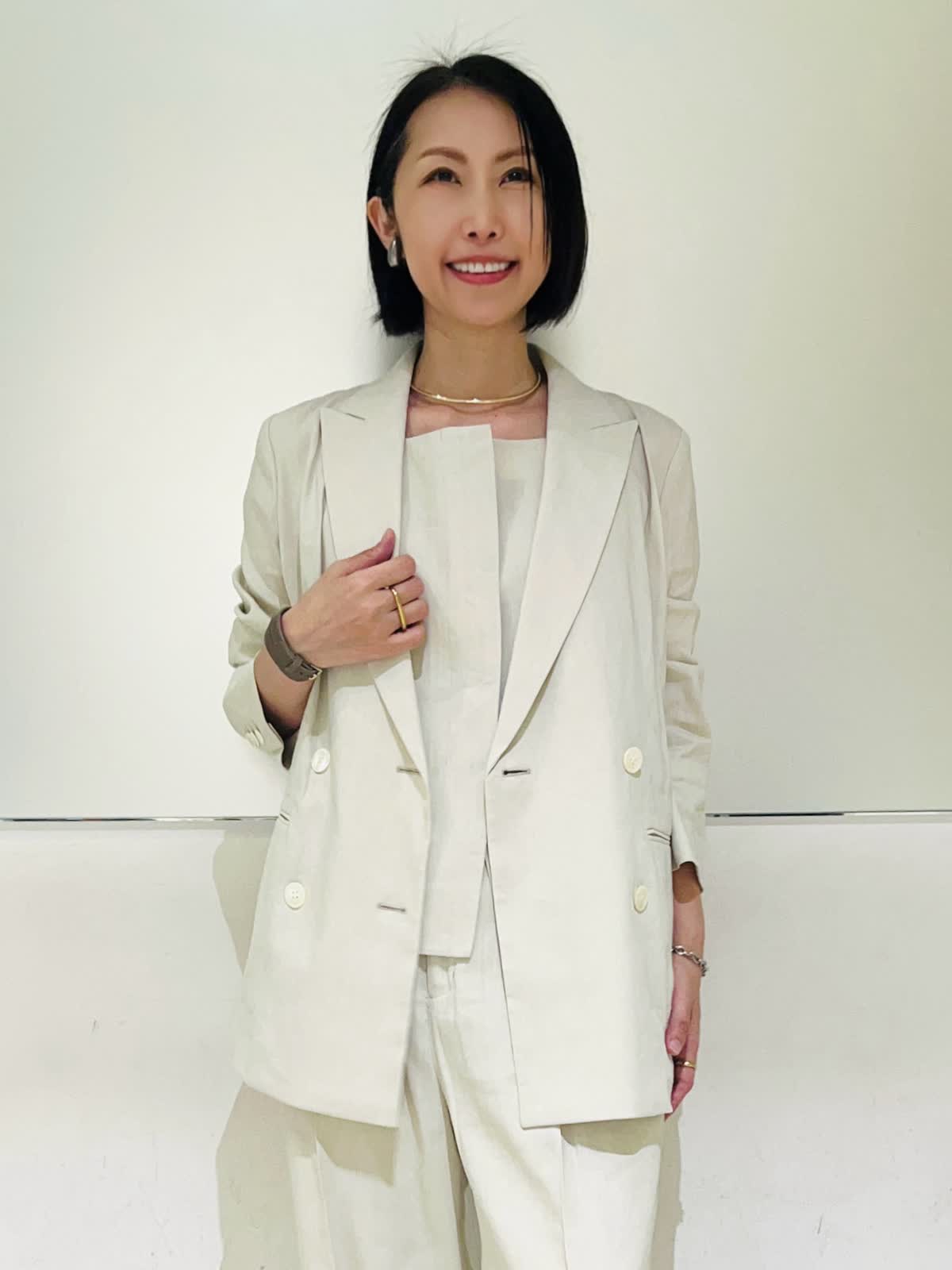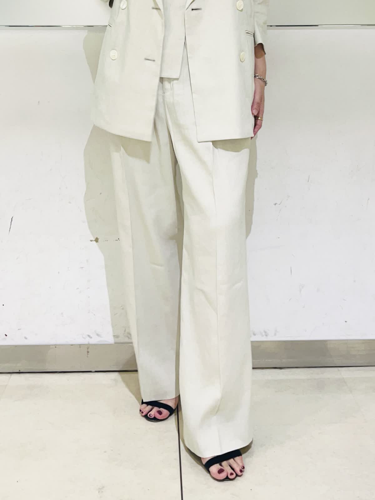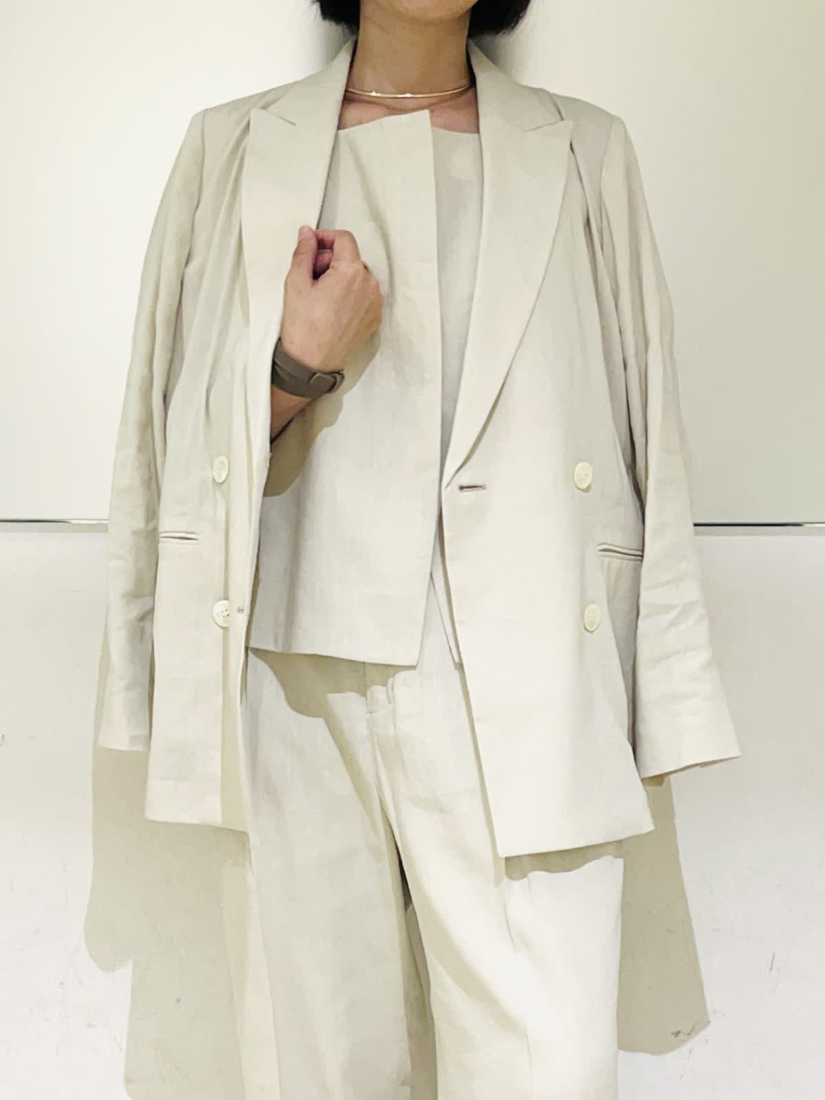 【着用アイテム/カラー】ジャケット、パンツ:9号/アイボリー 夏になると着たくなる白のセットアップ。柔らかなアイボリーの色味なら上下で着てもナチュラルで優しい印象になります。リネンのナチュラルな風合いがアイボリーの色味をよりひき立ててくれます。すっきりとしたダブルのジャケットとセミワイドのパンツの組み合わせで、明るい色でも膨張せずシャープなシルエットに仕上げてくれます。