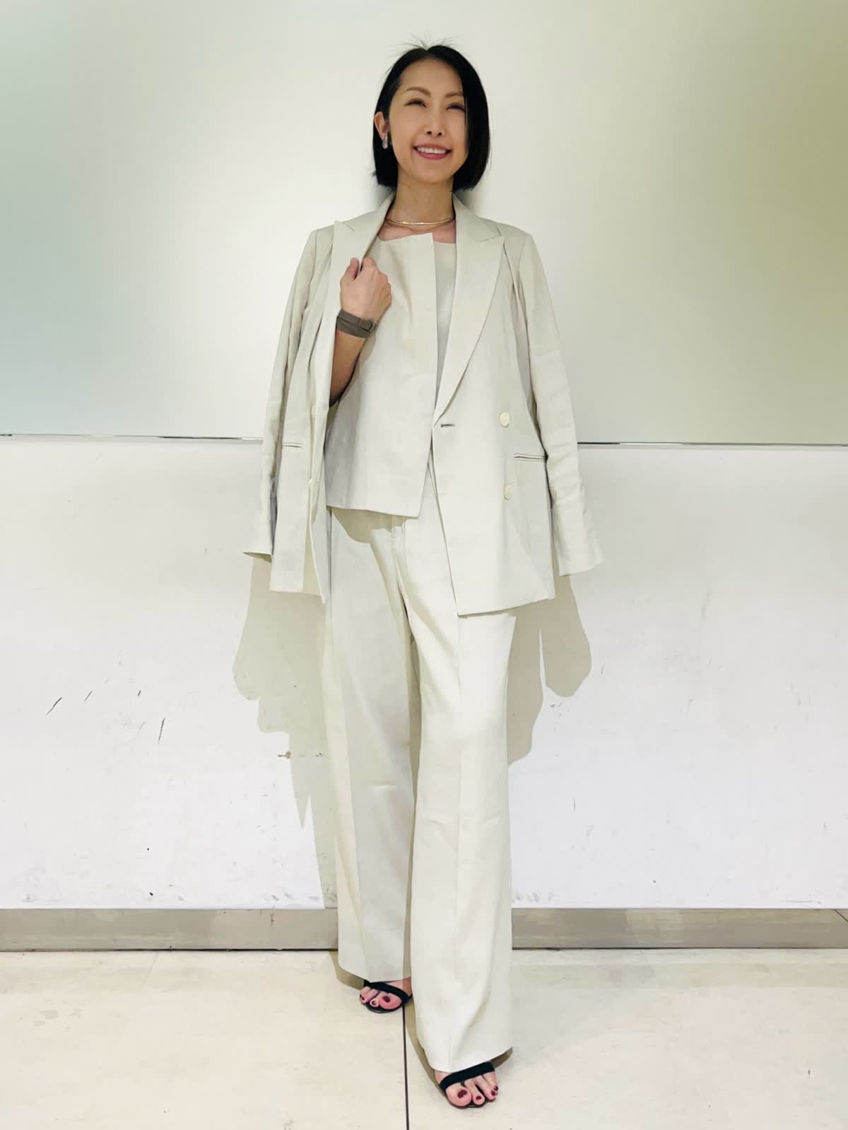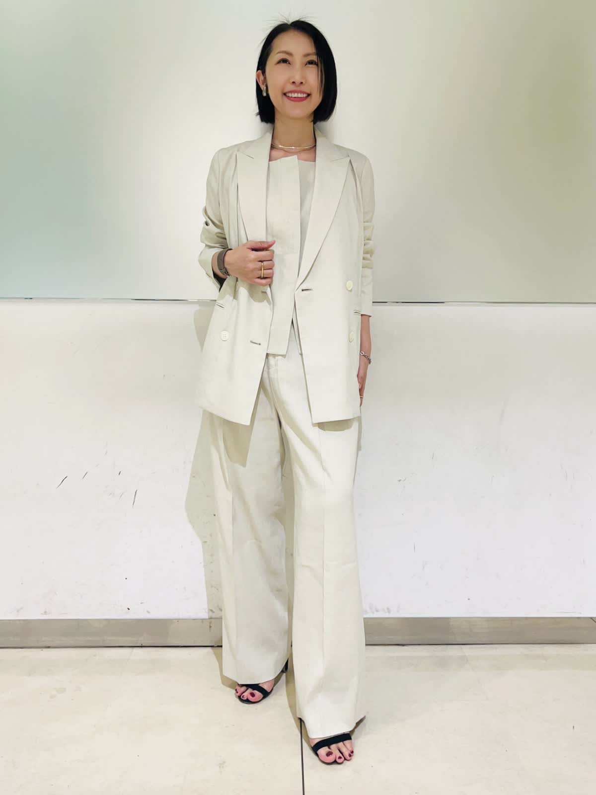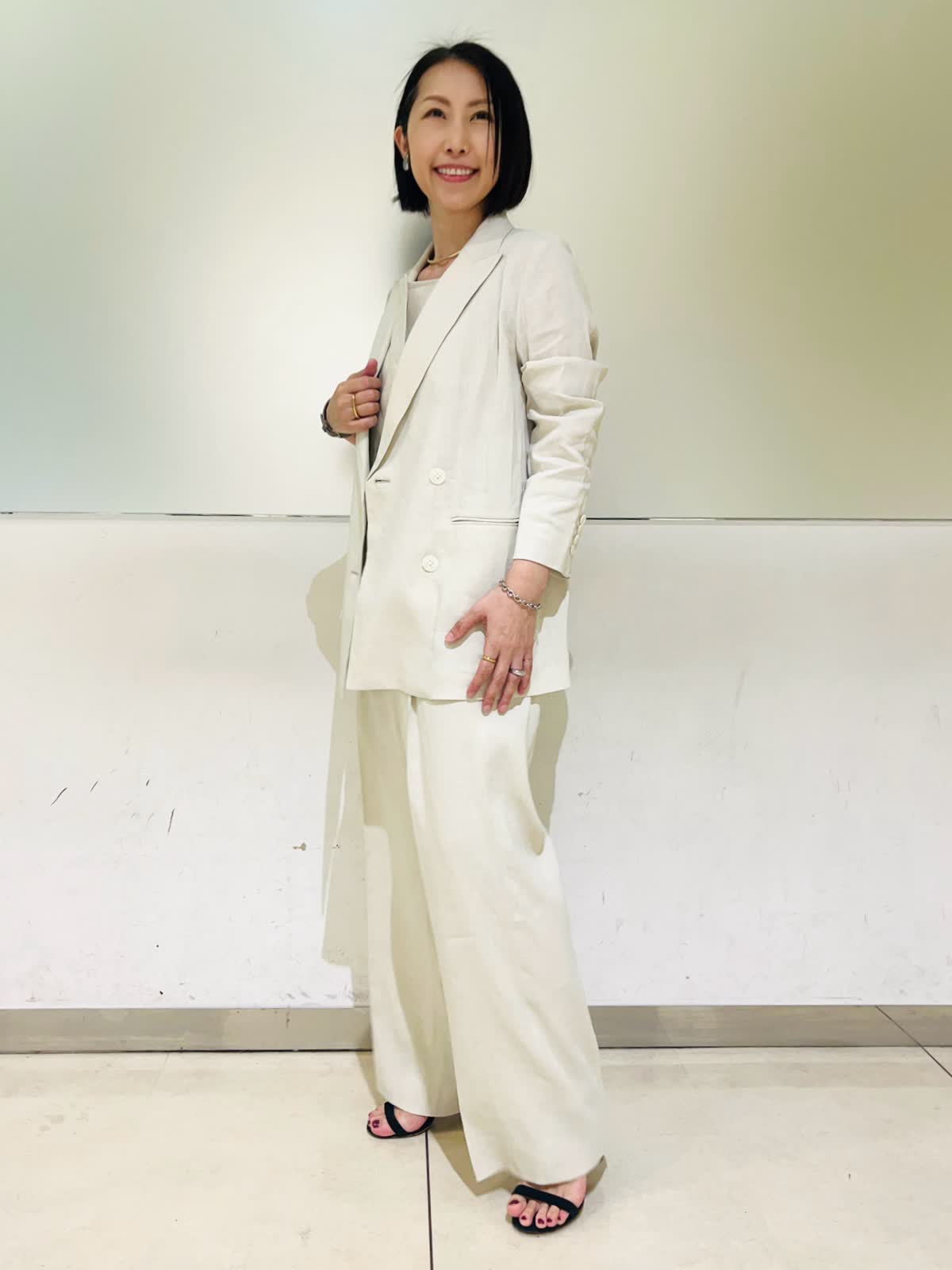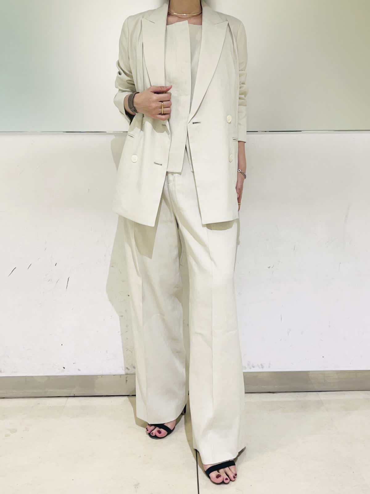 【着用アイテム/カラー】ジャケット、パンツ:9号/アイボリー 夏になると着たくなる白のセットアップ。柔らかなアイボリーの色味なら上下で着てもナチュラルで優しい印象になります。リネンのナチュラルな風合いがアイボリーの色味をよりひき立ててくれます。すっきりとしたダブルのジャケットとセミワイドのパンツの組み合わせで、明るい色でも膨張せずシャープなシルエットに仕上げてくれます。
