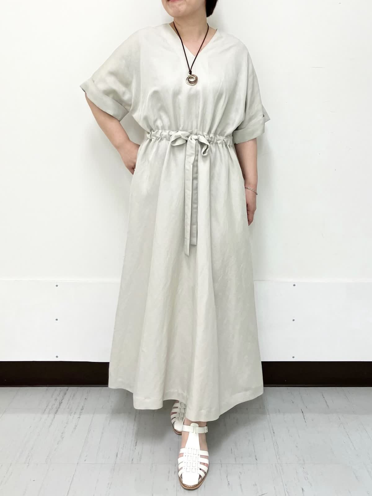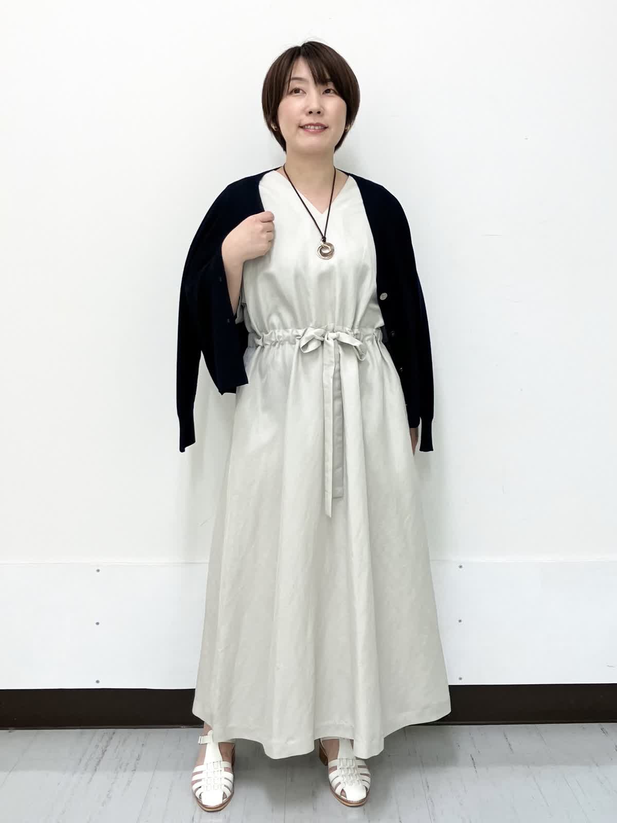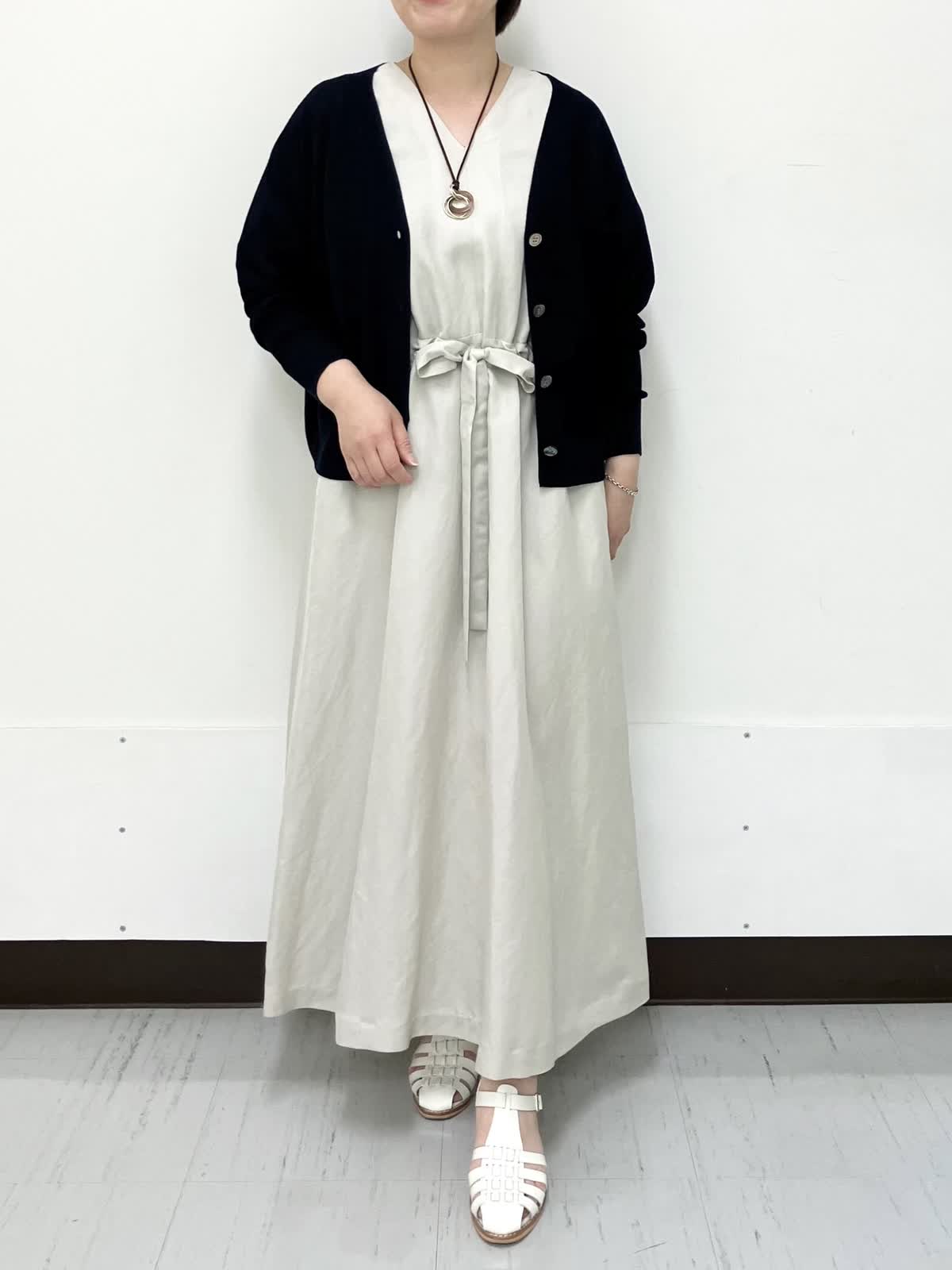 【着用サイズ】カーディガン:9号 ワンピース:フリーサイズ【着用カラー】カーディガン:ネイビー ワンピース:ベージュ GWお出かけコーデ。ナチュラルな風合いにキュプラ特有の光沢感が上品な印象のワンピース。ゆったり楽な着心地とすっきり見えるVネックやウエストギャザーがアクセントなり、GWのお出かけにぴったりのアイテムです。