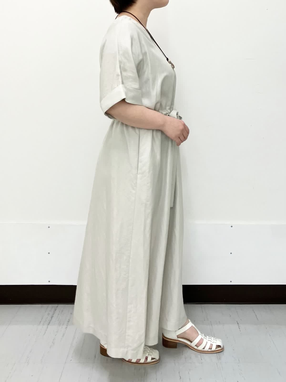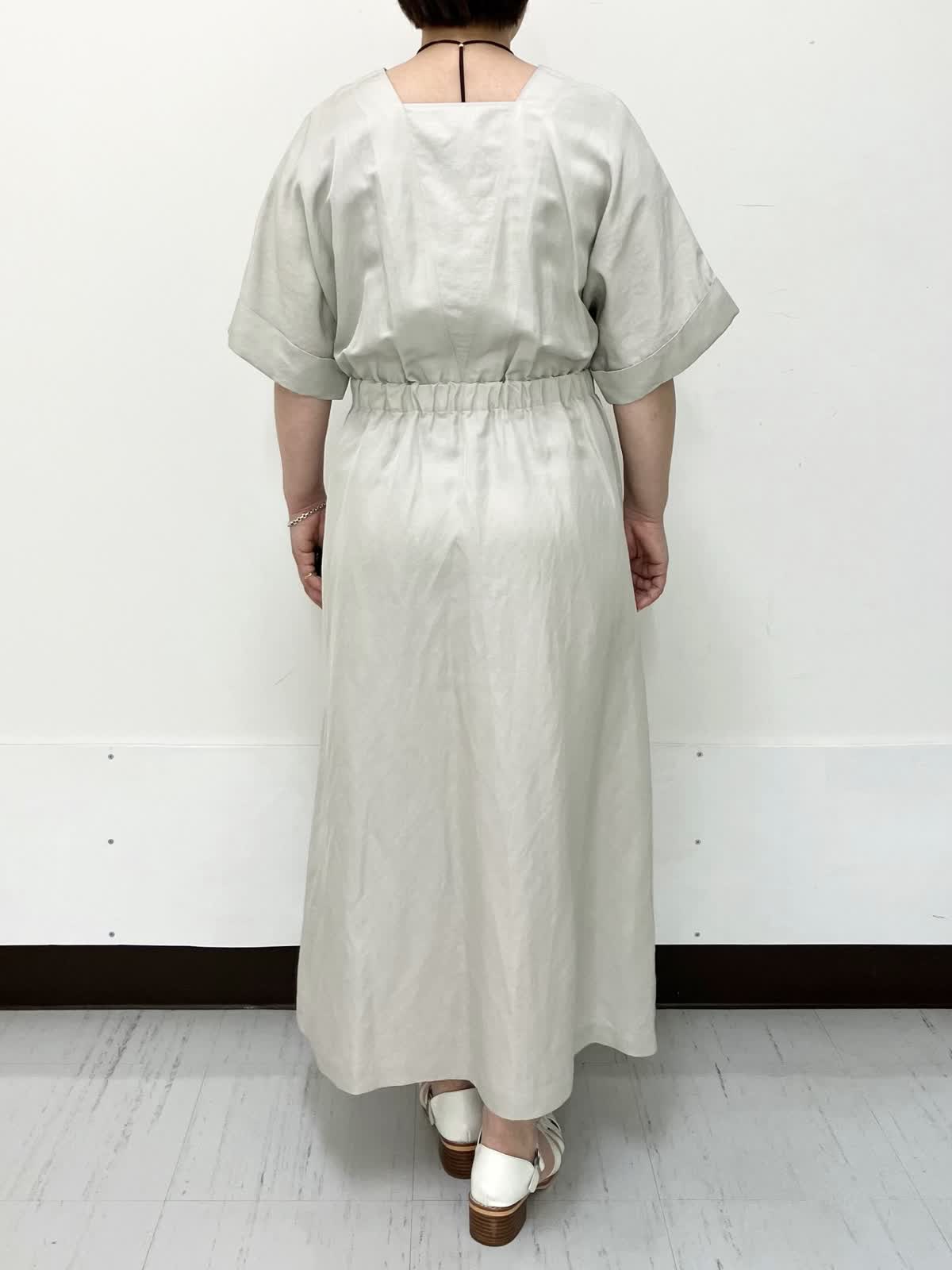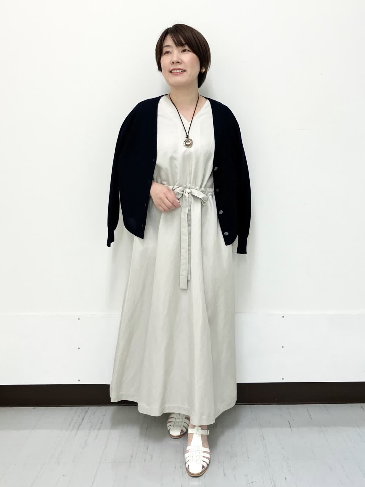 【着用サイズ】カーディガン:9号 ワンピース:フリーサイズ【着用カラー】カーディガン:ネイビー ワンピース:ベージュ GWお出かけコーデ。ナチュラルな風合いにキュプラ特有の光沢感が上品な印象のワンピース。ゆったり楽な着心地とすっきり見えるVネックやウエストギャザーがアクセントなり、GWのお出かけにぴったりのアイテムです。