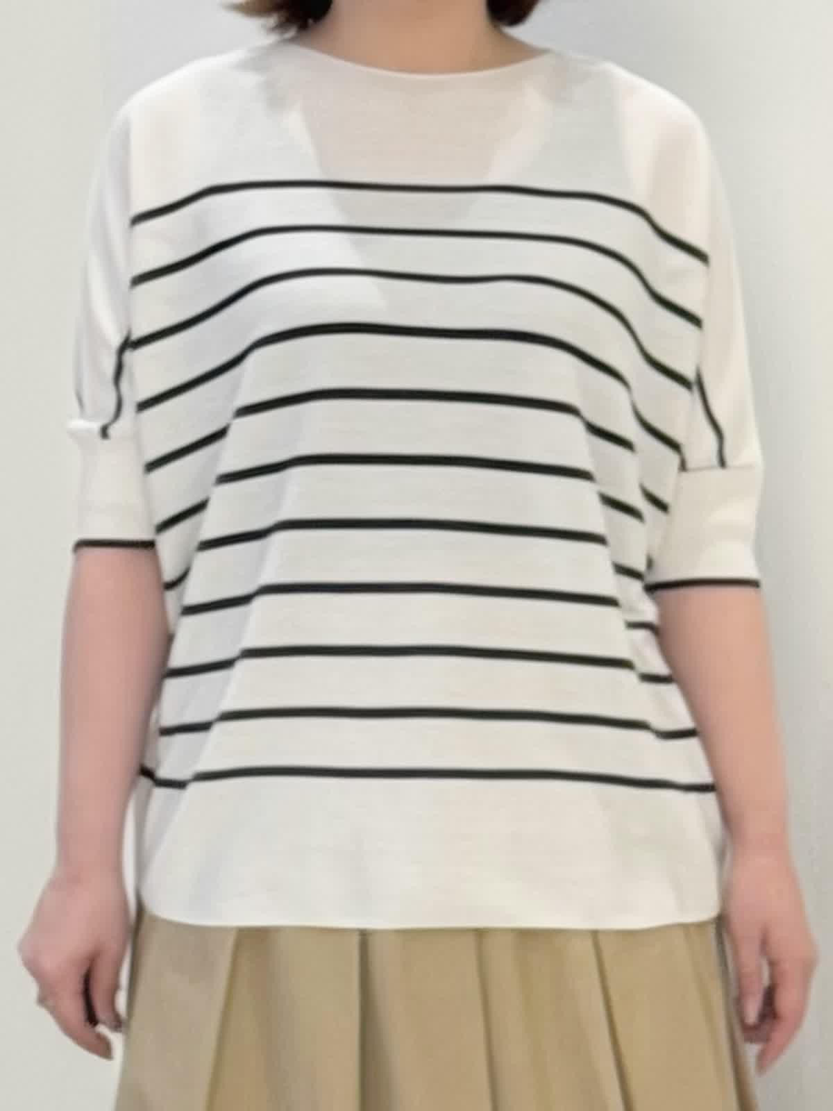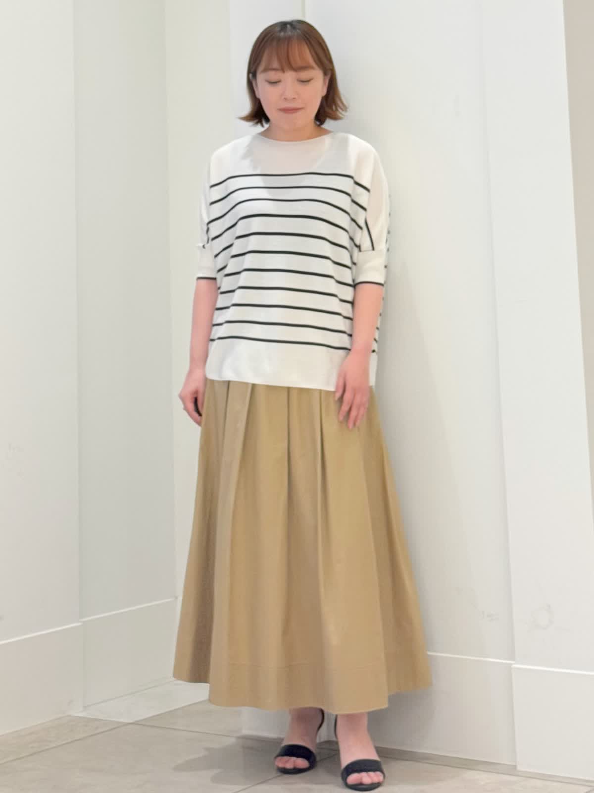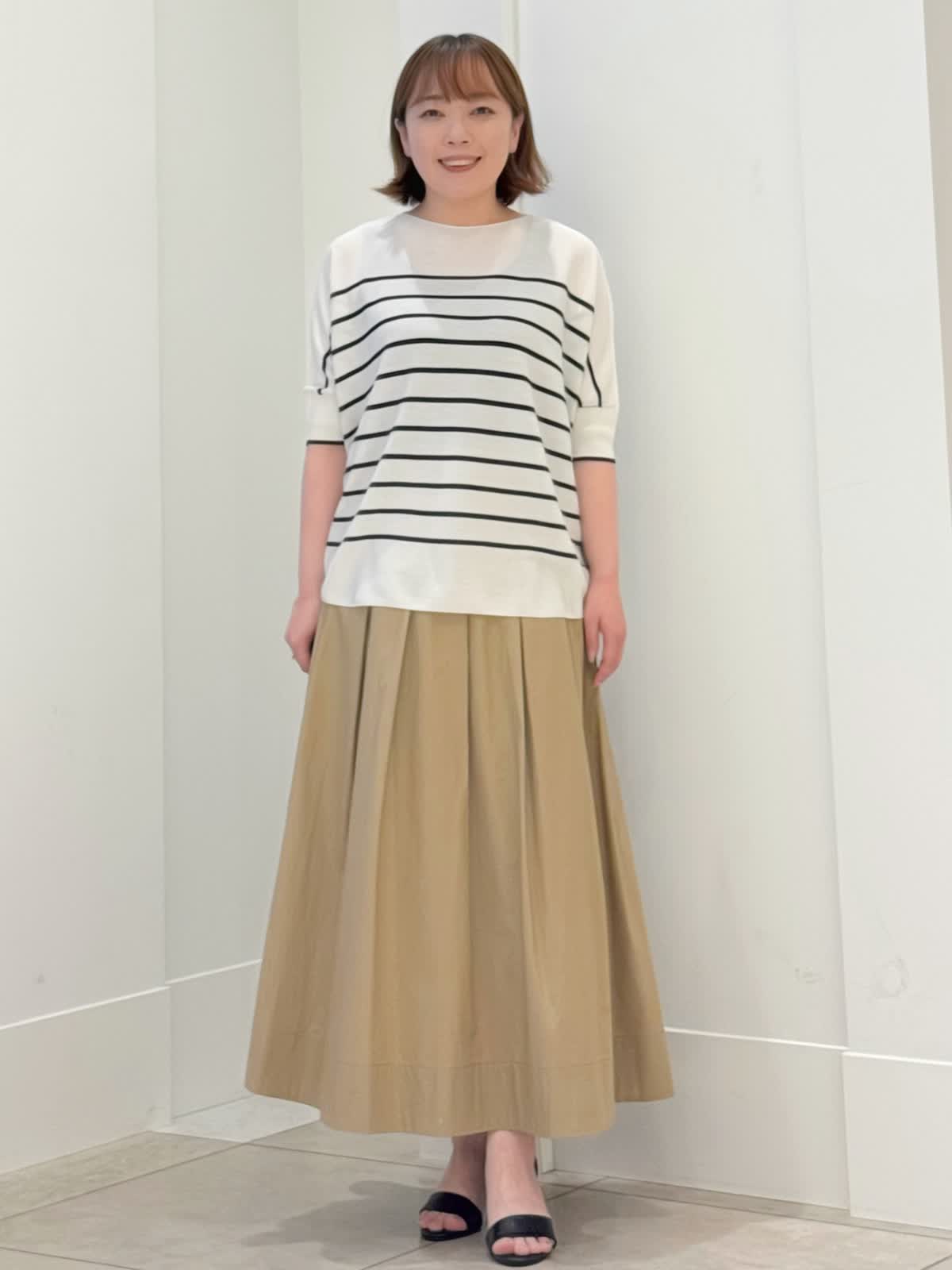 【着用カラー/サイズ】 ニット:グレーベージュ/フリー スカート:ベージュ/7号 定番のキュプラニットにボーダーが登場! とても肌触りがよくボディラインも拾いにくい1枚。肘が隠れる袖丈が安心です。 スカートはコットン素材でフレアシルエットが綺麗です。