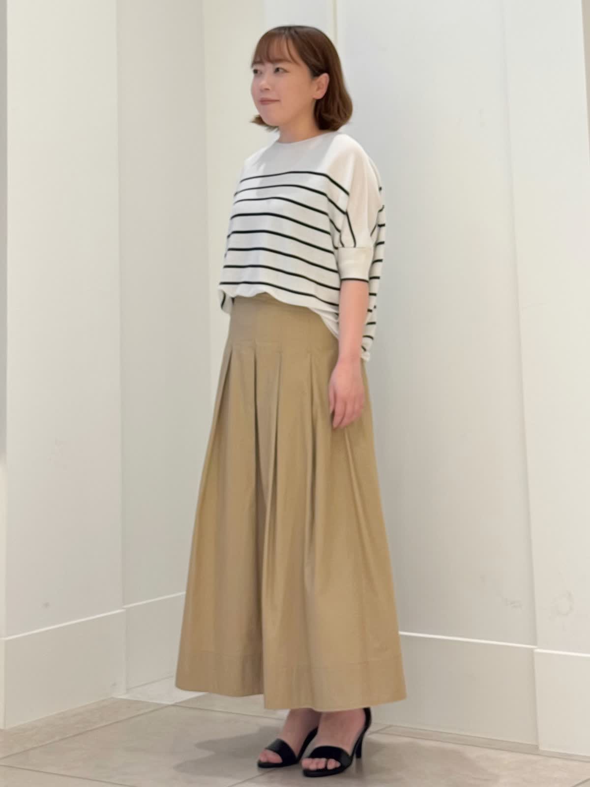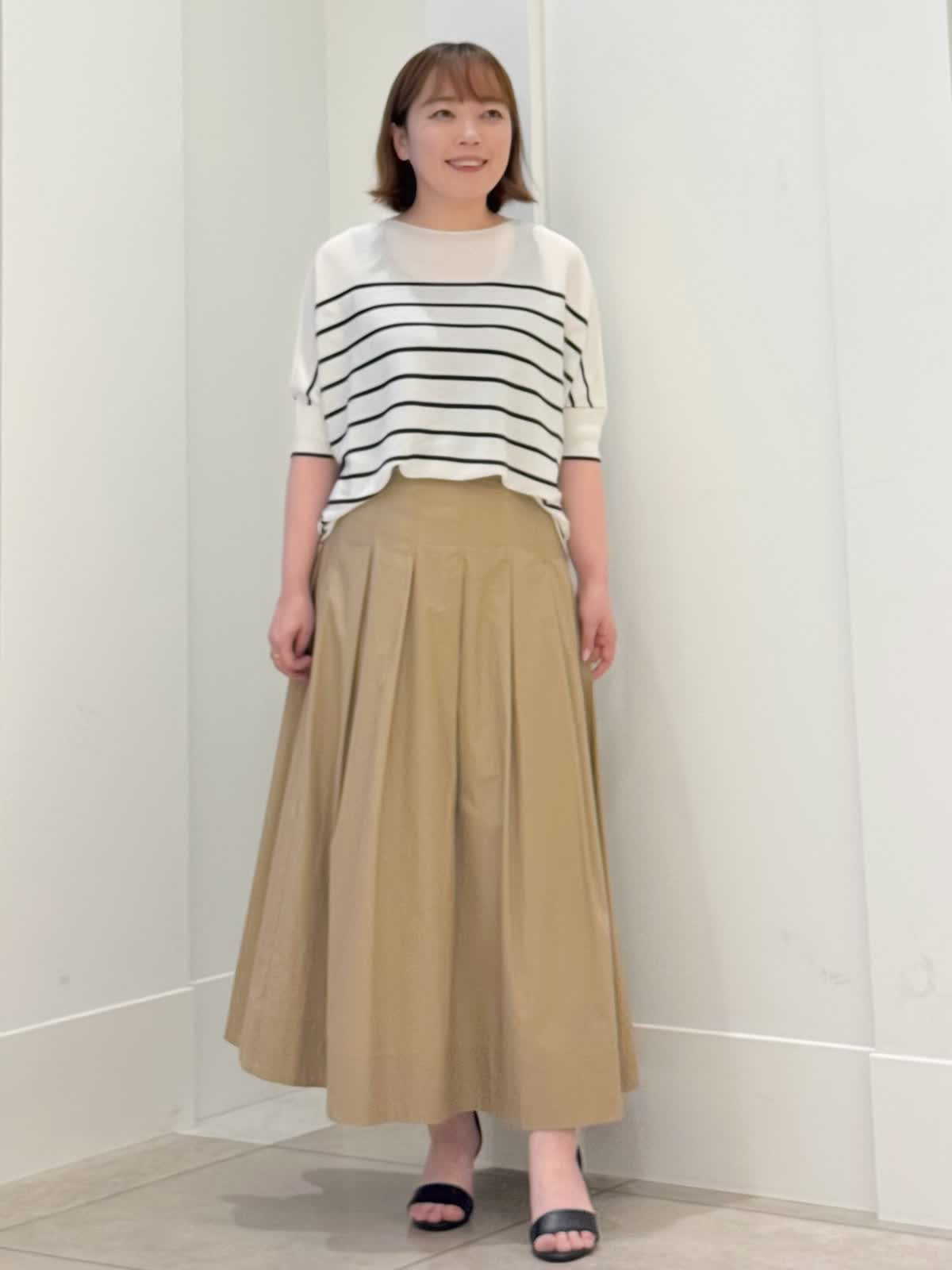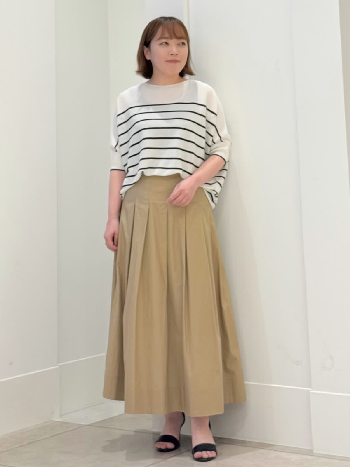 【着用カラー/サイズ】 ニット:グレーベージュ/フリー スカート:ベージュ/7号 定番のキュプラニットにボーダーが登場! とても肌触りがよくボディラインも拾いにくい1枚。肘が隠れる袖丈が安心です。 スカートはコットン素材でフレアシルエットが綺麗です。