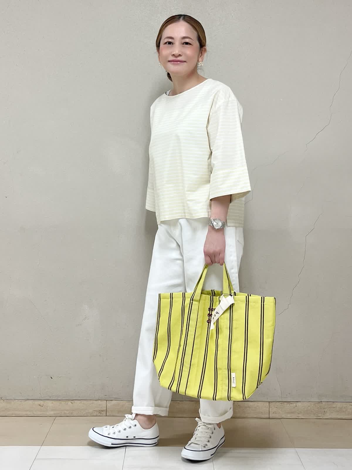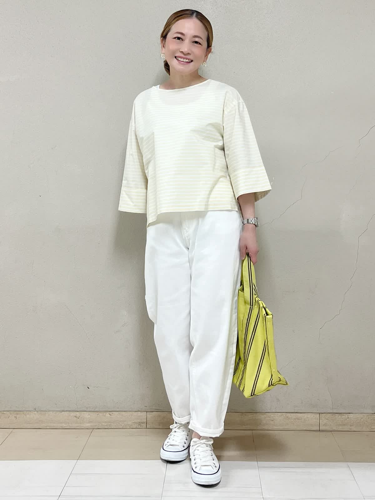 軽やかに動けて、ちゃんときれい見えも叶う大人カジュアルです。ゆったりシルエットで折り返しの袖はさりげなく二の腕カバーもしてくれます。裾はラフに揺れて抜け感もプラスしてくれます。ボトムはホワイトデニムで、全体を明るくクリーンな印象に。差し色のイエローバッグで、気分までパッと明るくしてみました。たくさん歩く日も、気負わずおしゃれ。そんな連休コーデです。
