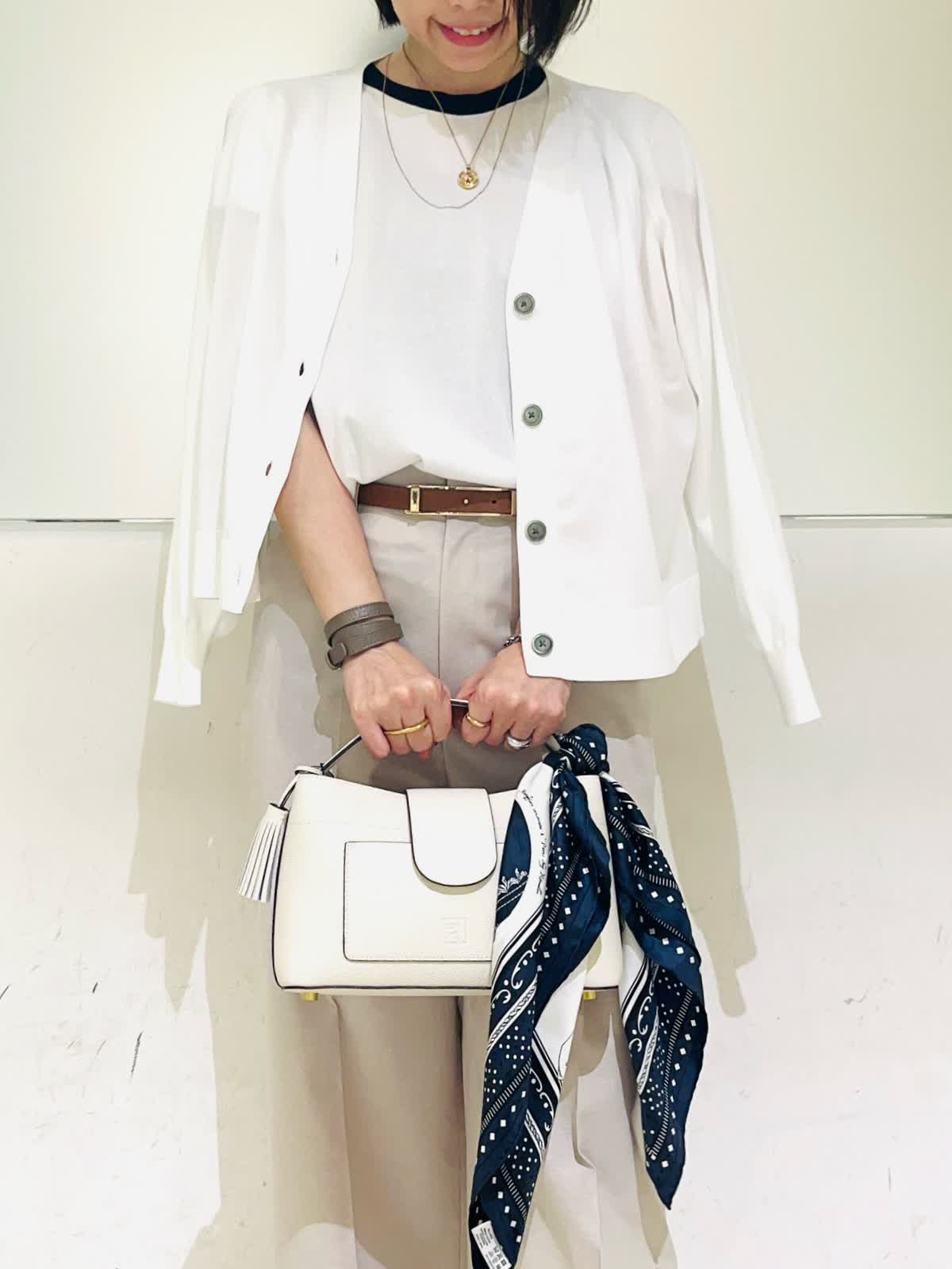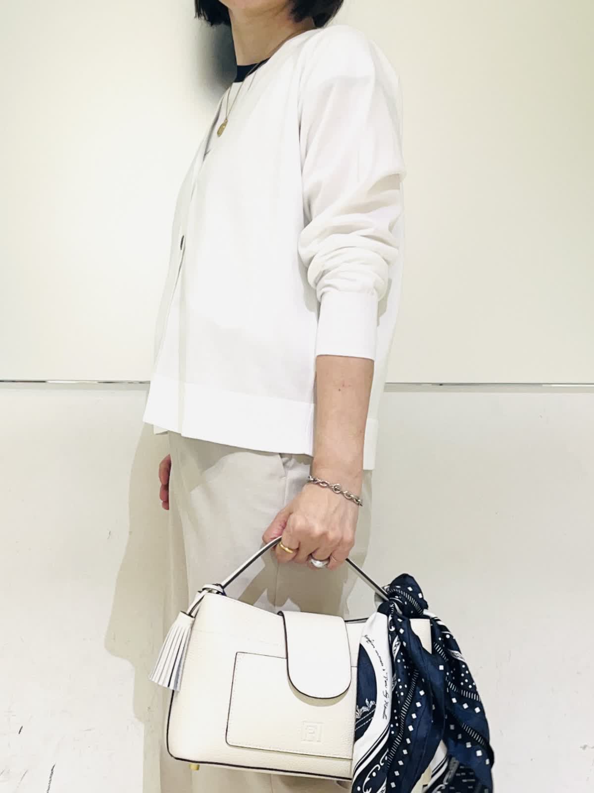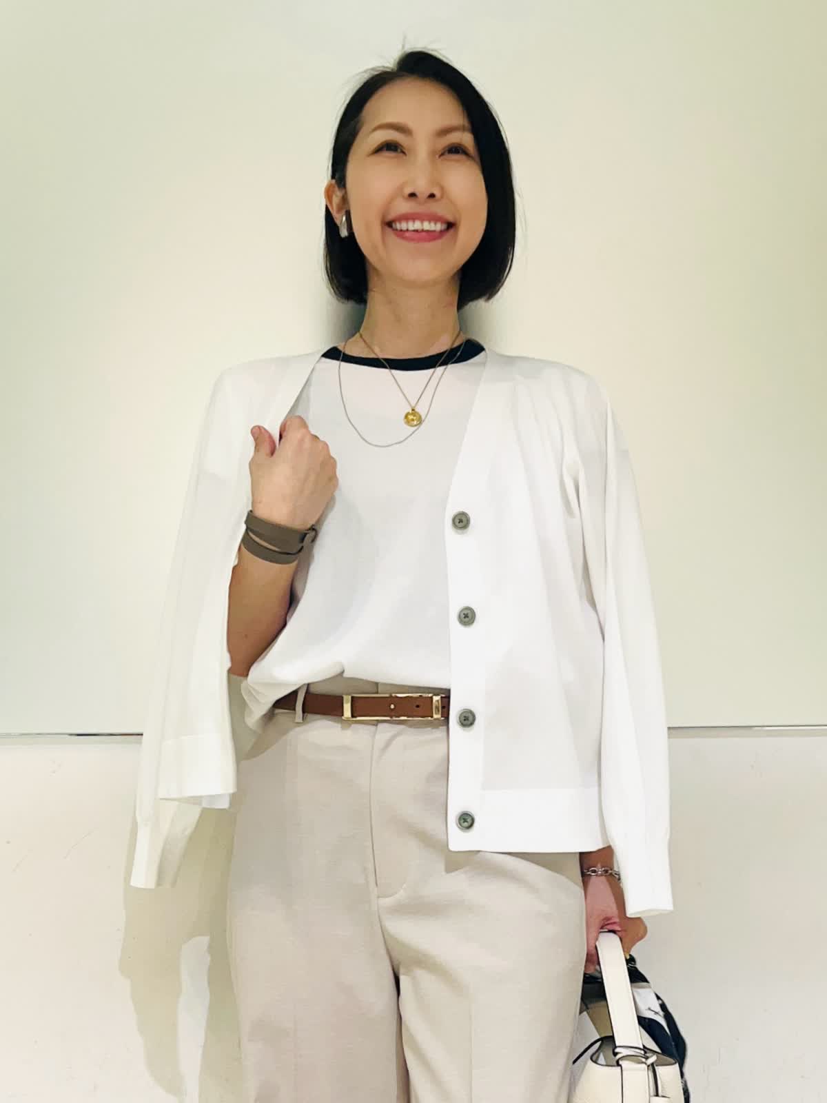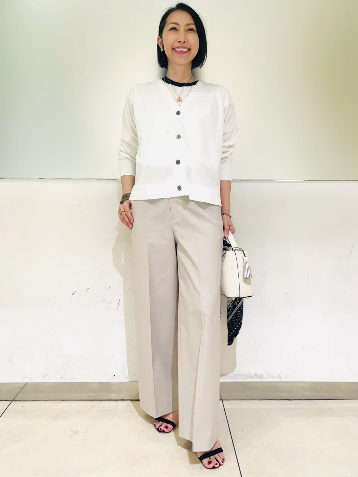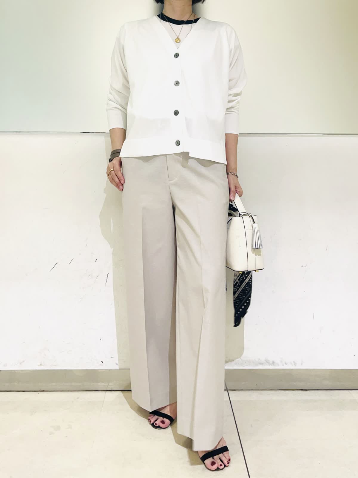 【着用アイテム】すべて9号 【着用カラー】カーディガン、ニット:オフホワイト パンツ:ベージュ 夏でも便利ないアンサンブルニット。シャリ感のある素材で涼しい着心地のニット。冷房が強くなるこれからの時期、カーディガンもあると便利です。インナーは首元と袖に配色をほどこしていて、1枚で着ても可愛いです。