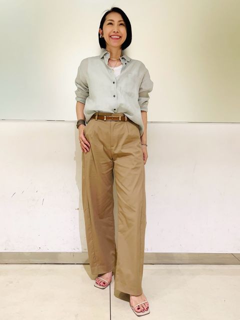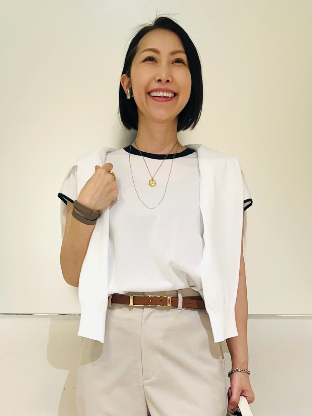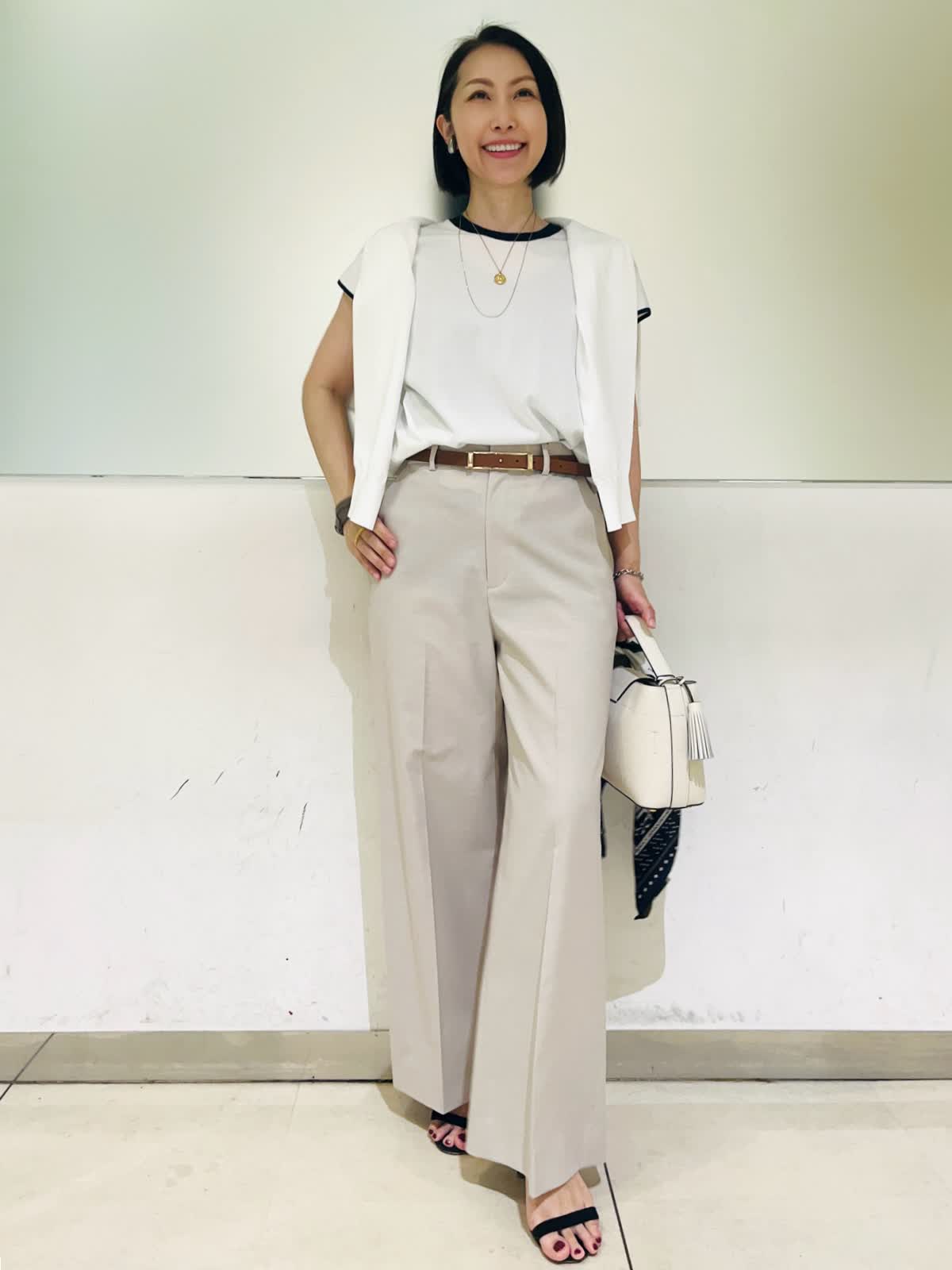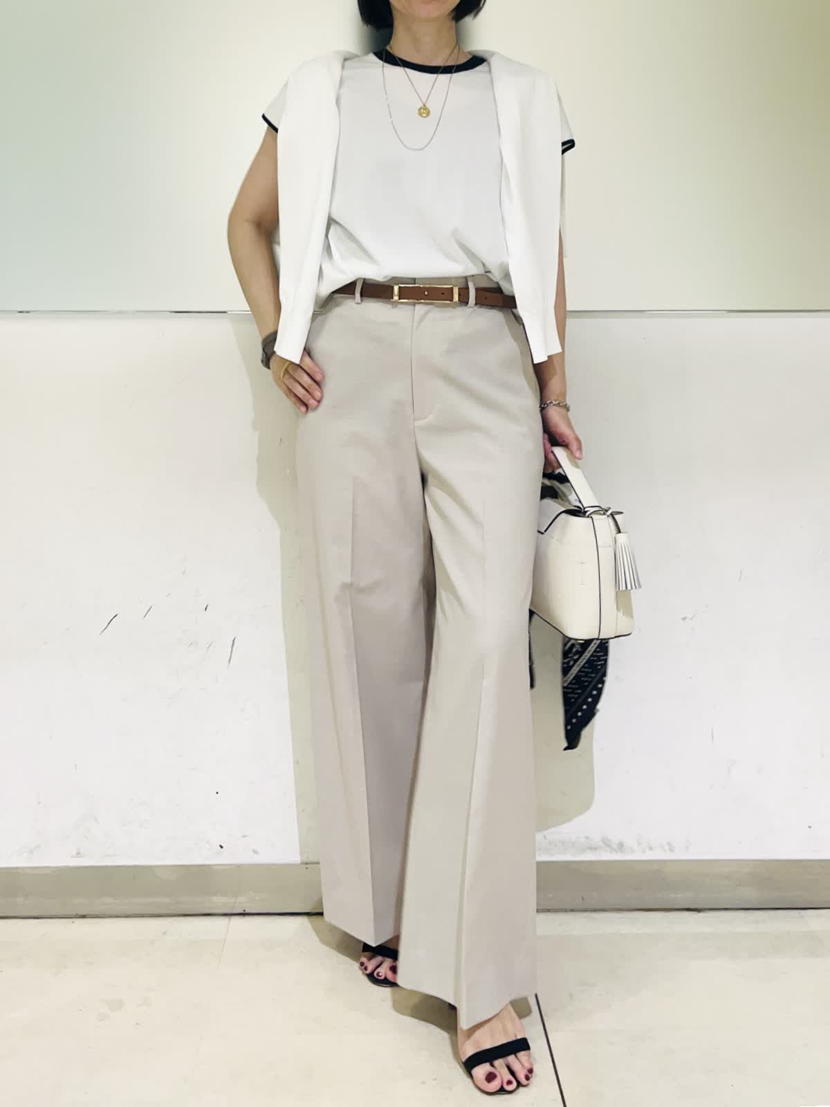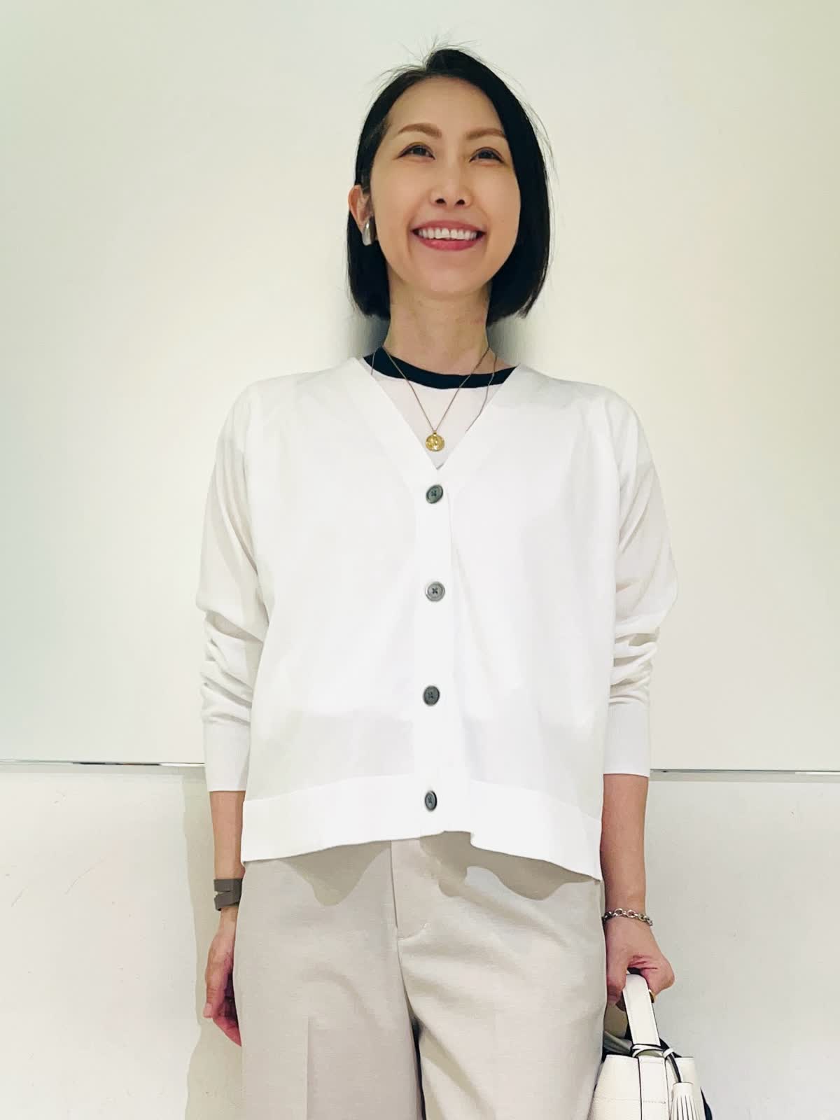 【着用アイテム】すべて9号 【着用カラー】カーディガン、ニット:オフホワイト パンツ:ベージュ 夏でも便利ないアンサンブルニット。シャリ感のある素材で涼しい着心地のニット。冷房が強くなるこれからの時期、カーディガンもあると便利です。インナーは首元と袖に配色をほどこしていて、1枚で着ても可愛いです。