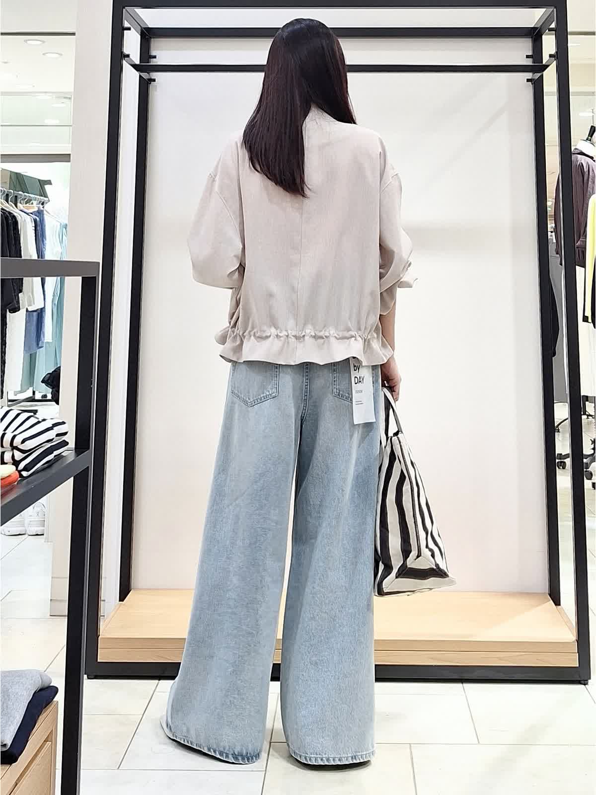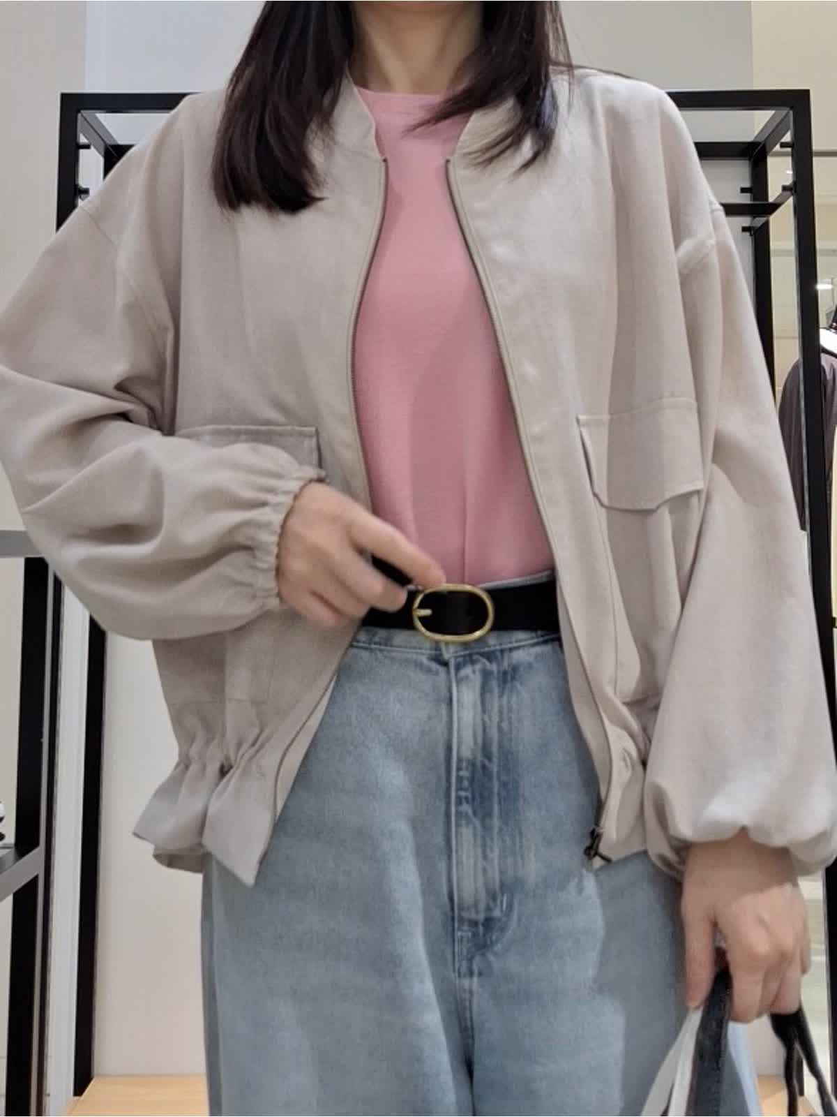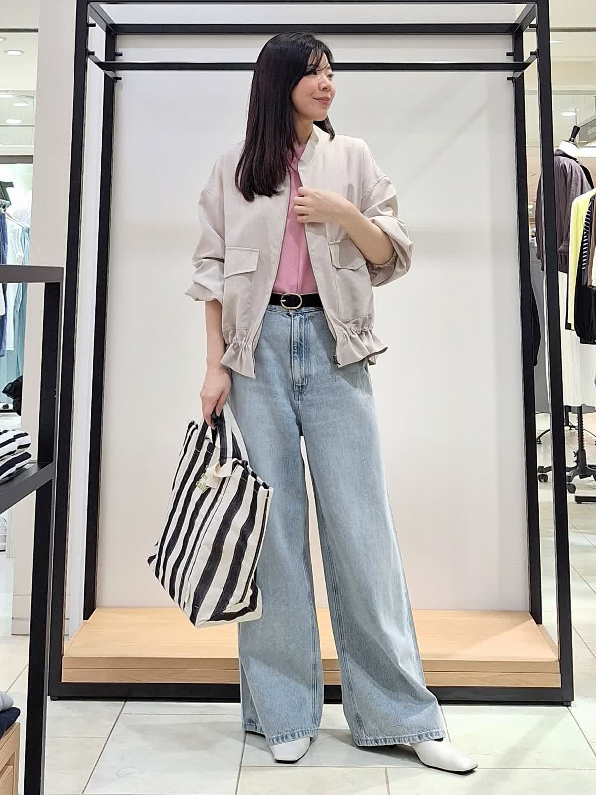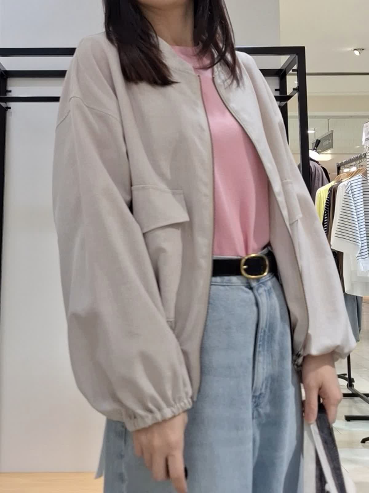 【着用サイズ、カラー】全て9号 ブルゾン:ベージュ カットソー、カーディガン:ピンク パンツ:サックス 《休日カジュアルSTYLE》薄地でシャツ感覚で着れるリネンライクブルゾン。裾の絞りや袖のブラウジングでアレンジを楽しめます♪インナーはピンクで明るく可愛げのある印象に。ボトムはワイドデニムパンツでカジュアルにコーディネートしました。GWのお出掛けカジュアルにもお勧めです。ぜひチェックしてみてね☆