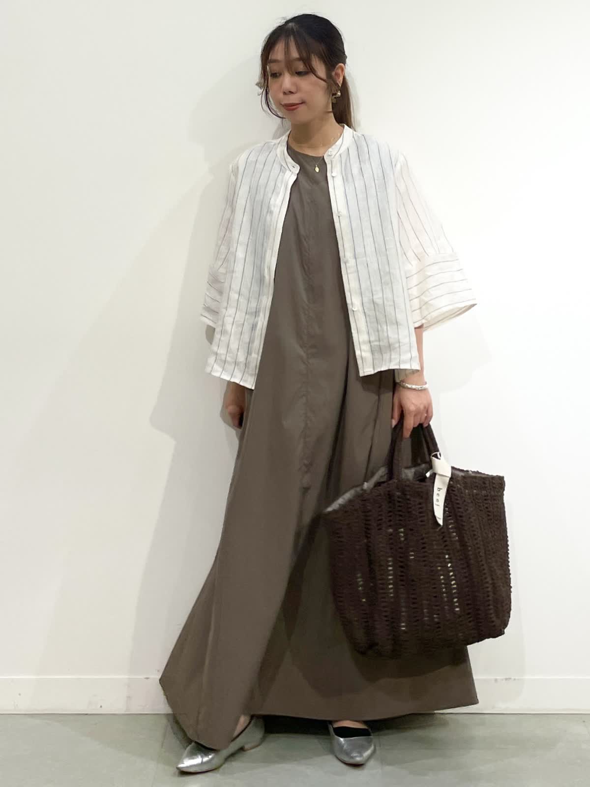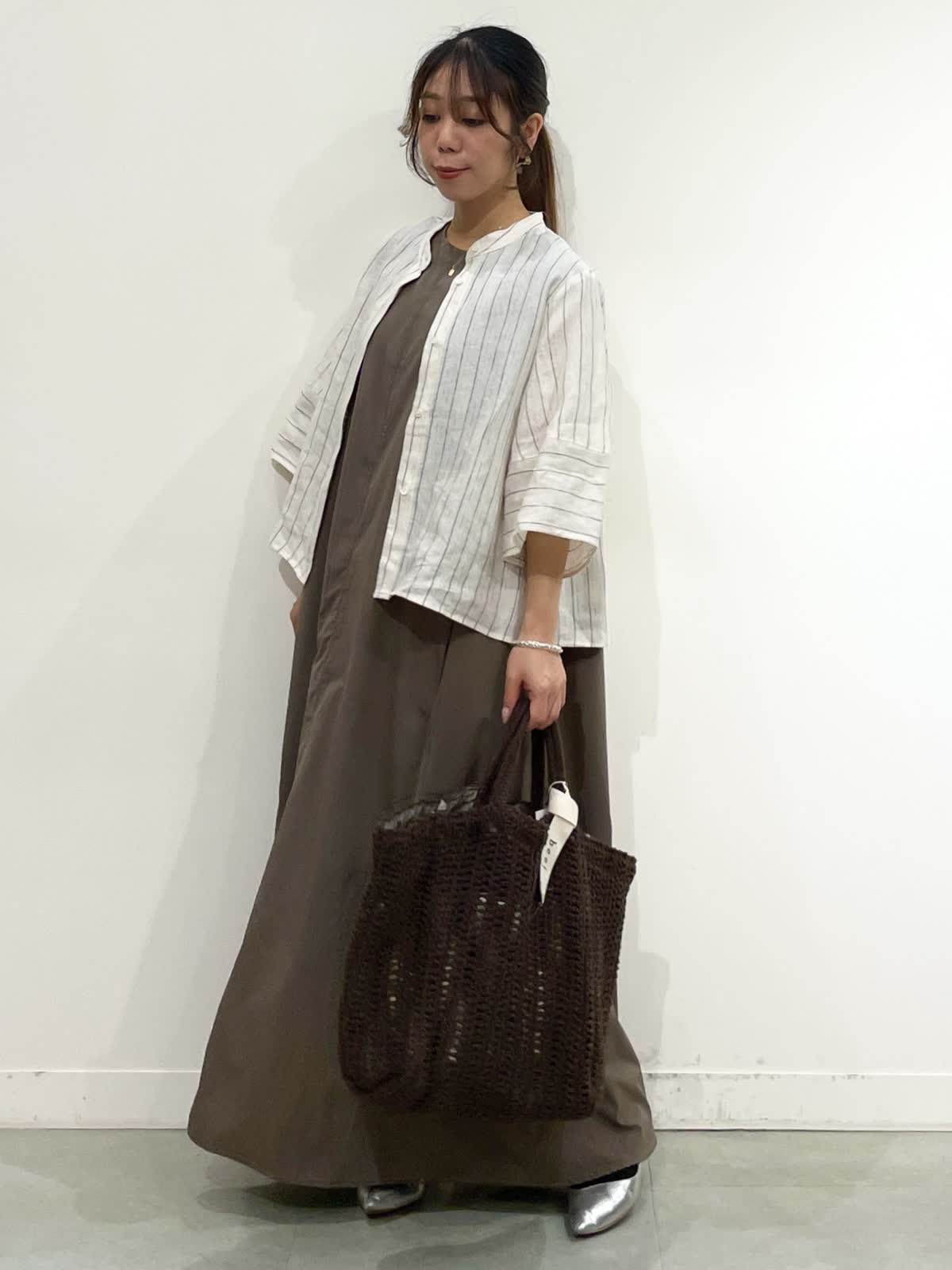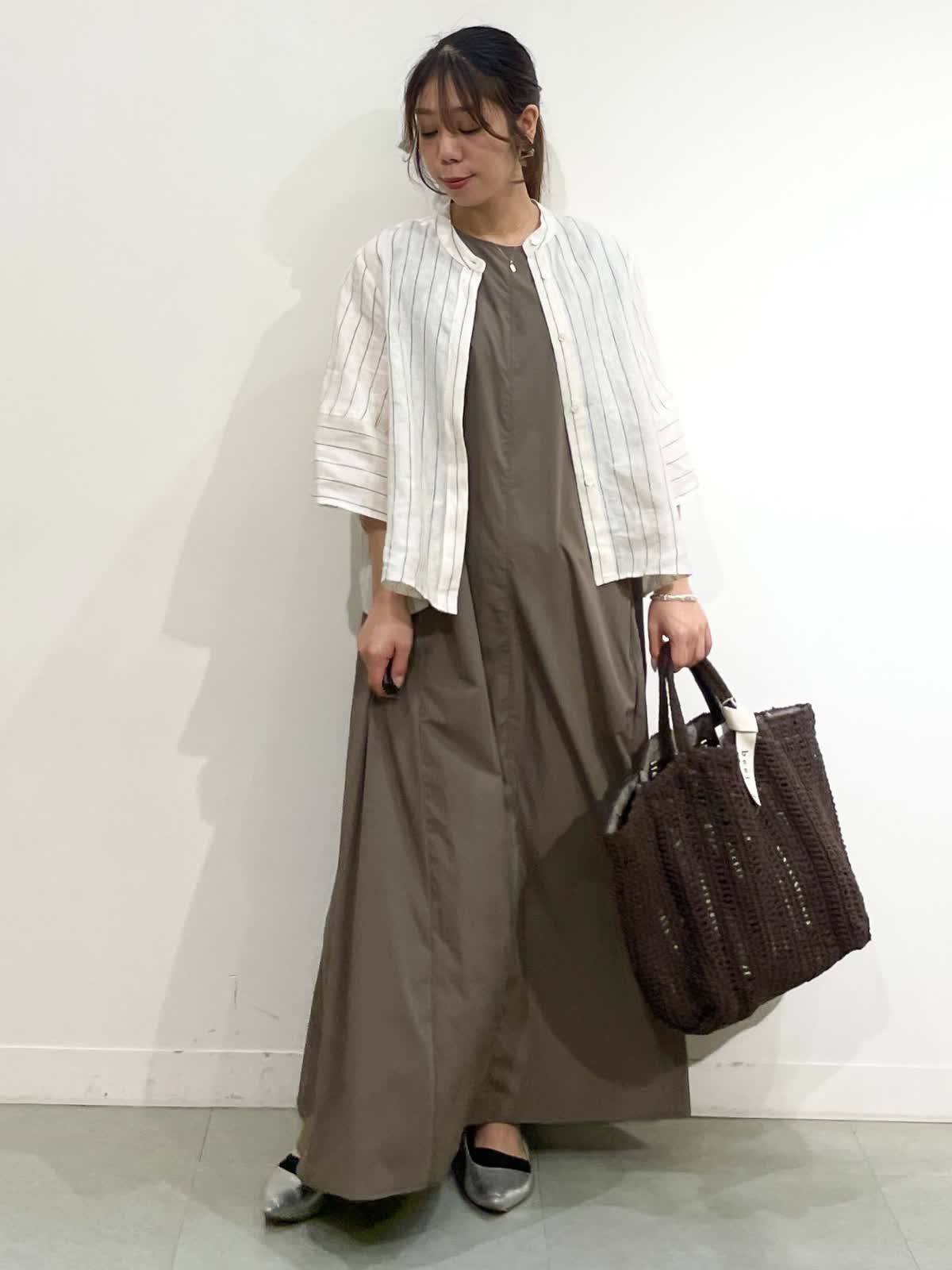 【着用サイズ】シャツ:9号 ワンピース:9号 シャツ:ストライプ/ワンピース:カーキ/バック:チャコールグレー リラックスしてお出かけの時や、足元を変えてBBQなど涼しく快適に過ごせるコーデ。シルエットが可愛い麻シャツ9号着てました。少しルーズな印象したい時ワンサイズアップも良いと感じたサイズ感でした。