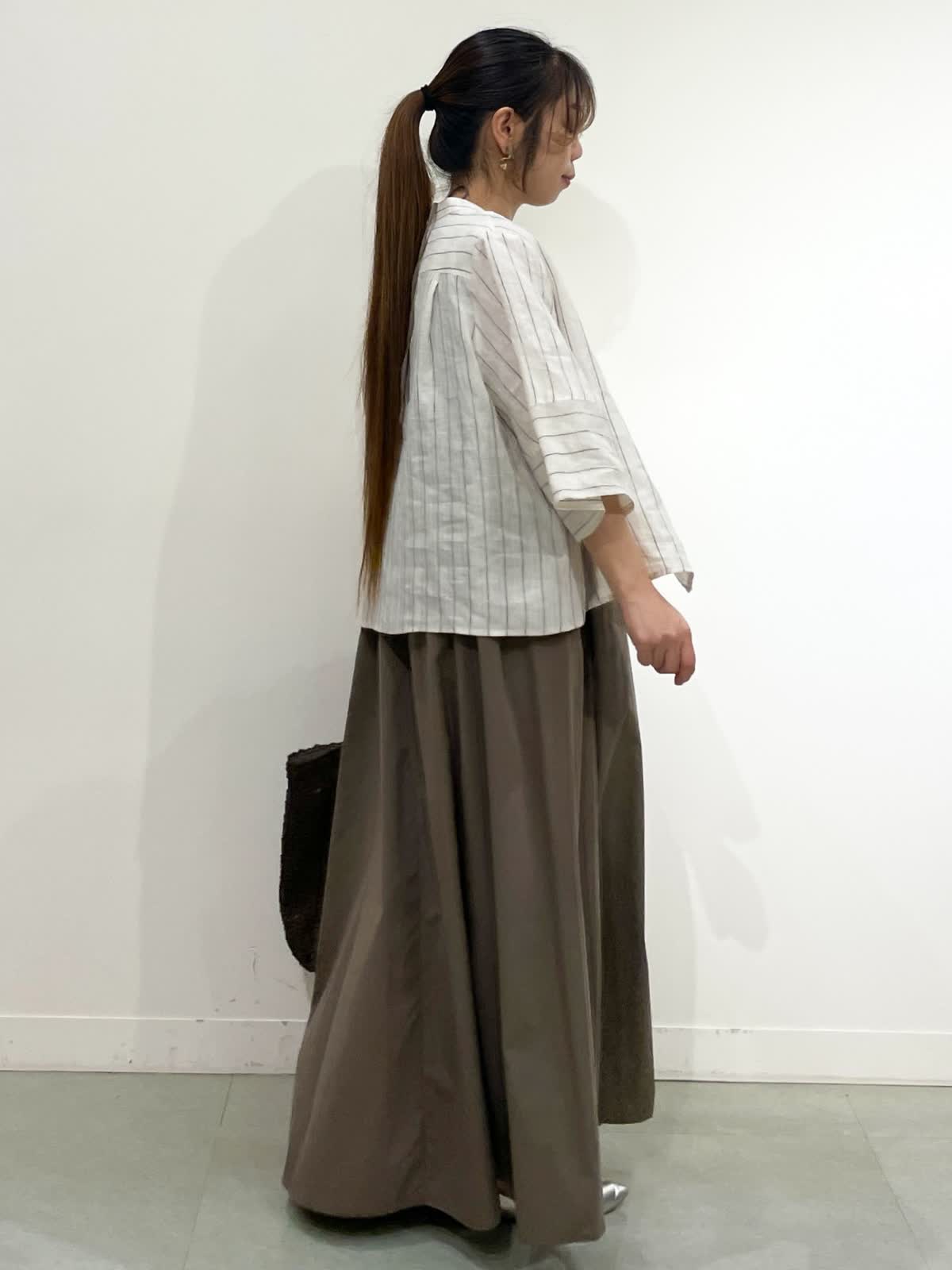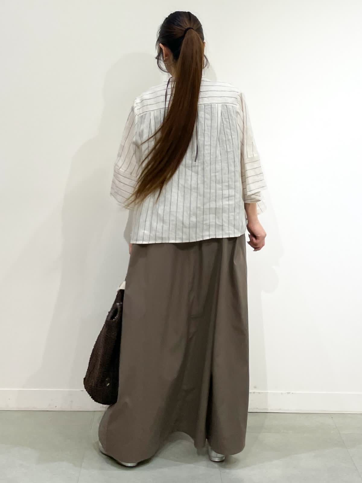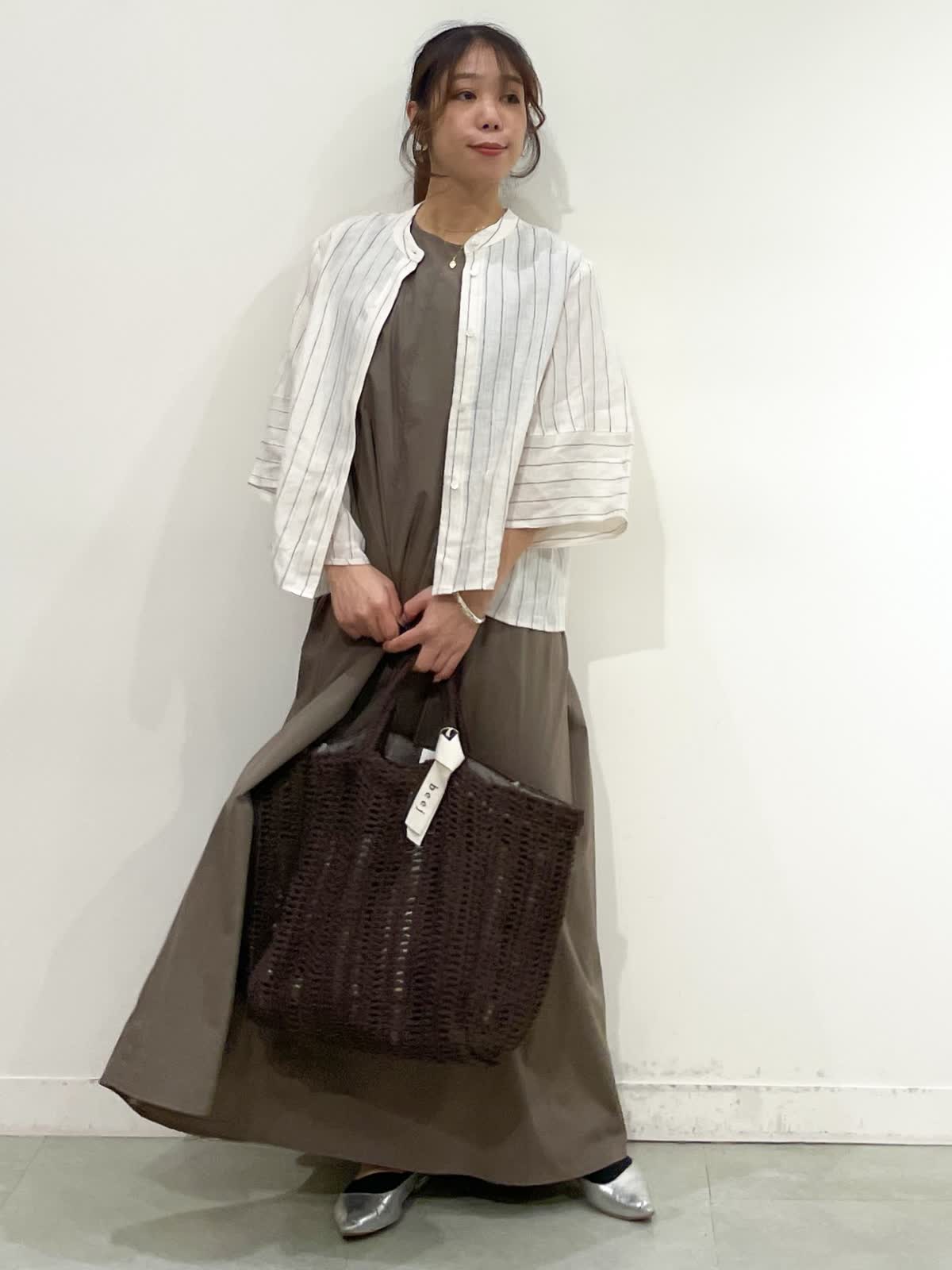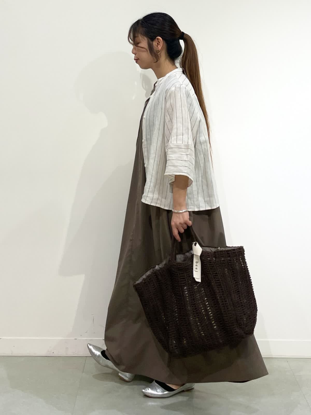 【着用サイズ】シャツ:9号 ワンピース:9号 シャツ:ストライプ/ワンピース:カーキ/バック:チャコールグレー リラックスしてお出かけの時や、足元を変えてBBQなど涼しく快適に過ごせるコーデ。シルエットが可愛い麻シャツ9号着てました。少しルーズな印象したい時ワンサイズアップも良いと感じたサイズ感でした。