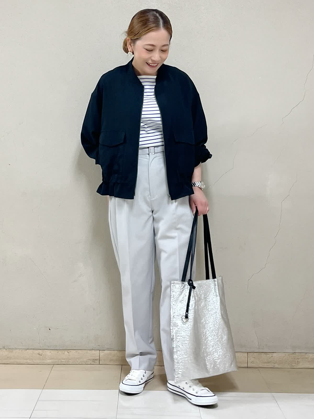 GWのお出かけコーディネートです。軽やかに羽織れるジップブルゾンはリネンライクなさらっとした素材で清涼感たっぷりです。シワになりにくく扱いやすいのも嬉しいポイント。ギャザーの立体感でさっと羽織るだけでサマになる一枚です。インナーは細ボーダーのカットソーで程良くカジュアルにしてみました。パンツは深めタックのテーパードシルエットで腰まわりはゆったりしつつすっきりきれいに見せてくれます。ラクに着られて、ちゃんときれい。連休のお出かけにちょうどいいスタイリングです。