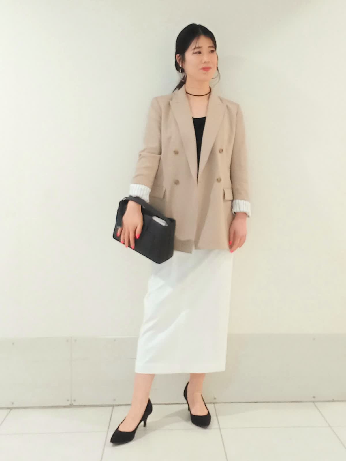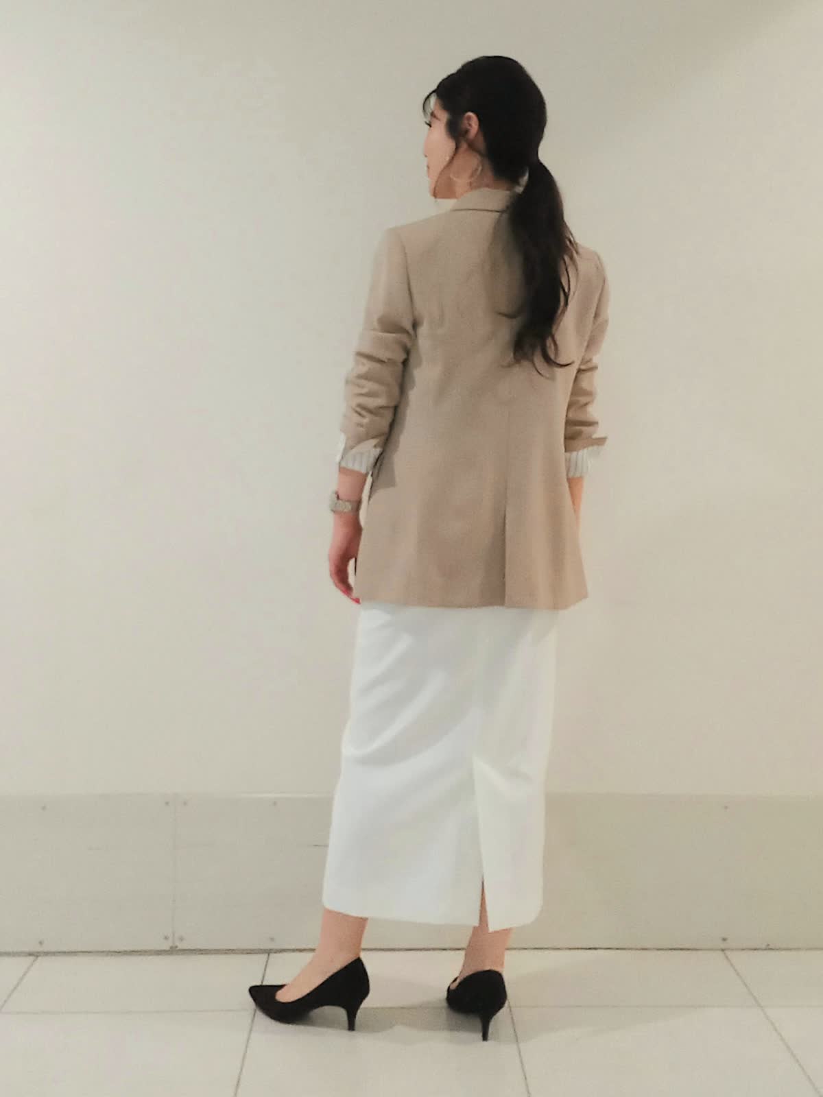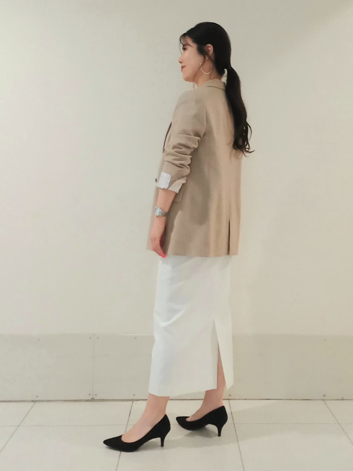 【着用サイズ、ジャケット9号、スカート9号】 柔らかいカラーのジャケットにIラインのタイトスカートを合わせきちんとしているのに抜け感のあるエレガントなお仕事スタイルに。 ジャケットの袖をロールアップし裏地のストライプが見えることで軽やかさが生まれ大人のこなれ感を演出してくれます。 ジャケットは表面がなめらかで程よいハリがあるのが特徴です。 長時間座るオフィスワークや移動の多い休日でも常にパリッとした状態でいられるので大人のコーディネートにおいて清潔感と高級感に繋がります。 ケアしやすかったり型崩れしにくかったりするので長く活躍します。オンオフ兼用の強い味方です!