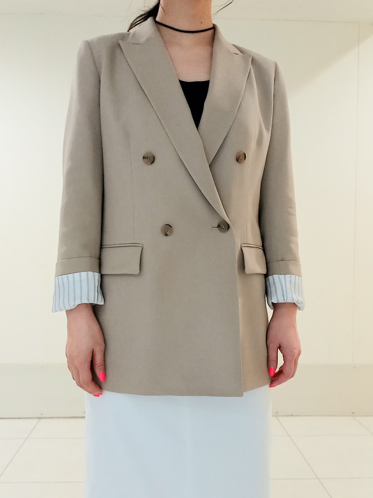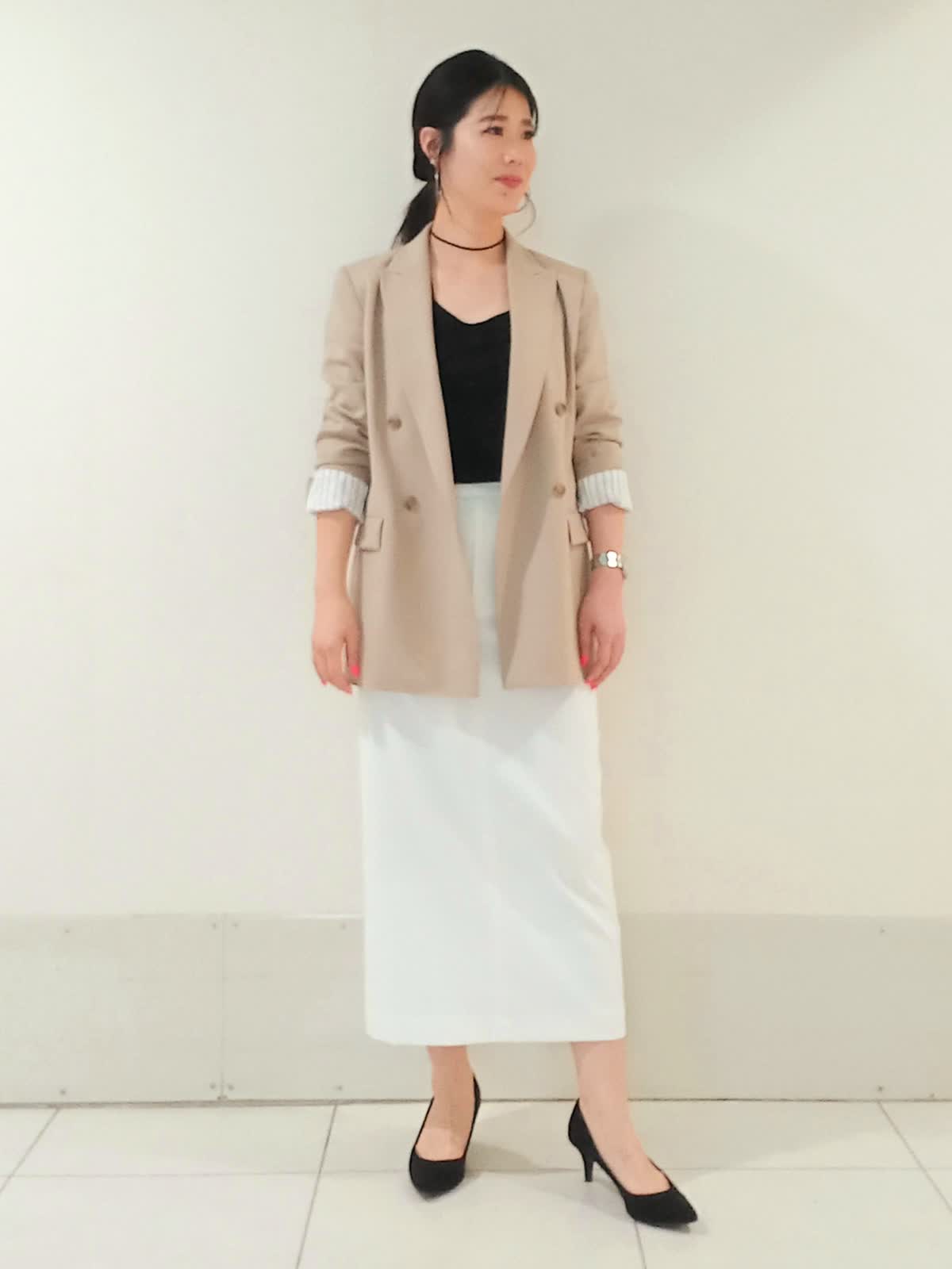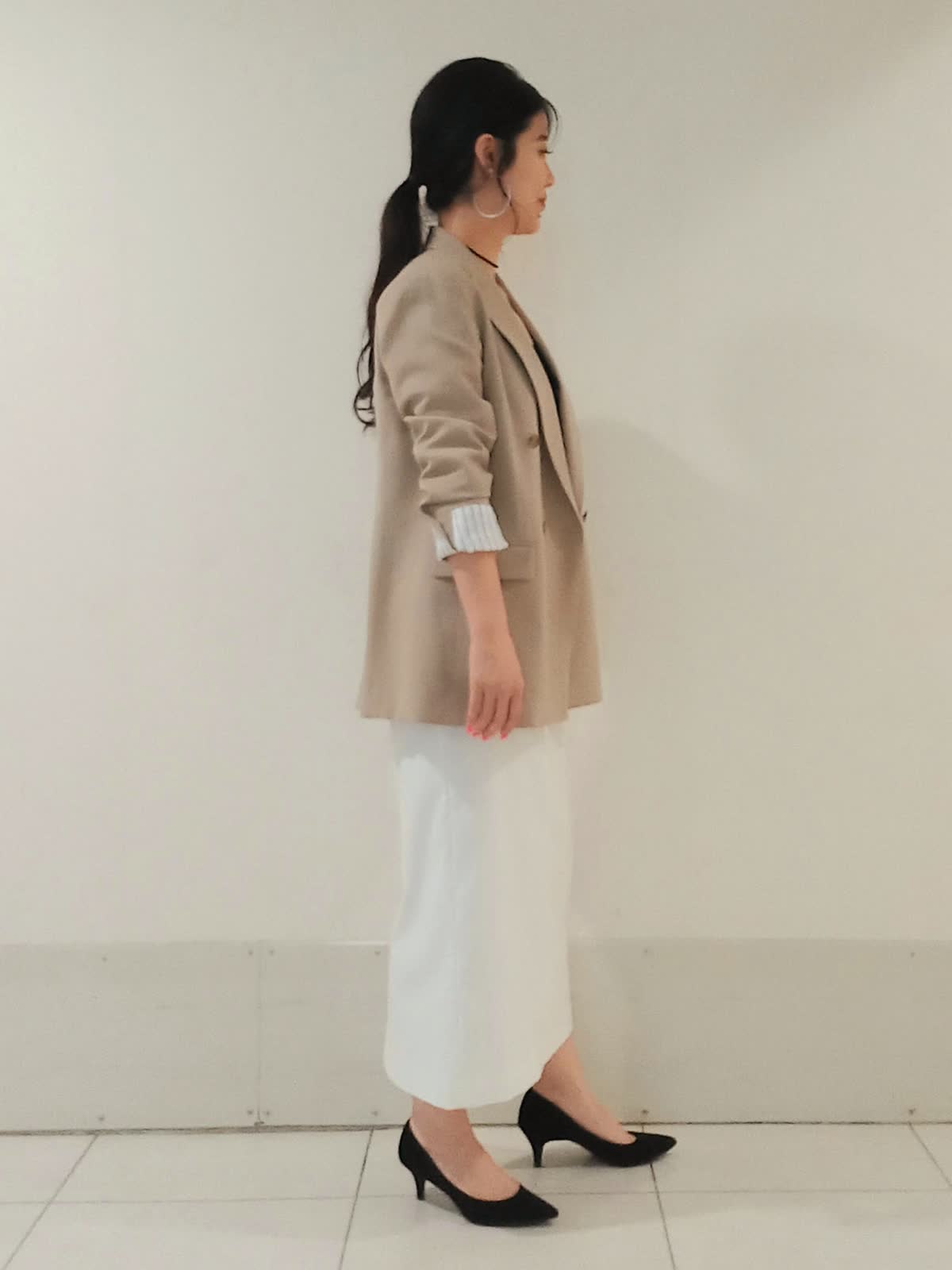【着用サイズ、ジャケット9号、スカート9号】 柔らかいカラーのジャケットにIラインのタイトスカートを合わせきちんとしているのに抜け感のあるエレガントなお仕事スタイルに。 ジャケットの袖をロールアップし裏地のストライプが見えることで軽やかさが生まれ大人のこなれ感を演出してくれます。 ジャケットは表面がなめらかで程よいハリがあるのが特徴です。 長時間座るオフィスワークや移動の多い休日でも常にパリッとした状態でいられるので大人のコーディネートにおいて清潔感と高級感に繋がります。 ケアしやすかったり型崩れしにくかったりするので長く活躍します。オンオフ兼用の強い味方です!