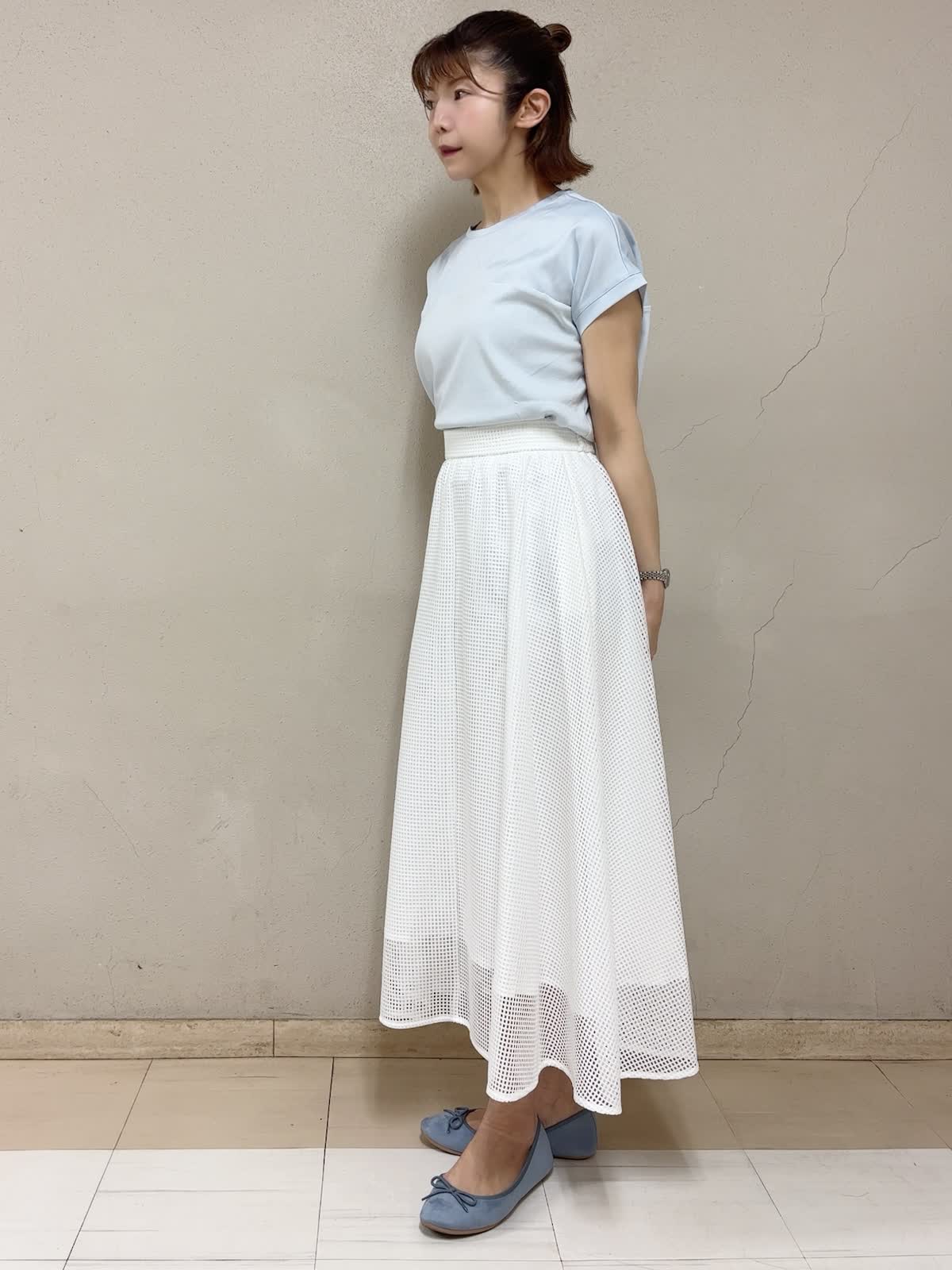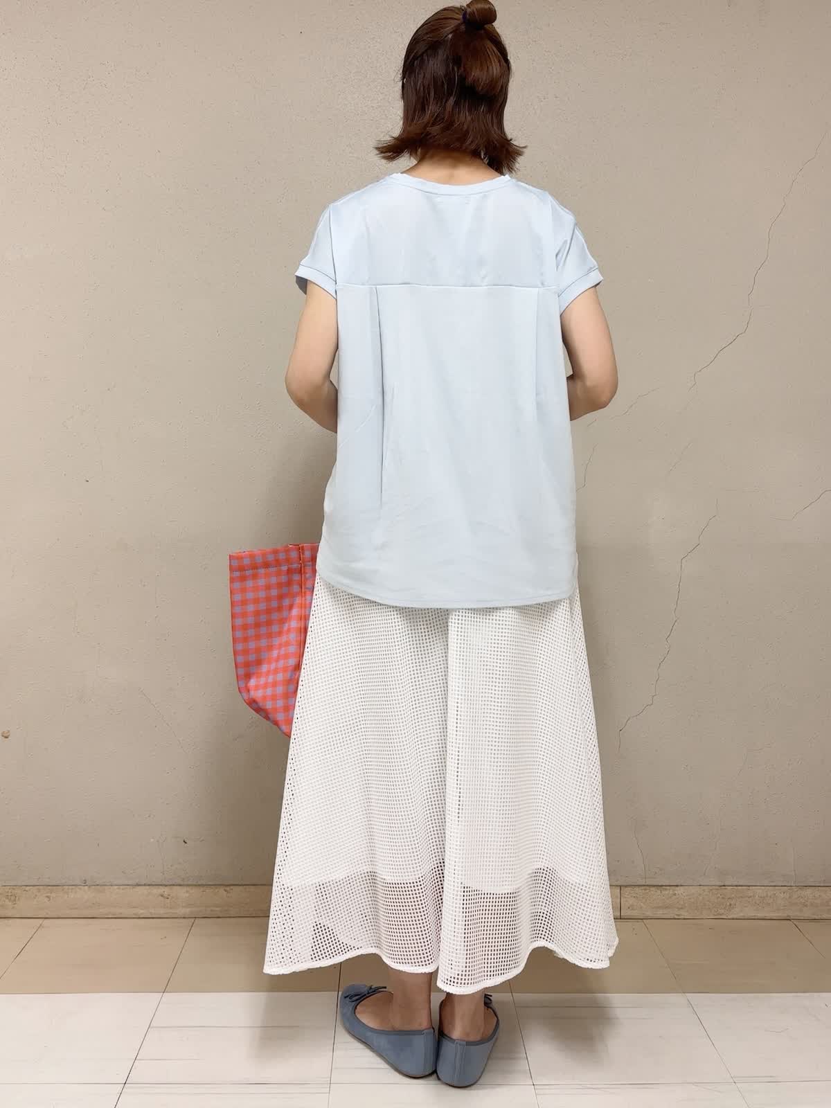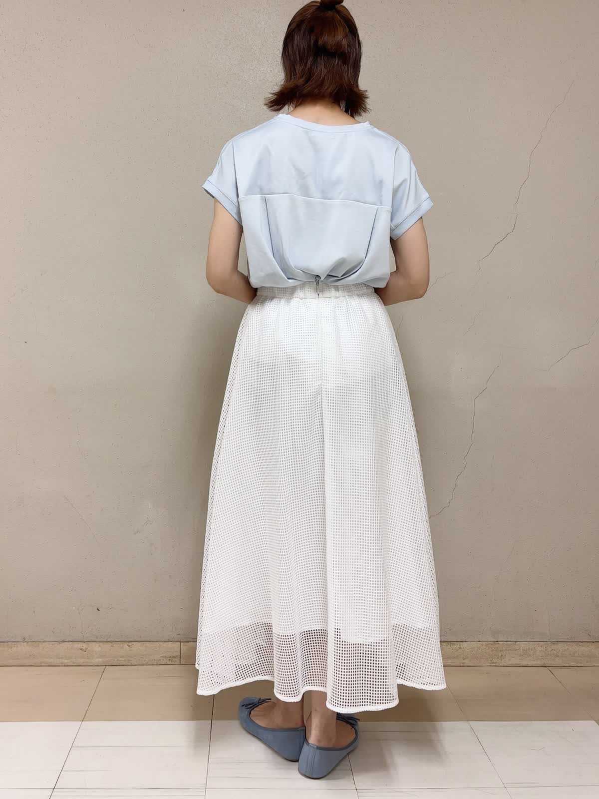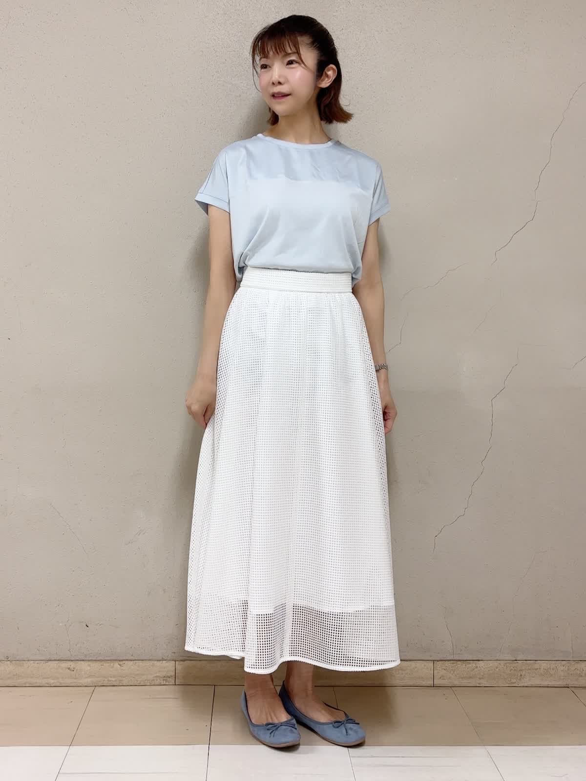 【着用サイズ】サテン切替カットソー:フリー フレアスカート:フリー 【着用カラー】サテン切替カットソー:サックス スカート:ホワイト デイリースタイル 定番のサテン切替のカラーが今年も綺麗です。洗い替えに何枚も揃えたいアイテムです。