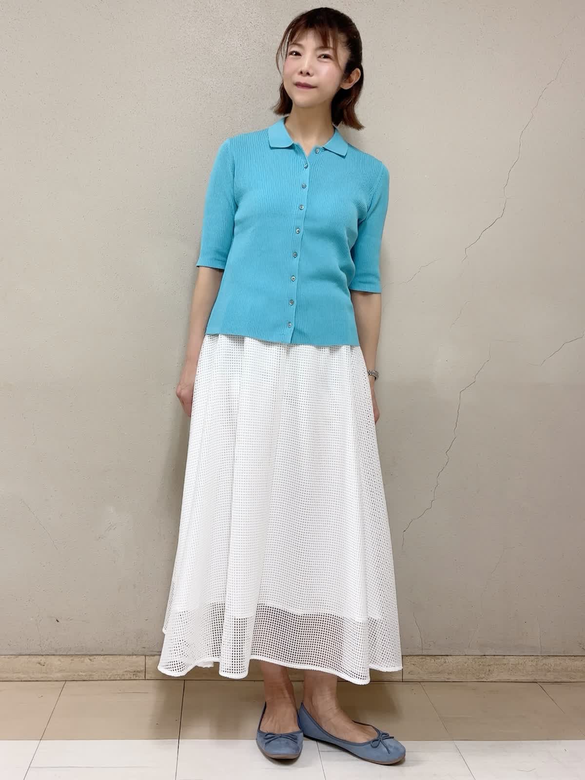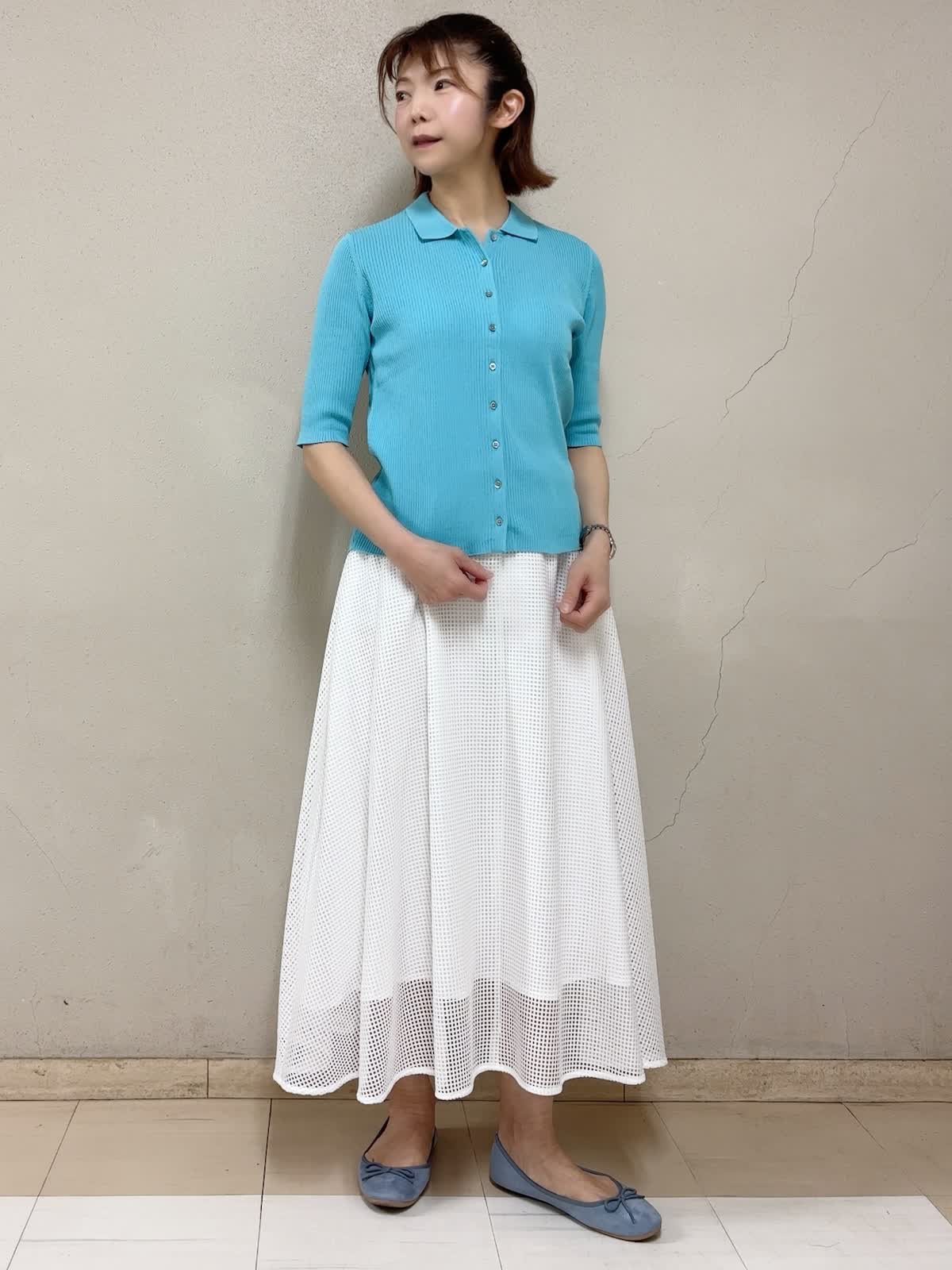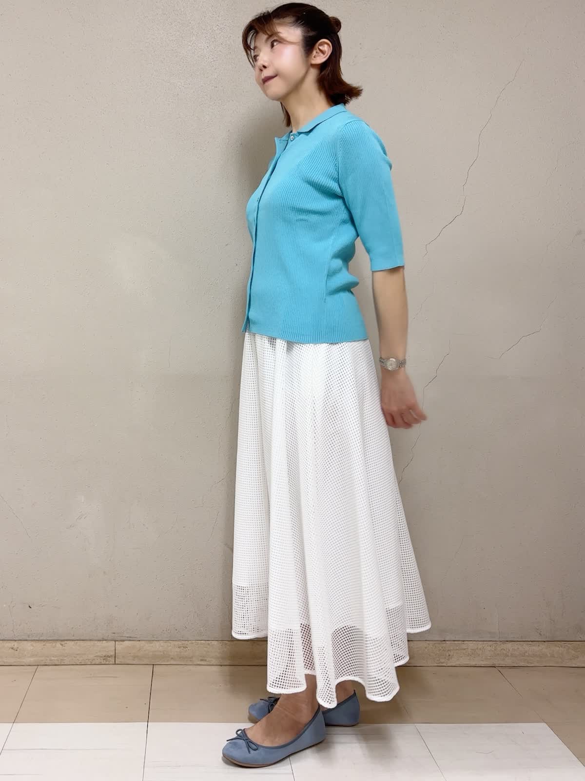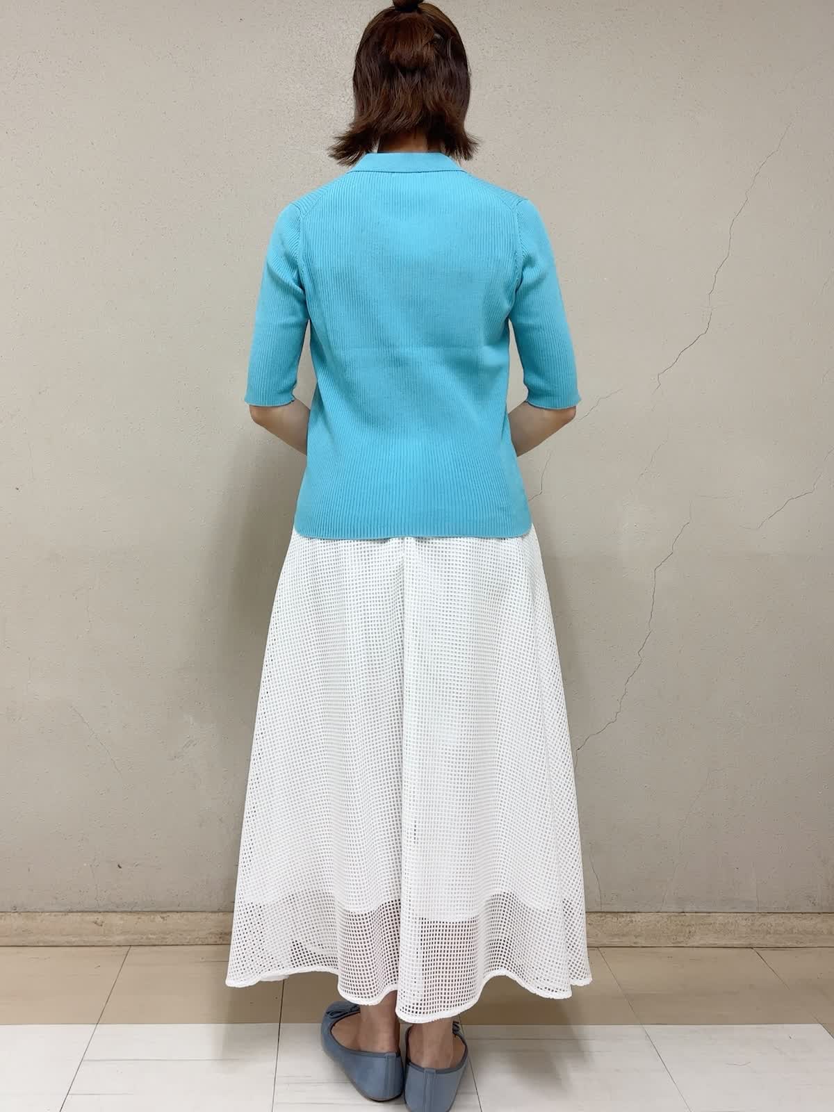 【着用サイズ】リブニット:9号 スカート:フリー 【着用カラー】リブニット:ブルー スカート:ホワイト デイリースタイル 目の覚める様な綺麗なカラーのニットは、前開きにして羽織るのもいいですね。5分袖丈が気に入ってます。伸びが良くて、意外にもボディラインを拾いません。