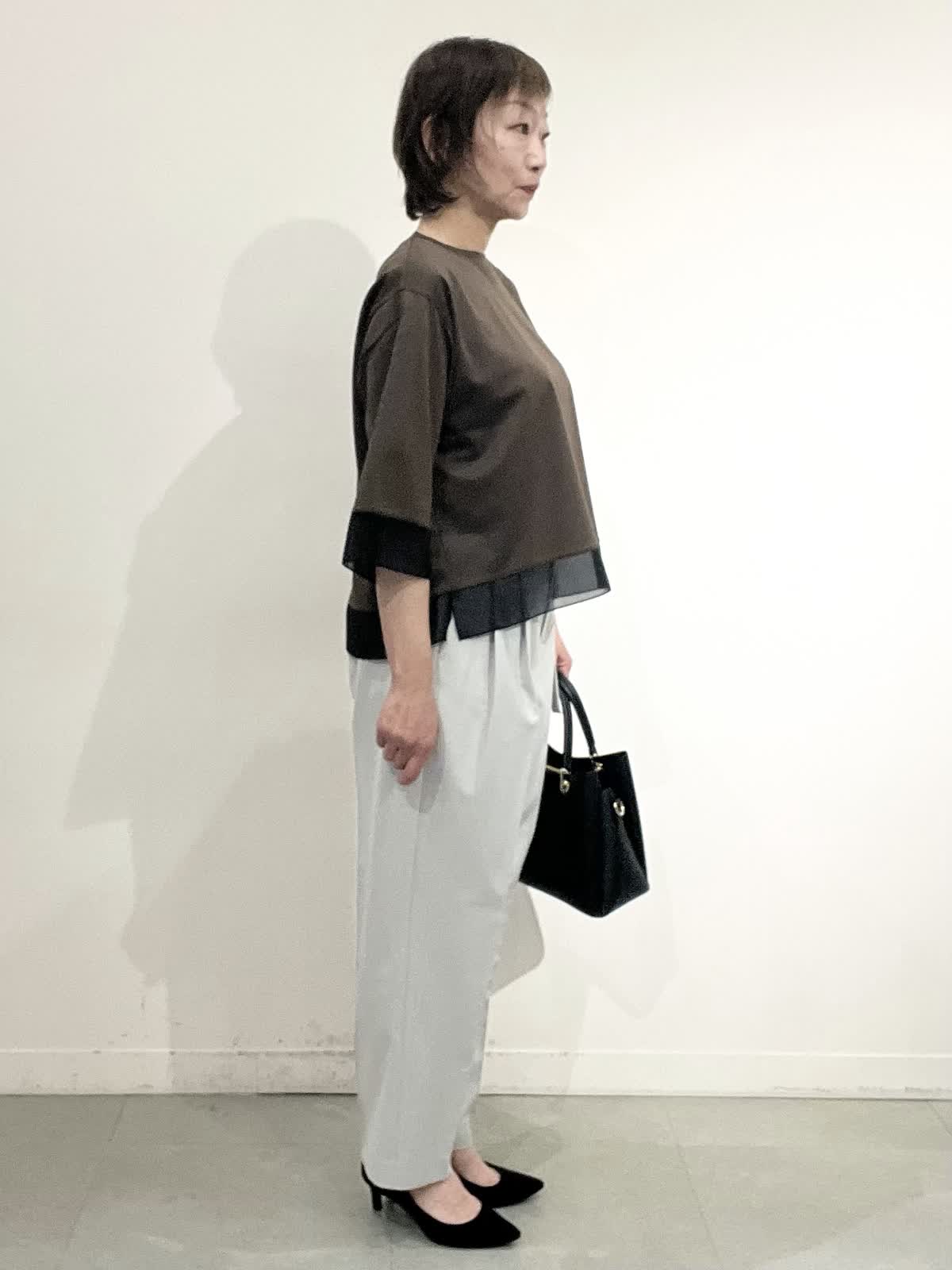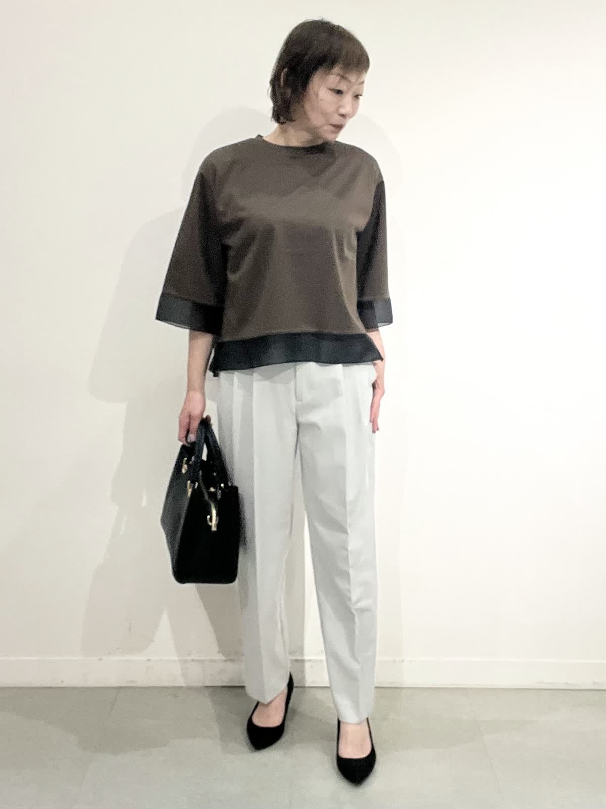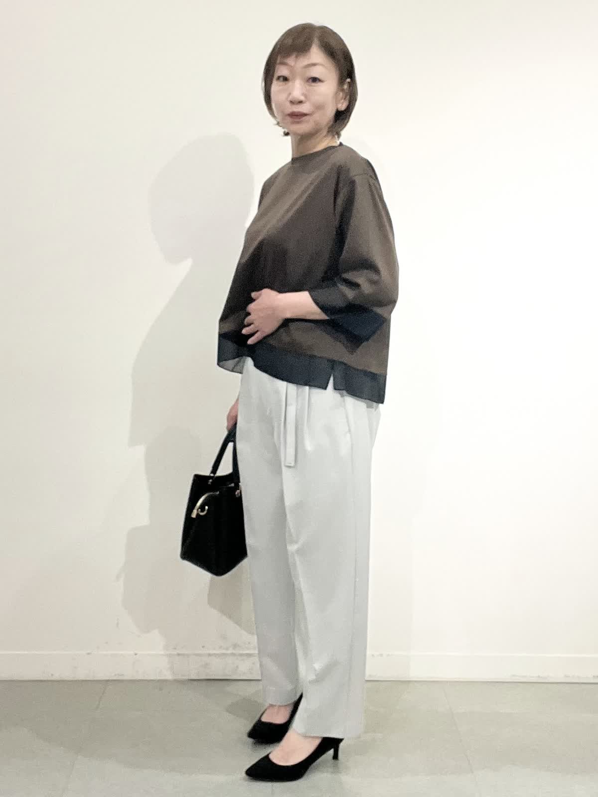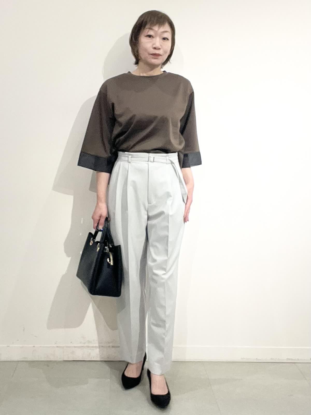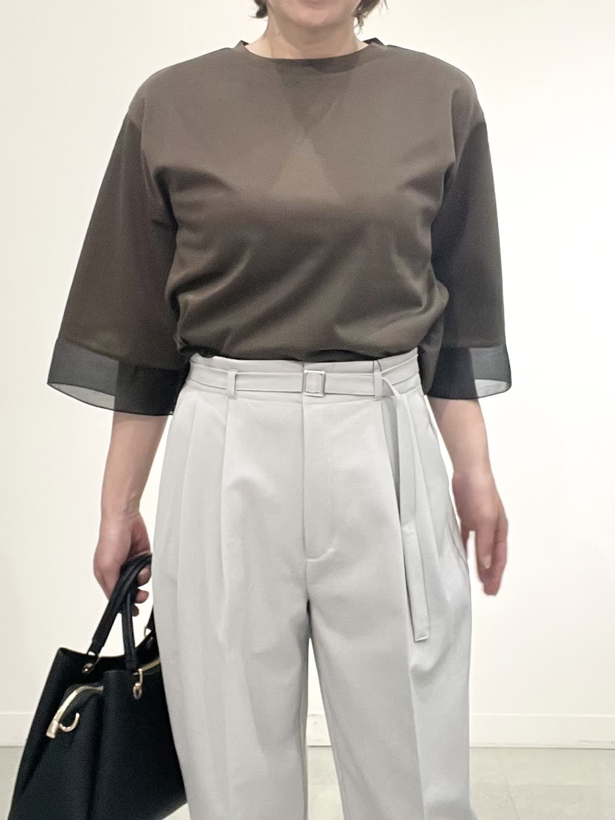 【着用サイズ】全て09 お仕事着コーディネート。 きれいめカットソーは一枚でお仕事着にできるお助けアイテムです。 袖口とすそにシアー入りで、重く見えません。コット100%の夏も快適に着れますね。 パンツはとても軽い素材です。タック入りでピタピタしすぎず、お仕事着向きのきれいめラインです。しわになりにくいのも嬉しいです。 全てご自宅でお洗濯できます。