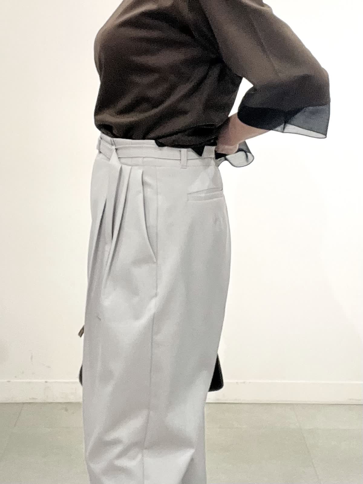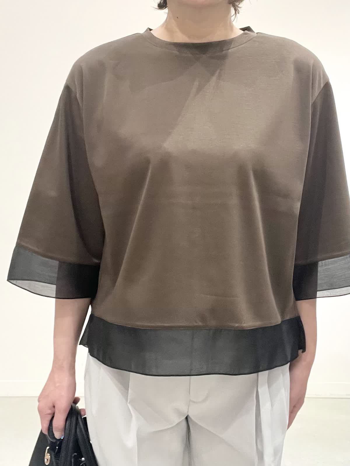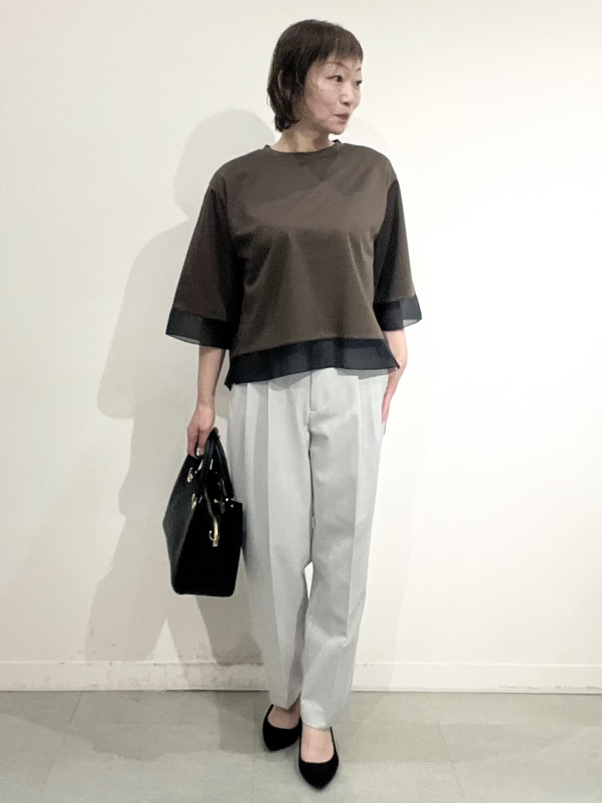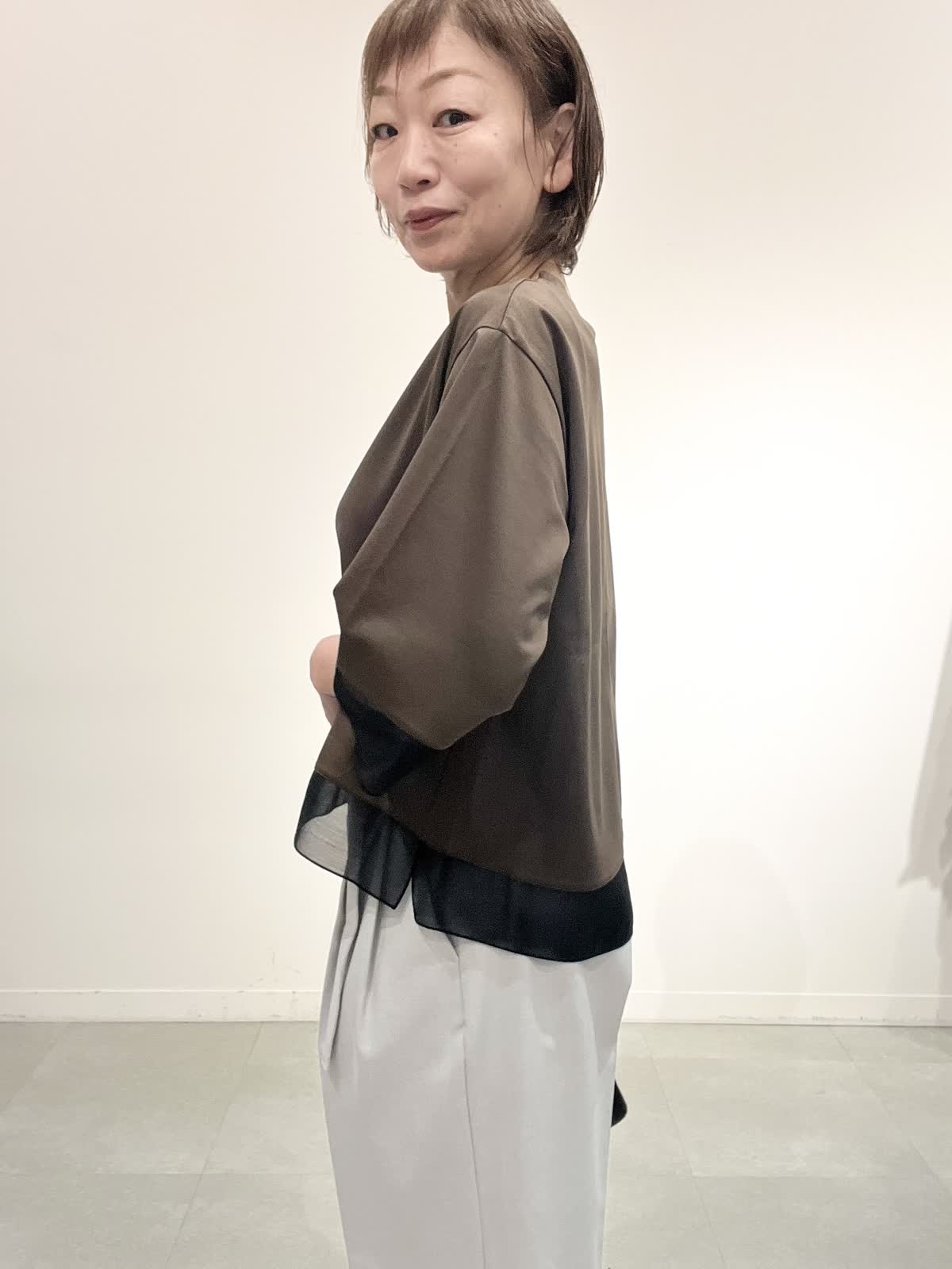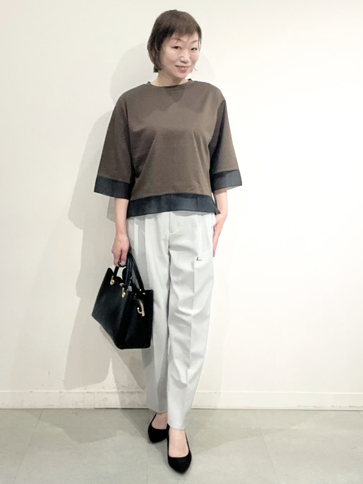 【着用サイズ】全て09 お仕事着コーディネート。 きれいめカットソーは一枚でお仕事着にできるお助けアイテムです。 袖口とすそにシアー入りで、重く見えません。コット100%の夏も快適に着れますね。 パンツはとても軽い素材です。タック入りでピタピタしすぎず、お仕事着向きのきれいめラインです。しわになりにくいのも嬉しいです。 全てご自宅でお洗濯できます。