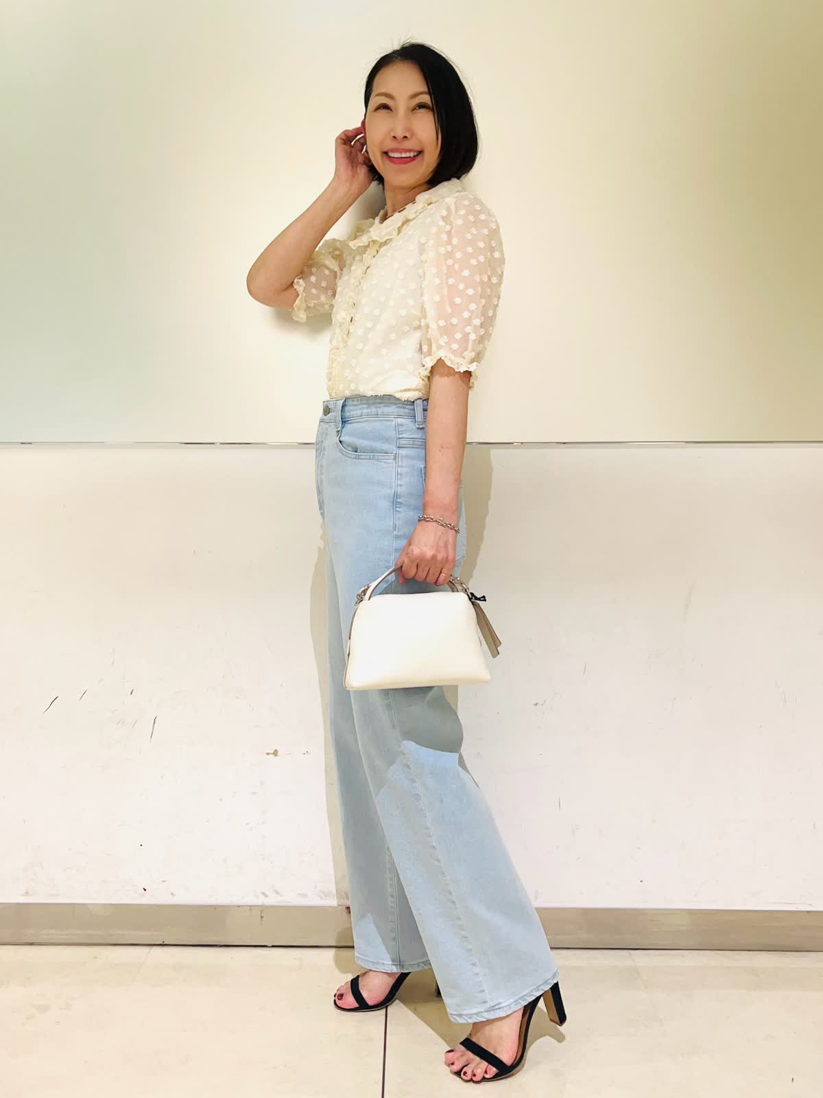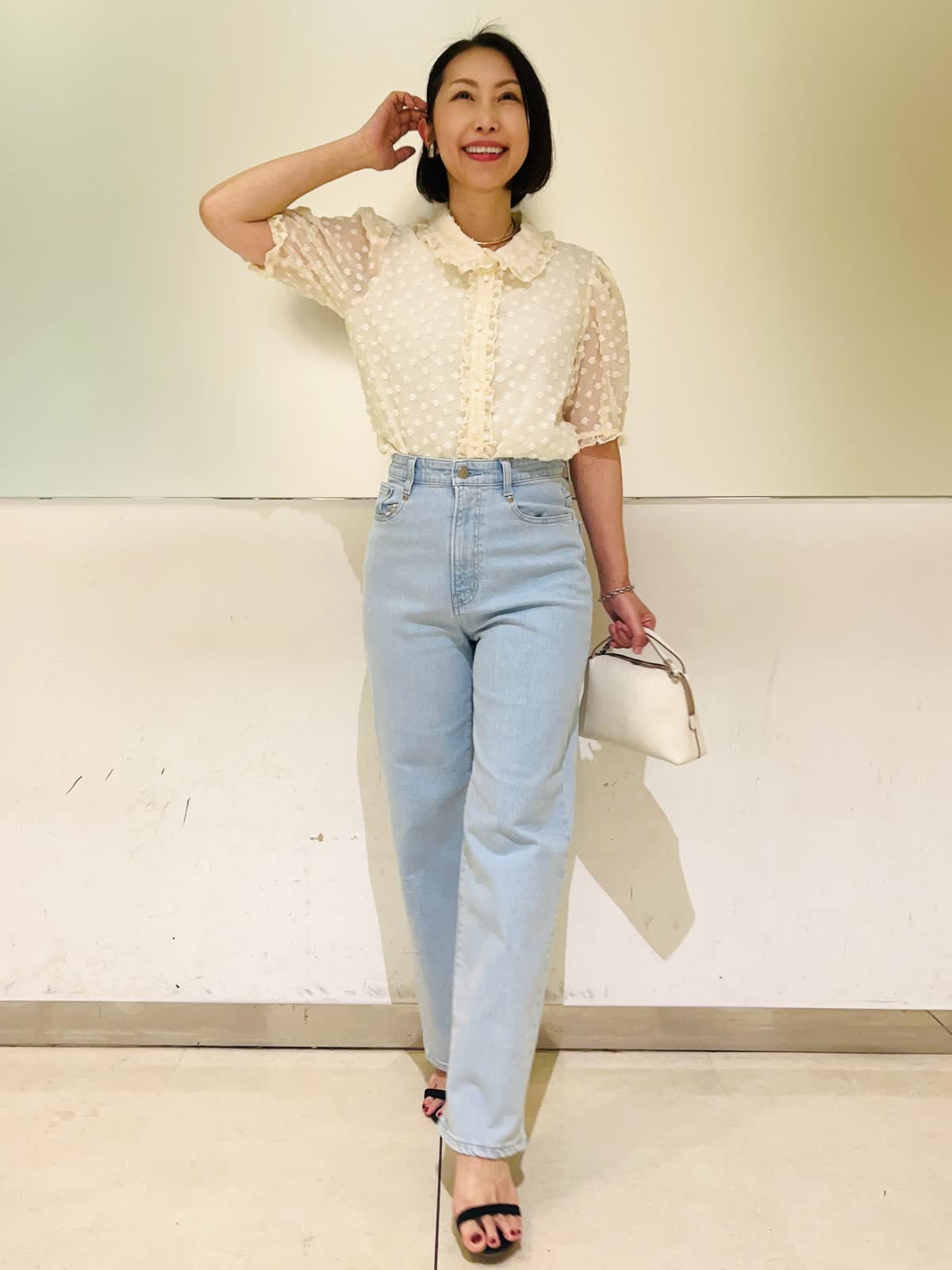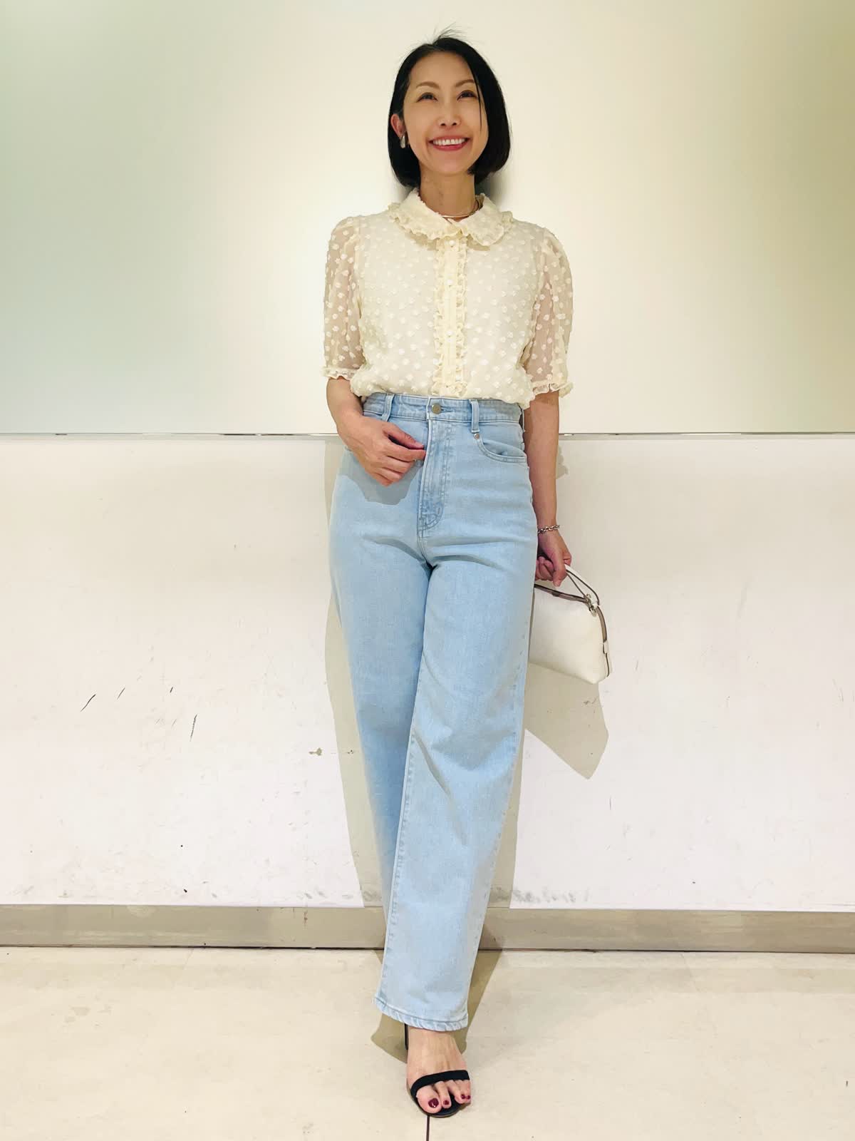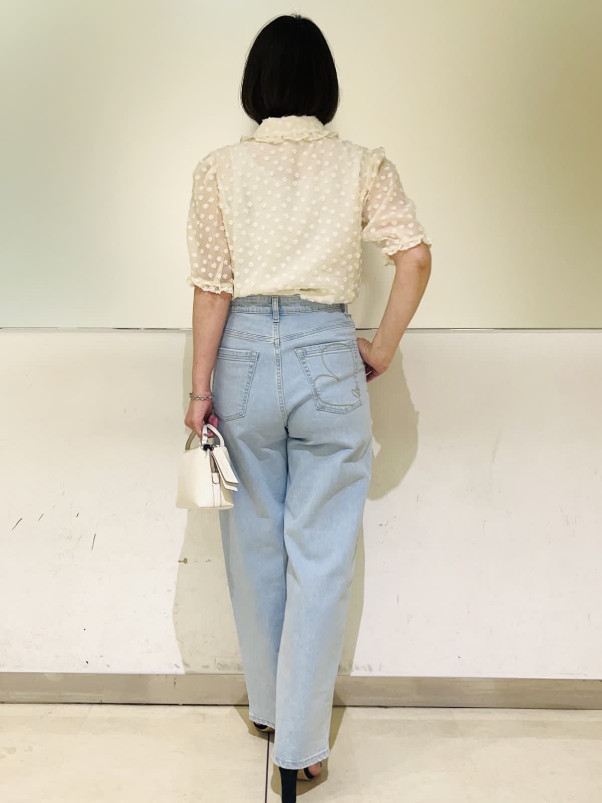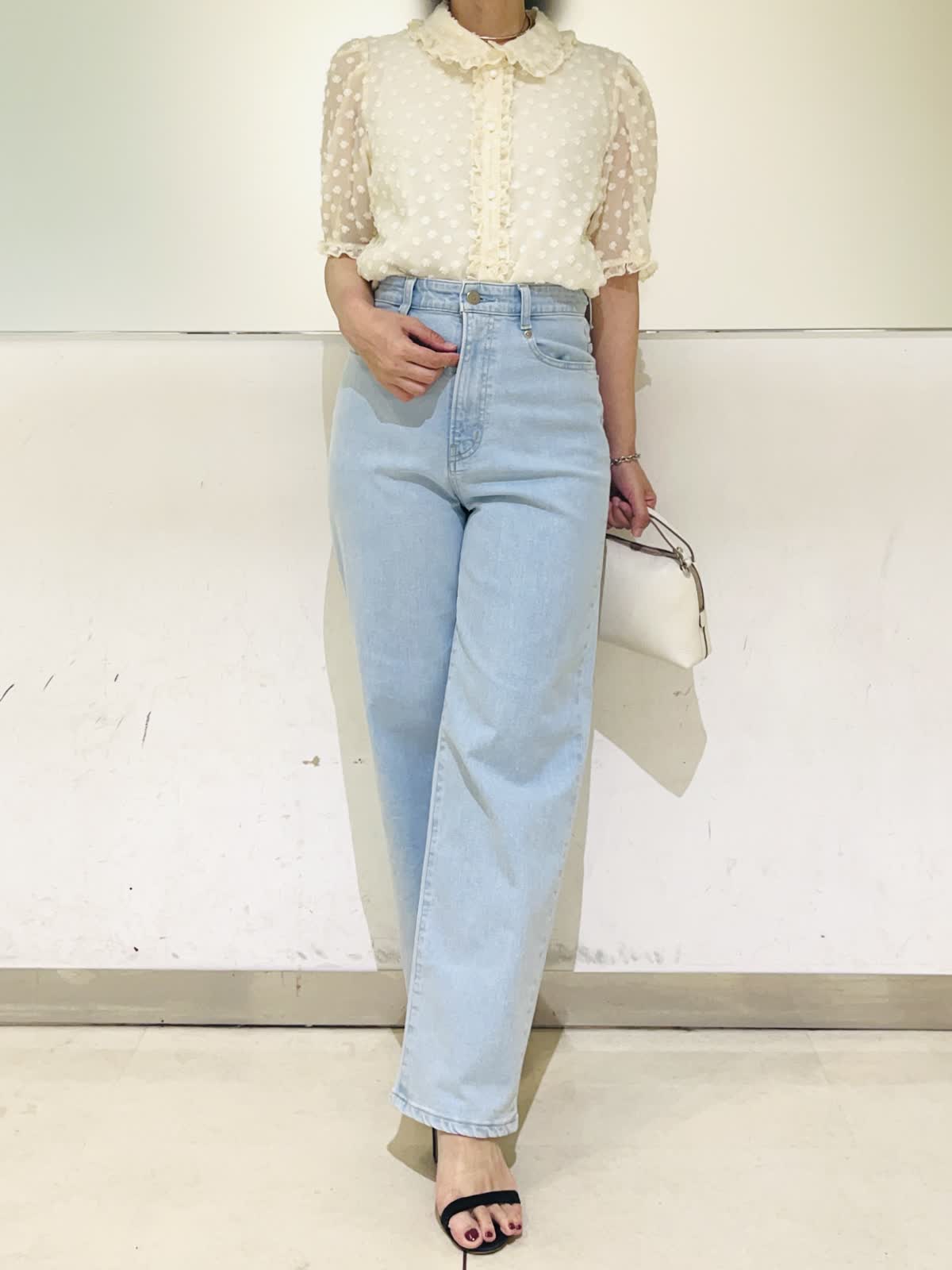 【着用アイテム】すべて9号 【着用カラー】ブラウス:オフホワイト パンツ:サックス 初夏のお出かけコーディネート。GWや女子会ランチなどお出かけが増える時期、頑張り過ぎないけどちゃんと可愛いスタイリング。シアー感とドットが可愛いブラウス。華やかなで写真映えもばっちりです。サックスカラーの明るいデニムはストレッチも効いていて 履き心地抜群!ヒップポケットのハートの刺繍がさりげない可愛さを演出しています。