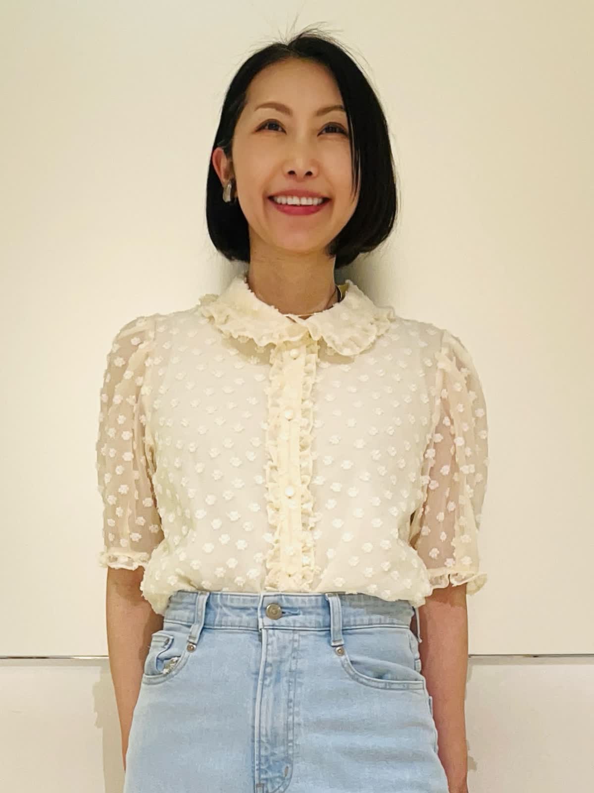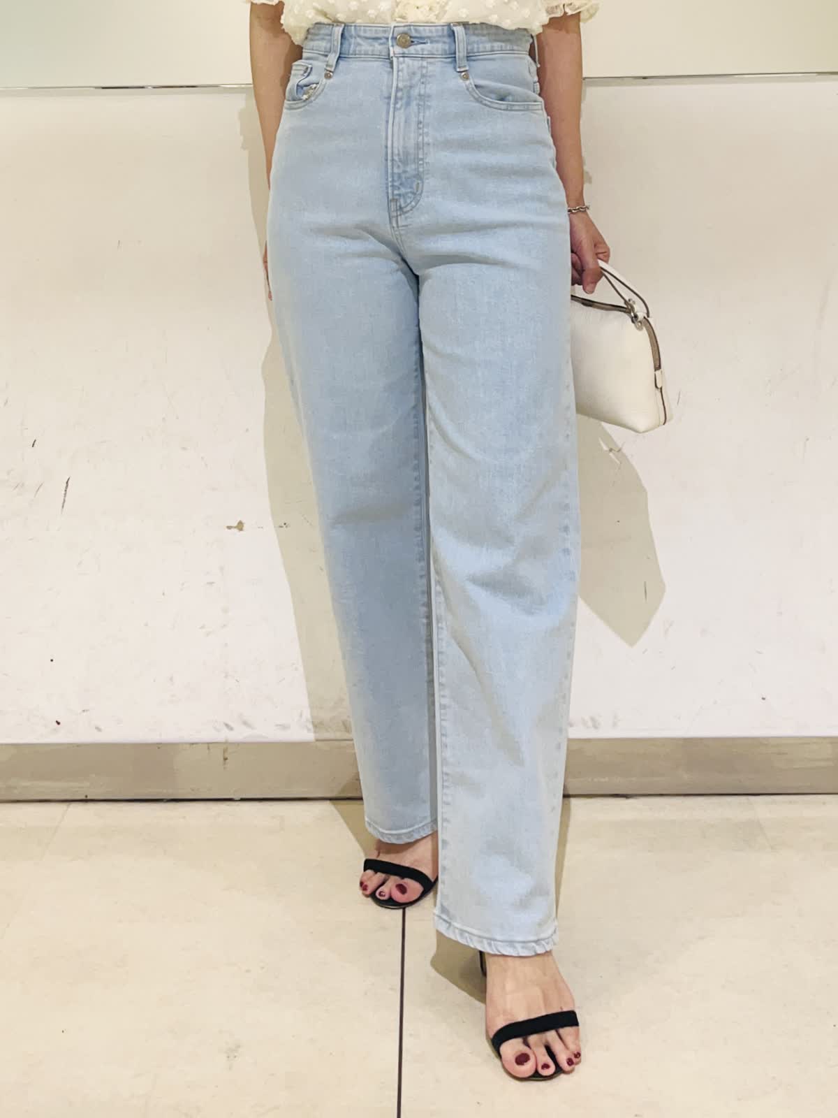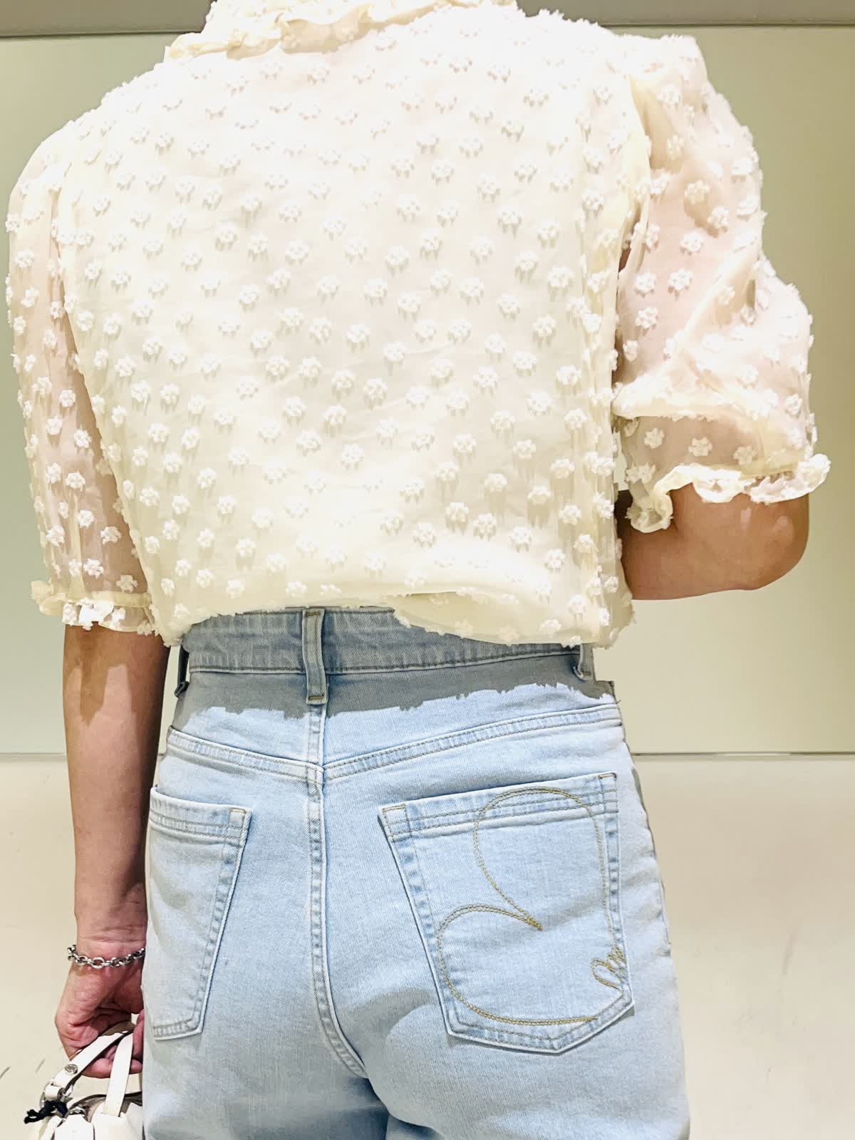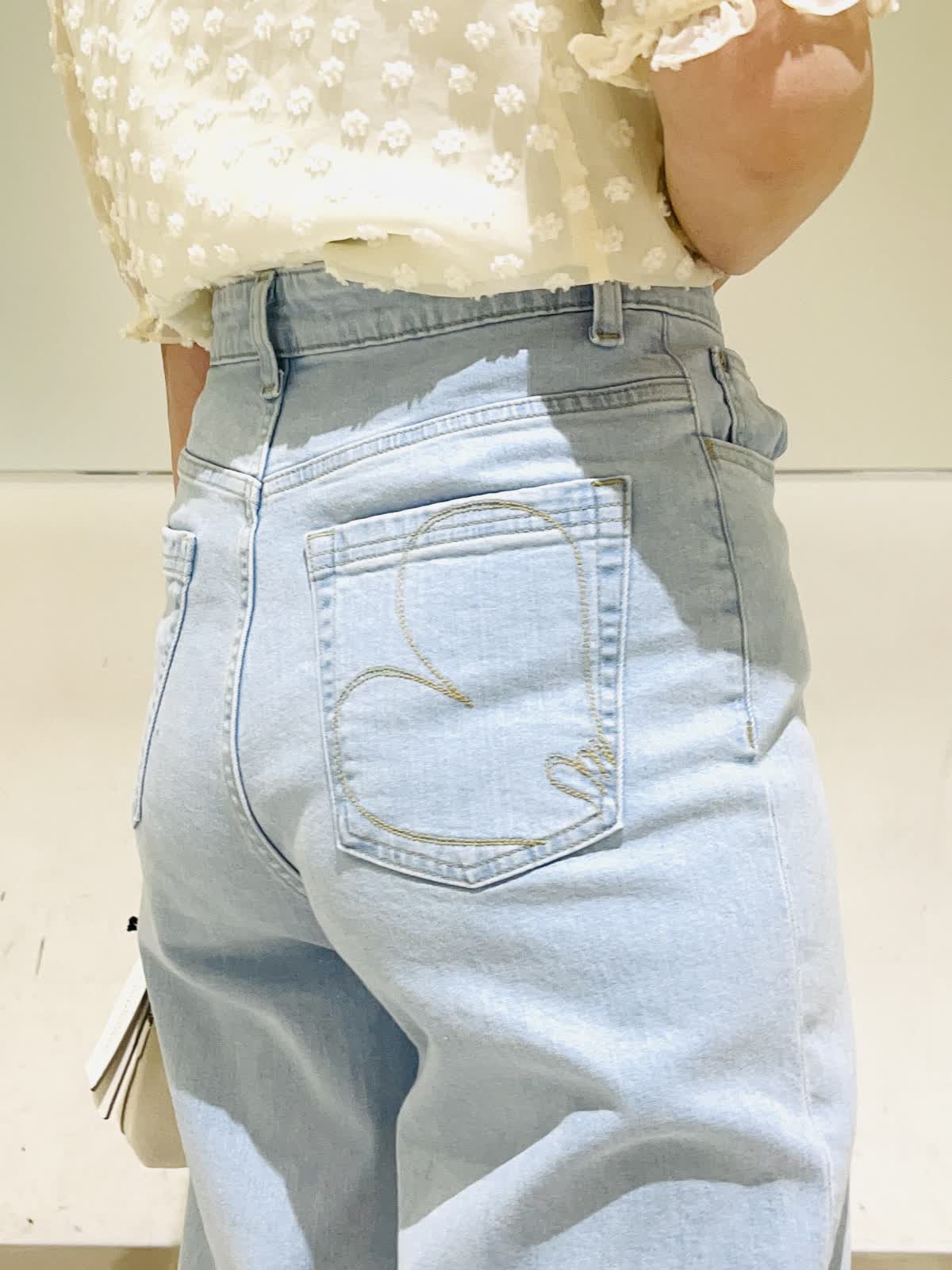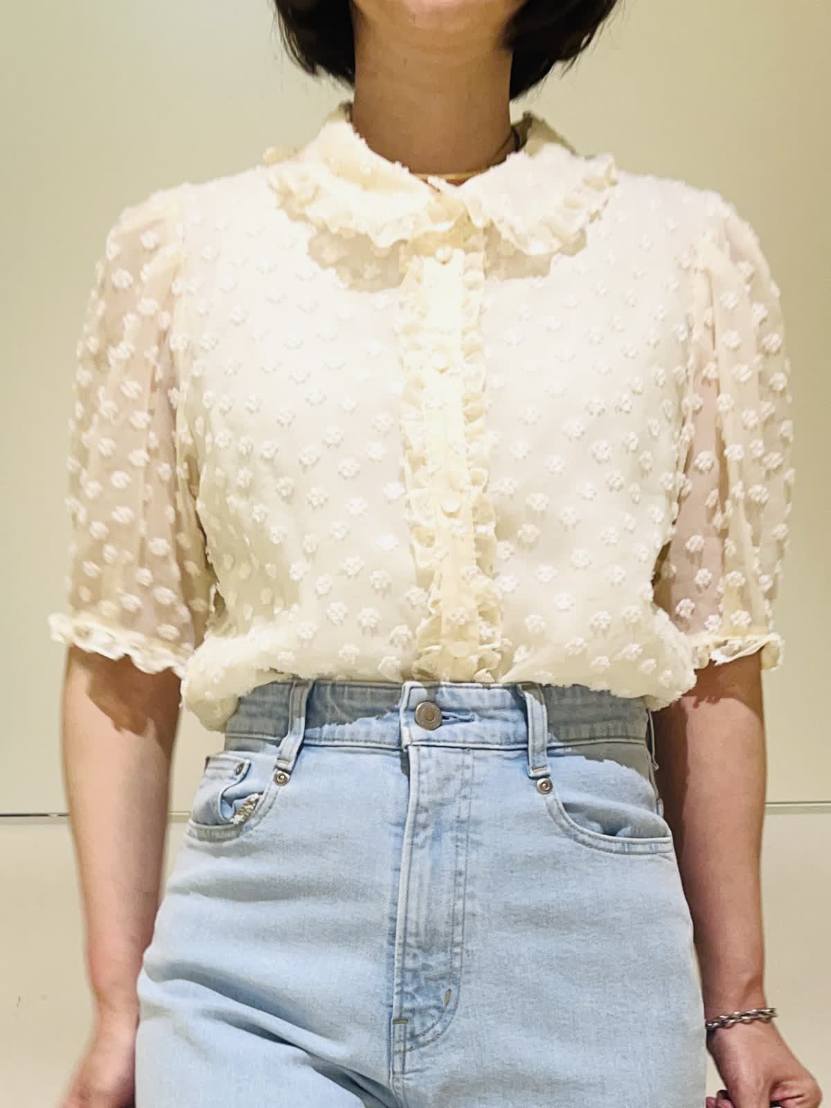 【着用アイテム】すべて9号 【着用カラー】ブラウス:オフホワイト パンツ:サックス 初夏のお出かけコーディネート。GWや女子会ランチなどお出かけが増える時期、頑張り過ぎないけどちゃんと可愛いスタイリング。シアー感とドットが可愛いブラウス。華やかなで写真映えもばっちりです。サックスカラーの明るいデニムはストレッチも効いていて 履き心地抜群!ヒップポケットのハートの刺繍がさりげない可愛さを演出しています。